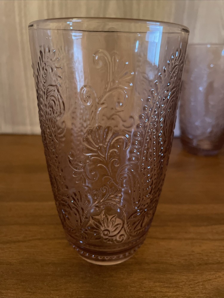 Glasses will ship in original manufacturer carton, then boxed within an outer box for extra protection in shipping. Elevate your home bar with this exquisite set of four Fitz and Floyd Maddi highball glasses. The glasses are adorned with a beautiful paisley pattern in a stunning purple color, adding a touch of sophistication to any occasion. These 15-ounce glasses are perfect for all occasions and are made of high-quality glass material. The set includes four glasses, each with a decorated feature, making it an ideal choice for a service of four. Whether you're hosting a party or enjoying a drink alone, these glasses are a must-have addition to your glassware collection.