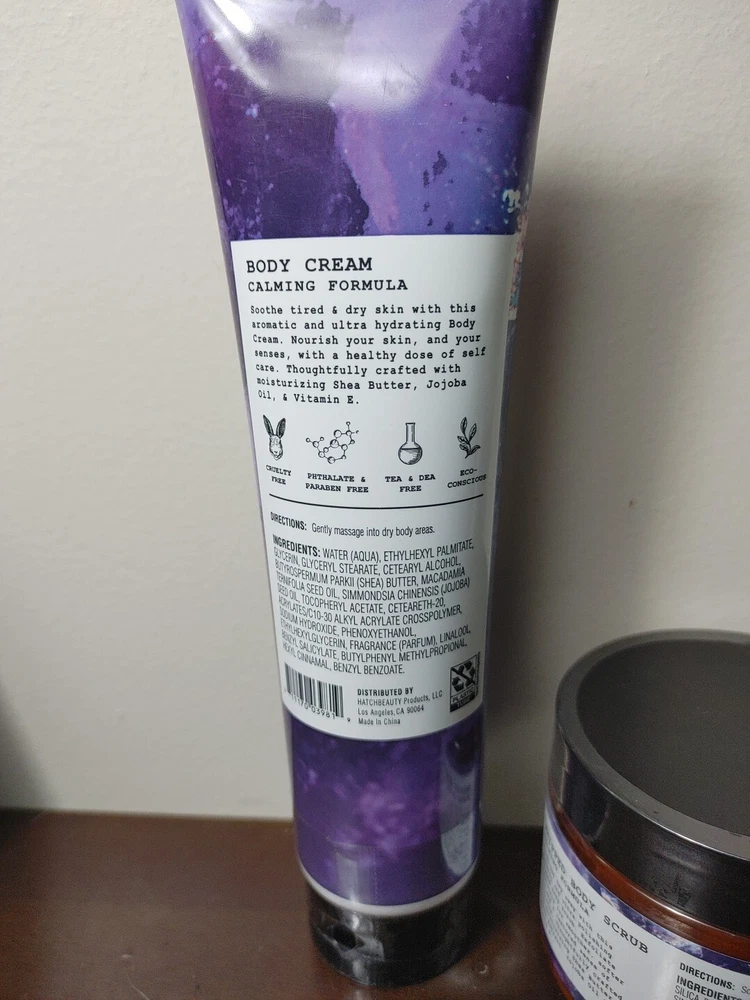 Type:Daily UseSkin Type:All Skin TypesSet Includes:Daily Use, Day Treatment, Night TreatmentFeatures:Animal Cruelty-Free, Contains Vitamins, Hydrating, Paraben-Free, Phthalate-FreeBody Area:Full BodySize:RegularMain Purpose:Moisturizer, Stress Reliefgtin13:811170039819Volume:11.5 oz each (3)Brand:Five Deep BreathsPeriod After Opening (PAO):12MDepartment:UnisexColor:PurpleCountry/Region of Manufacture:ChinaProduct Line:Five Deep Breaths Body CareScent:Lavender & ChamomileFormulation:CreamIngredients:Aloe Vera, Shea Butter, Jojoba Oil, Vitamin E, Lavender & ChamomileUPC:811170039819