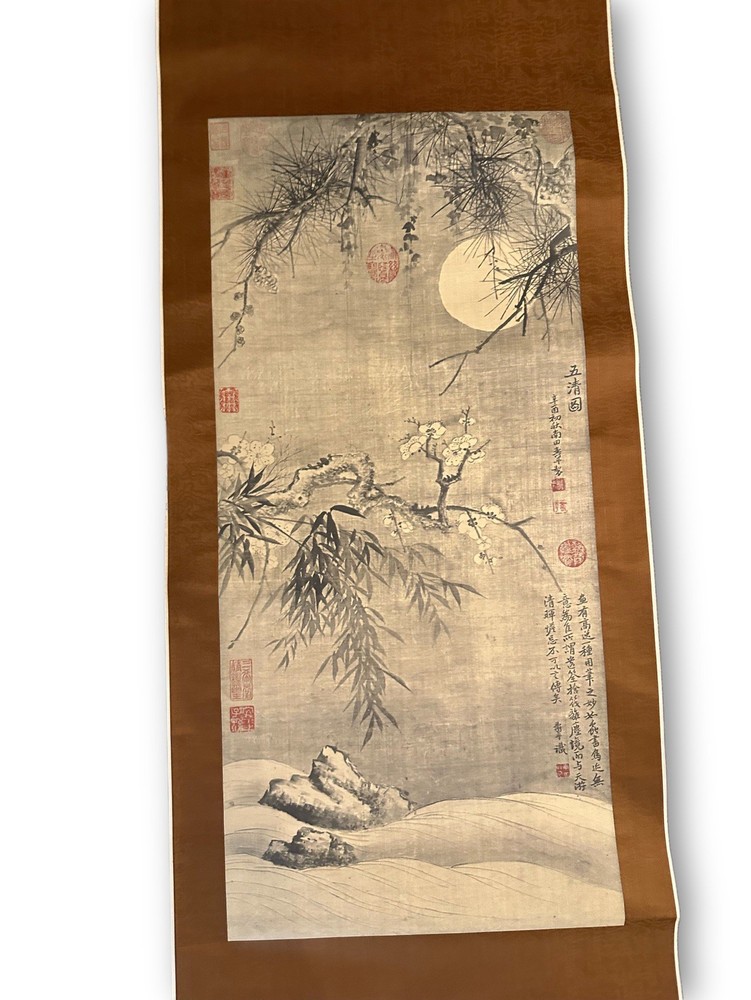 ** small marks on outside of scroll. Was slightly damaged in transport**** ( price is reflected) This hanging scroll, or kakejiku, is a vertical piece of art on silk or paper mounted with decorative borders, intended to be displayed on a wall. The painting depicts a serene, moonlit landscape with the "Five Purities," which are pine, bamboo, plum blossoms, water, and the moon. These elements are significant in Chinese art, symbolizing virtues such as endurance, purity, and the refined sentiments of a scholar-gentleman. The composition is divided into three sections: An old pine tree with a full moon in the upper section. Plum branches and bamboo mingling together in the central area. Rocks and rushing water in the lower section. The artwork features seals, which are common in Chinese painting to indicate the artist, ownership, or a viewer's approval. Key Features Artist (Original Work): Yun Shouping (1633-1690). Theme: The Five Pure Paintings (五清图), also known as the Five Pure Friends. Cultural Significance: The Five Purities symbolize endurance, purity, and friendship. Mounting: Traditional hanging scroll (kakejiku) format with a decorative silk brocade border. This scroll is a beautiful way to appreciate classical East Asian art and can add a sense of tranquility and auspicious energy to a home, meditation space, or tea room. It is a high-quality craft reproduction, not an original hand-painted work.