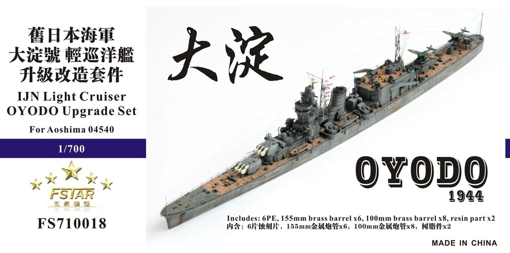 Five Star FS710018 1/700 IJN Light Cruiser OYODO Upgrade Set for Aoshima 04540 PRODUCT DESCRIPTION Resin Parts 2 pcs Metal Parts 14 pcs Photo Etched Parts 6 pcs Attention please: International Buyers Please Note: All taxes, customs duties, import the localgovernment may charge you a fee will be borne by the buyer. (if you're not sure whether you buy products will be charged the import tax, please consult your local government instructions.) If you have any questions, please contact us by email or message. Usually, we use China Post epacket to mail your package. It takes about 7-21 days for Asian countries and 15-30 days for Europe and North America. Other countries in the world please contact us to calculate the freight. Usually, the international postal articles will be a long time. For example, the transaction time, customs,holidays or climate change, these will affect the international mail delivery time, we wish you to understand. Possible incidents, the delivery time will be extended for 5 to 10 days. Thank you for yourpatience and understanding. IF you want faster we can delivery with EMS ( need to add shipping cost) , pls help to contact with us. In some cases, your package stay in your region of the post office for more than 7 days, it will be possible to be returned to us. We strongly recommend that you consult your local post office. The merchandise price and freight all don't include a Insurance.