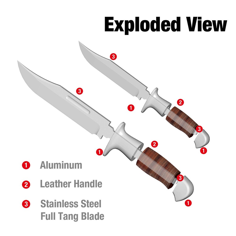 Fixed Blade Bowie Knife, 2-piece Hunting Knife with Leather Handle Featuring Laser Pattern, Sheath Included Knife Dimensions - Large Clip Point Knife Total Length: 10-1/2”; Blade Length: 6”; Weight: 7 oz/200 g; Small Clip Point Knife Total Length: 8”; Blade Length: 4”; Weight: 3 oz/83 g Razor Sharp Blades - Excellent strength, edge retention, and corrosion resistance for lasting durability, good for piercing, detail work, and cutting in tight places Full Tang Structure - Well-made full tang knife features a solid stainless steel blade. Ergonomically styled handle with grooves help prevent slip during use, includes pommel to guard your fingers Handle Grip Design and Sheaths - Cloud-patterned laser handle grips combine practicality and aesthetics. It comes with a nylon sheath for each knife Wide Applicable Occasions - Suitable for various military, hunting, survival, tactical, industrial, and outdoor situations Fixed Blade Bowie Knife, 2-piece Hunting Knife with Leather Handle Featuring Laser Pattern, Sheath Included Classic, multipurpose bowie knives set, a worthy companion to hunters, fishers, and outdoor survivals ( Not suitable for batoning firewood) Product Features Versatile clip point - classic design, delivers excellent cutting properties, and is equipped to handle your chopping, cutting and slicing duties. Ergonomically shaped leather handle - finger grooves designed on the handle to facilitate and make the work of knife more comfortable, widen the range of possible tasks for its application from hunting, fishing and other camping, survival purpose. Improved balance and grip - it is equipped with steel bolster and a pommel, to prevent the knife slipping from your hand and offer perfect balance in hand. Full tang construction - providing greater strength and reliability than folding knives, weighs tough and stable in your hand Item Dimensions Blade surface: satin finish Handle material: leather Blade type: fixed blade Blade shape: clip point /bowie knife blade Blade length: 4" / 6" Handle length: 4" / 4-1/2" Overall length: 8" / 10-1/2" Weight: 7 oz / 3 oz Our service If you have any questions about the products or unsatisfactory over us, contact us without hesitation, we would reply within 24 hours. Shipping We offer FREE shipping on all orders! We ship within Three business days of payment, usually sooner. We use a selection of shipping services such as UPS, FedEx, USPS etc. We only ship to the lower 48 states, no APO/FPO addresses or PO Boxes allowed. Local pickups and combined shipping options are not provided at this time. Return You can return a product for up to 30 days from the date you purchased it. Any product you return must be in the same condition you received it and in the original packaging. Please keep the receipt. Payment We accept payment by any of the following methods: PayPal Please pay as soon as possible after winning an auction, as that will allow us to post your item to you sooner! Feedback Customer satisfaction is very important to us. If you have any problem with your order, please contact us and we will do our best to make you satisfied. Contact Us If you have any queries, please contact us via ebay. We usually respond within 24 hours on weekdays. Please visit our eBay store to check out other items for sale! Thank you for shopping at our store.