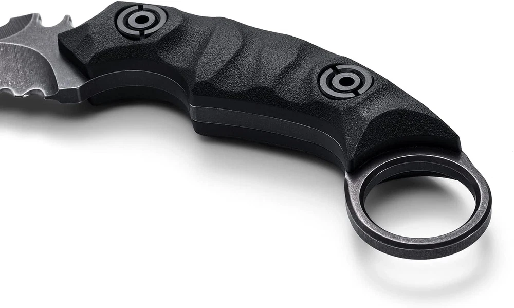 【D2 STEEL STRENGTH AND DURABILITY】 D2 Steel is tried-and-true performance steel. This blade has been tested in various categories: toughness, strength (lateral stress), and edge honing and holding ability. The mesmerizing knife has been masterfully crafted; we Harden ours between 59-61 HRC to achieve peak performance on a tool that is made to last a lifetime. 【EXQUISITE G10 HANDLE】The ergonomic Solid G10 handle provide a durable, sure grip and increase concealability and multi-environment functionality. G10 is temperature resistant, has good abrasion resistance, is anti-slip, moisture-proof, does not expand or contract due to normal temperature and moisture exposure, and is exceptionally rugged. 【PRODUCT PARAMETER】overall length: 7.08", blade length: 2.75", blade thickness: 0.17", handle Length: 4.33", handle thickness: 1.00", hardness: 59-61 HCR, weight: 4.83 oz 【MULTIPLE CARRYING METHODS】This knife has a ring on the handle for easy forward and reverses grip. The high-strength lightweight Kydex material sheath with a universal clip to be horizontal or vertical. You can also use the removable & adjustable spacers on the clip to fit it to any belt size for easy portability. 【AN EXCELLENT GIFTING IDEAL】If you want a unique gift for your loved one who likes outdoor or indoor activity, then our Tactical knife is a perfect choice! To a special friend, gifts For Men, gifts for women! Make this fantastic gift to any seasoned or amateur collector; it will bring a smile to their faces, and they will surely love it. SPECIFICATIONS: Overall Length: 7.08" in (18 cm) Blade Length: 2.75" in (7 cm) Blade Thickness: 0.17" in (0.45 cm) Blade Material: D2 Blade Finish: Stonewashed / Satin Edge Type: Double Edged Handle Length: 4.33" in (11 cm) Handle Material: G10 Handle Color: black / green Handle Thickness: 1.00" in (2.6 cm) Weight: 4.83 oz (137 g) Overall weight: 10.54 oz (299 g) WHAT'S INCLUDED: Knife *1 Kydex Sheath *1 Packing box *1