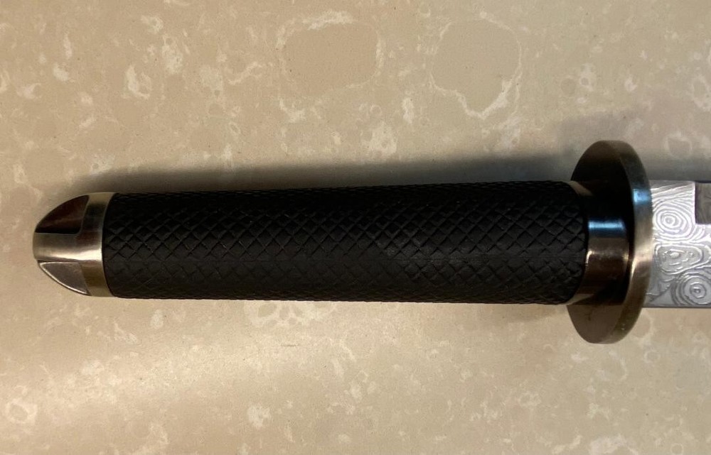 This fixed tanto blade stainless knife is in fantastic condition. The blade has the original edge and appears to have never been used. The etched pattern on the blade is similar to a raindrop Damascus pattern. The handle screws off and is hollow with a steel dowel insert. This is a heavy, well-made knife weighing 1 lb. 5 oz. The belt sheath is in very good condition with a very small amount of rust on the snap. Please see the photos to appreciate the overall nice condition. Thanks for taking a look.