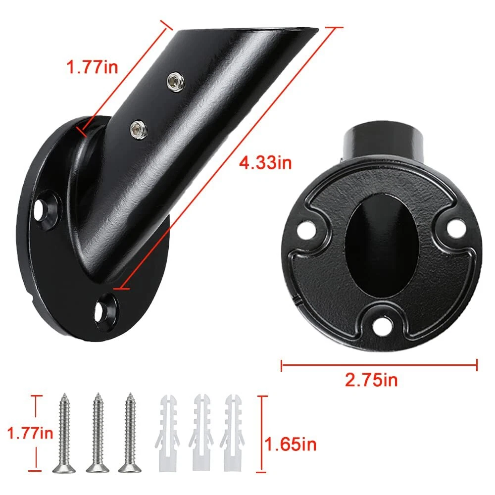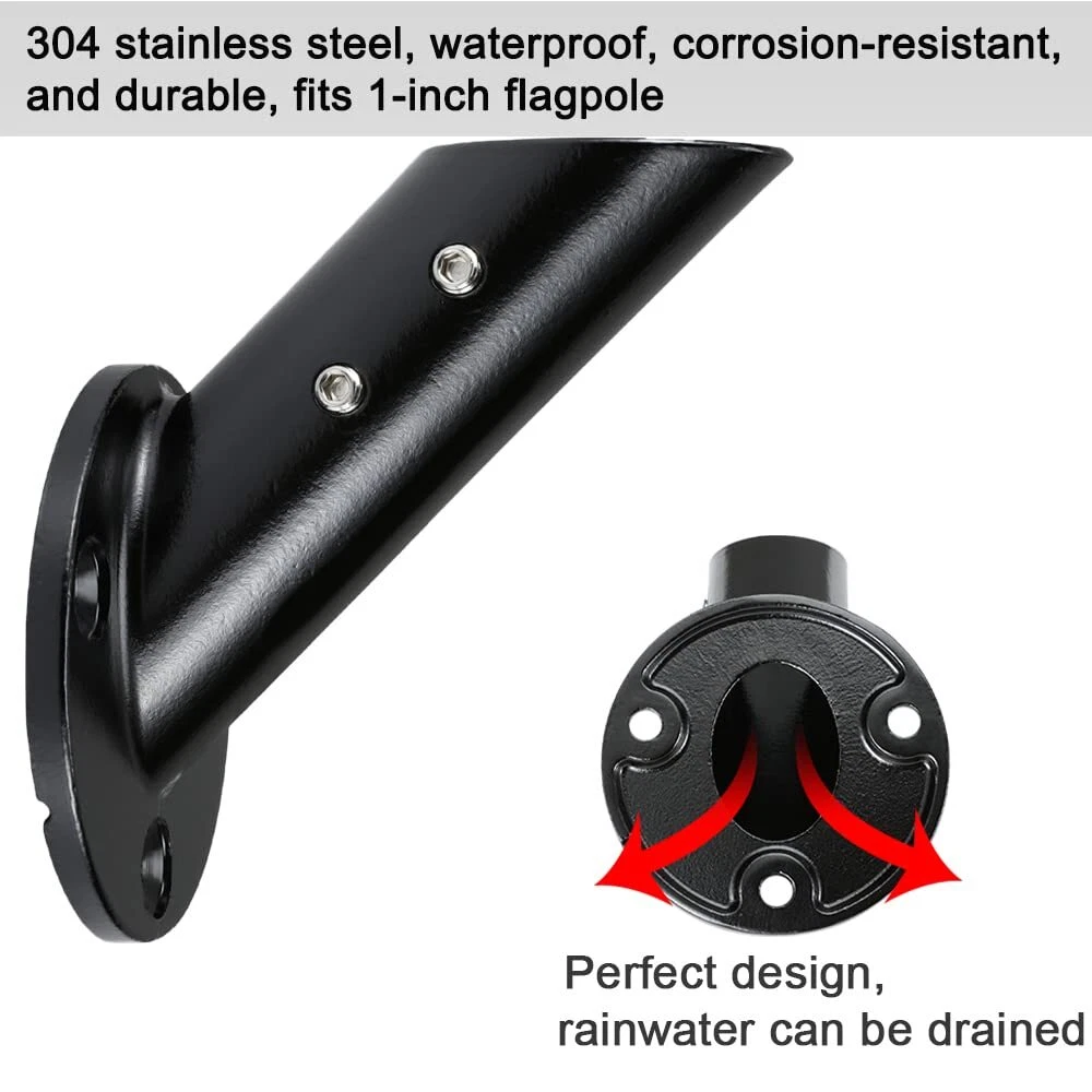 Flag Pole Holder Specification Material: 304 Stainless Steel Color: Black weight: 0.57lb / 259.5g Installation Accessories Specification Screws: Length 1.57in / 40mm Expansion screws: Length 1.69in / 43mm Installation Method ✔ If you're mounting to stone/concrete/masonry, first mark the installation position of 3 holes. And then drill a hole slightly longer than 43mm with 10mm (3/8”) diameter brill. Insert the expansion screw fully into the hole in the wall. Then align the three holes of the bracket with the installation position, and finally tighten the screw to fix the base with the cross screwdriver. What will you get? Flag Pole Holder x 1 Expansion screws x 3 Screws x 3 304 stainless steel: The surface is beautiful, bright, durable, and scratch-free. Highly polished to a beautiful mirror-like finish. Flag Pole Bracket: It is made high quality 304 stainless steel which is waterproof, corrosion-resistant, and durable. More durable than aluminum, plastic materials, or other materials. 45 degrees install: It can be installed on your roof, yard, porch, truck, or RV, as well as the yacht, boat, deck, wooden pile, etc. Size: Suitable for flagpole within 1 inch. Measures approximately 2.75”w x 4.33“h. And come with screws and expansion screws for your choice. RISK-FREE purchase! If you have any issues or you think everything is not as advertised, please feel free to us.