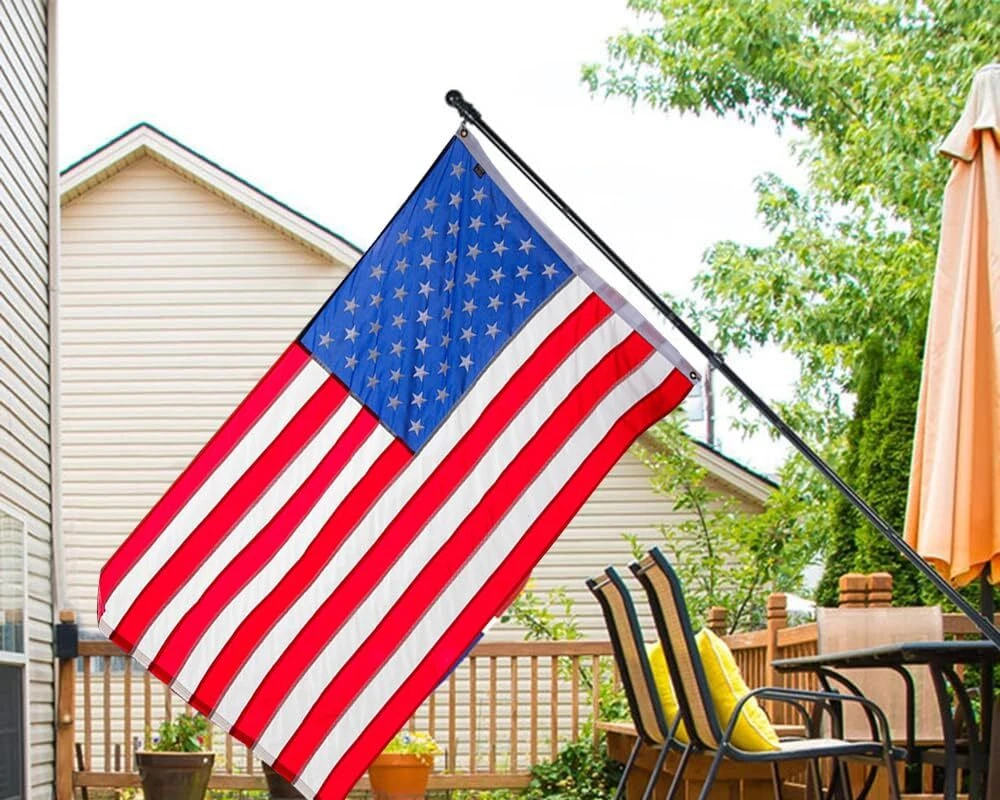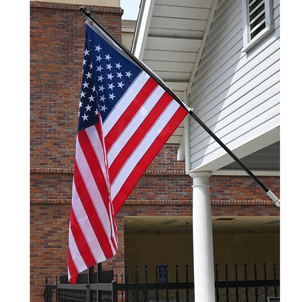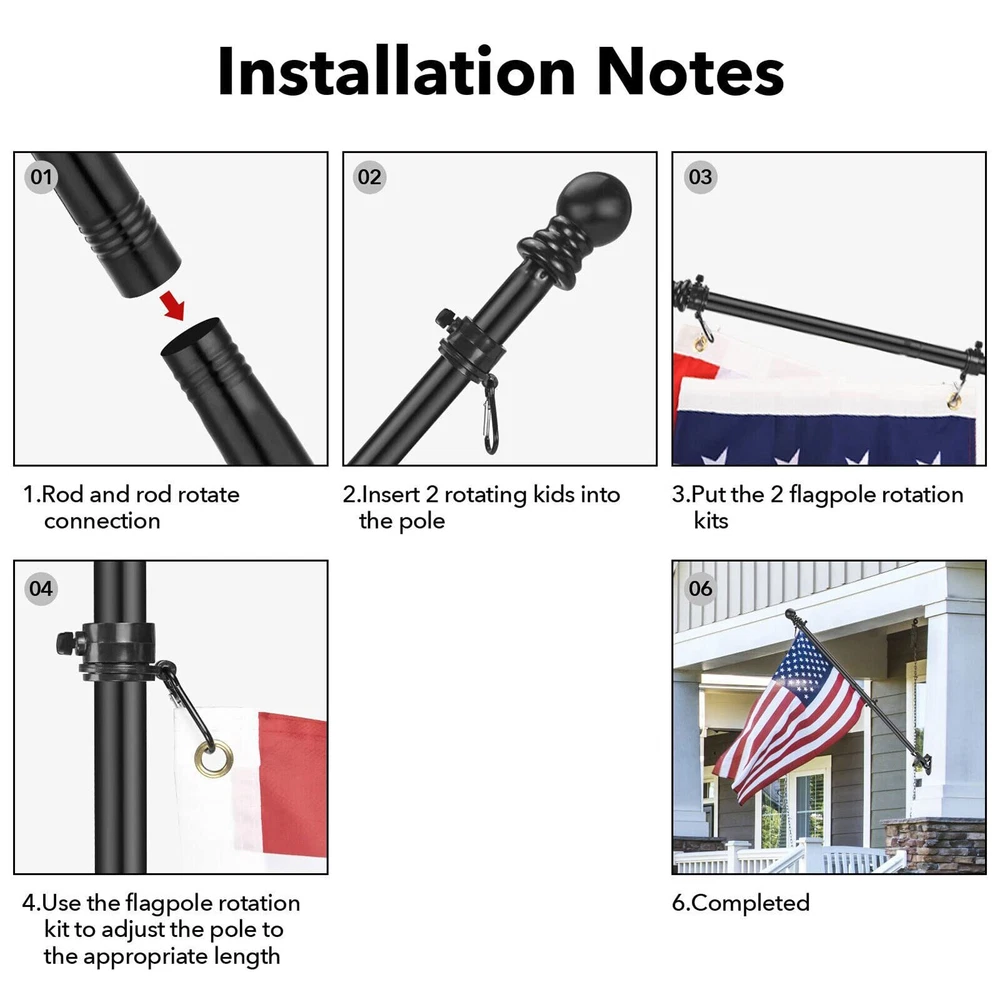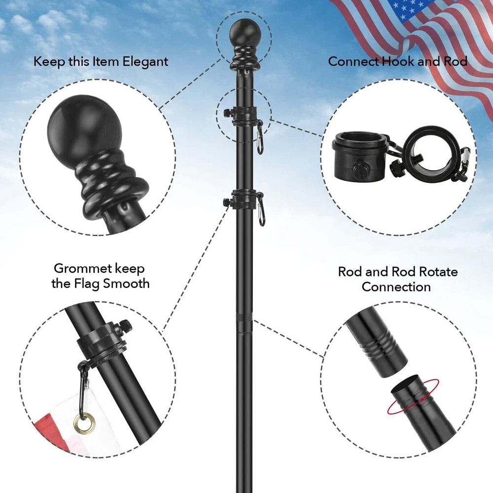 Features: Stainless steel material, no break, high strengthness and durable in use. With two no tangle ring clips, 360 degree rotating, allow flag to fly freely and tangle free. The five- section flagpole with threaded joints is more sturdy and easy to assembly. Great flag pole for indoor, outdoor, garden, yard, wall, holiday, ceremony, and other places or. There are 5 sections of flag pole, you need to assemble it by yourself. Specification: Color: Black Material: Stainless steel Total length: 1. 8m ( 6ft ) Note: The bracket is not included! Package Including Package Included: 1 Set* Flag pole Reliable Material: Our flag pole is made of a high quality stainless steel which is no break, high strengthness and will never rust, can hold up to winds, rain, snows, all-weather outdoor environment. Tangle- Free Design: The high strength flag pole rings with unique improved tangle free steel ball bearings, with two no tangle ring clips, 360 degree smooth rotation allow the flags to fly freely and not wrap or tangle in the wind. Easy to Assemble: The flagpole kit adpts five-stage design, which is make install and uninstall easier, Flagpoles with thread splicing only just connect the poles and put the flag pole in the bracket to install it, no professional installer is needed. Adjustable Length: The 5- section flag pole can be freely combined, It can be installed with different numbers of poles to adjust the length from 1. 3 feet to 6 feet to meet your needs, the flag pole for house is equipped with two rotating flag mounting rings. It is perfect for your American flag, seasonal garden banners, welcome flags, outdoor celebration and decoration flags, Thanksgiving and Christmas flags or other festival flags. Wide Applications: Large selection flag pole kit is ideal for residential or commercial use. It can be widely installed to your yard, garden, house, outside, porch, garage or even your truck, boat, Choosing out our flag pole kit to display your American pride is an honorable decision.