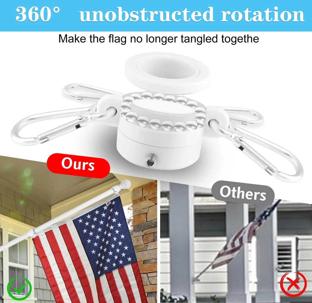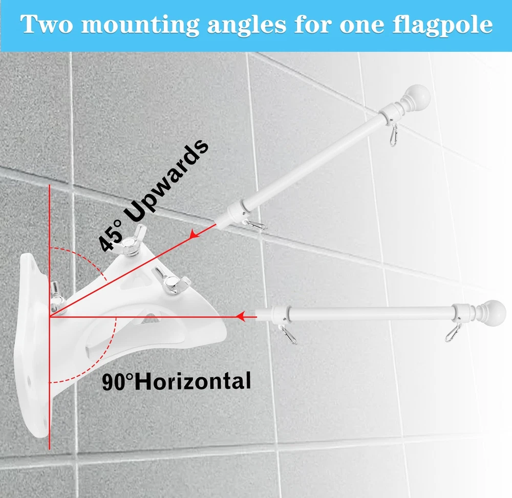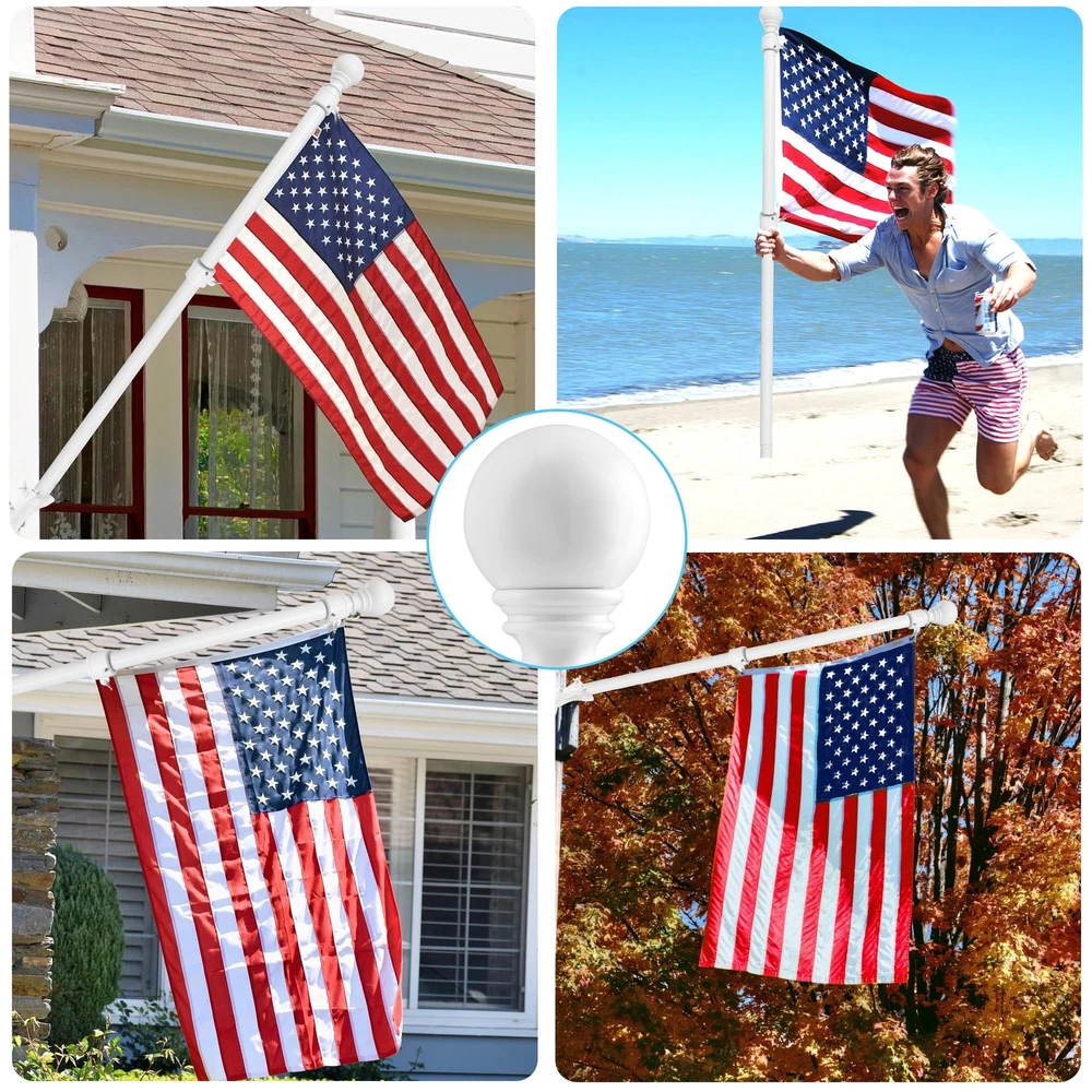 Flag Pole for House-5ft, Flag Pole kit Tangle Free with Holder and a 3x5 In American Flag Metal Flagpole Kit for Outside House, Porch, Yard, Truck, Boat (White) Splice Design: The flagpole is spliced and assembled by threaded connector, it is easy to disassemble and assemble, convenient to carry and save space. ANTI-TRANGLE DESIGN: 360° free rotating anti-tangle ring allows your flag to fly freely in the direction of the wind and won't get tangled on the flagpole. DUAL POSITION HOLDER: You can either hang your flag horizontally or tilt it upwards by 45°. Of course it can also be fitted with a tail end cap to hold it in your hand. STRONG AND DURABLE: 1-inch thick diameter and high quality alloy material make the flagpole stronger, rust-resistant and can withstand all-weather outdoor environment. [Suitable for Many Scenes] The flagpole comes with holders that can be mounted on walls, roofs and even trucks, suitable for houses, porches, decks, garages, and patio decorations. Splice Design: The flagpole is spliced and assembled by threaded connector, it is easy to disassemble and assemble, convenient to carry and save space. Includes one 3x5 Embroidered American Flag, 2 small handheld flags. Anti-Trangle Design: Two specially designed flag rings, which can be rotated 360°, allow the flag to fly in the wind without getting tangled on the flagpole, and you can also install different sizes of flags by adjusting the distance between the two rings. Dual Position Holder: The flagpole holder has been designed with two positions (90°and 45°) to allow for horizontal flag hanging, or the flagpole can be mounted tilted upwards at 45°. 4 fixing holes are designed on the flagpole holder to make the flagpole more solid. Of course it can also be fitted with a tail end cap to hold it in your hand. Strong And Durable: 1-inch thick diameter and high quality alloy material make the flagpole stronger, rust-resistant and can withstand all-weather outdoor environment. Suitable for Many Scenes: The flagpole comes with holders that can be mounted on walls, roofs, suitable for houses, porches, decks, garages, and patio decorations.
