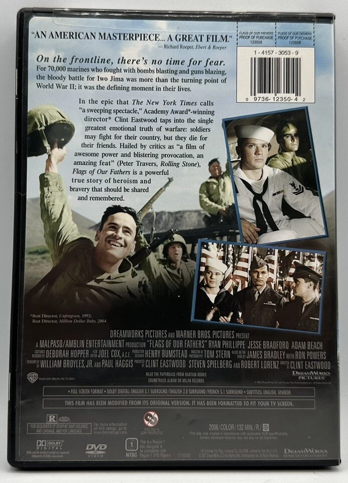 Experience the dramatic story of the American Civil War with "Flags of Our Fathers" on DVD. Directed by Clint Eastwood and starring Ryan Phillippe, Jesse Bradford, and Jamie Bell, this R-rated film is a must-see for history buffs and fans of drama alike. The DVD comes in a tall/DVD case and features both English and French language options, as well as subtitles in English and Spanish. This full-screen version of the movie has a run time of 132 minutes and is rated DVD: 1 (US, Canada...). The DVD is brought to you by DreamWorks and was released in 2007. Don't miss out on this cult-classic cinematic movement that tells the story of the American Civil War.