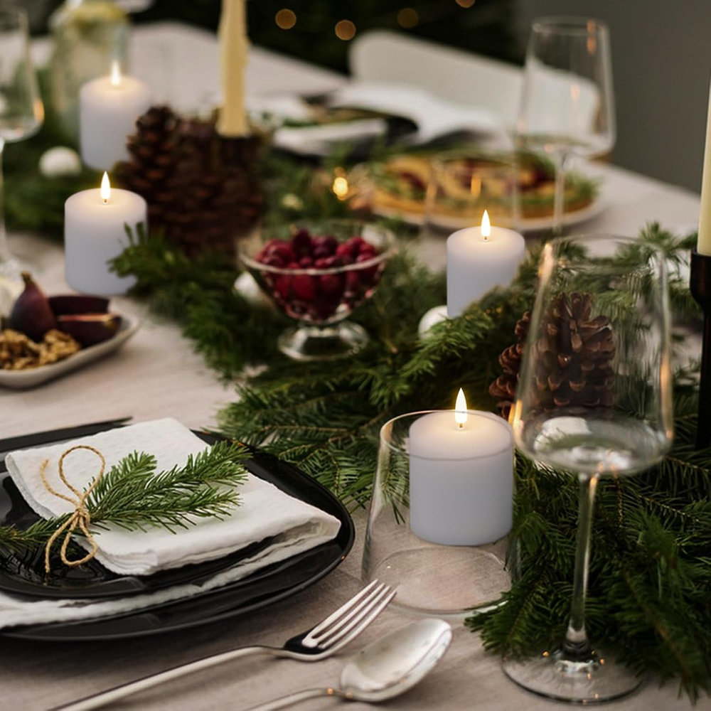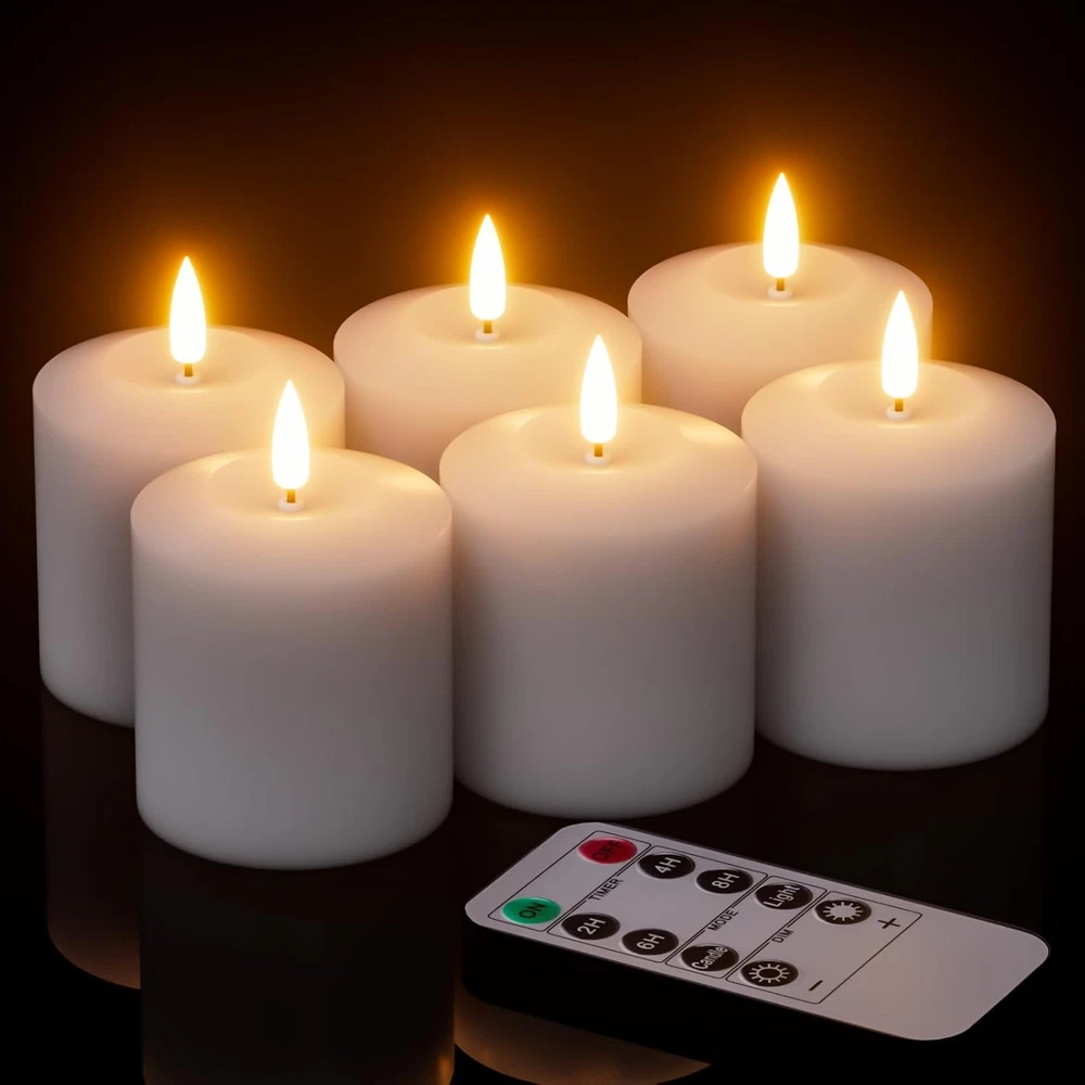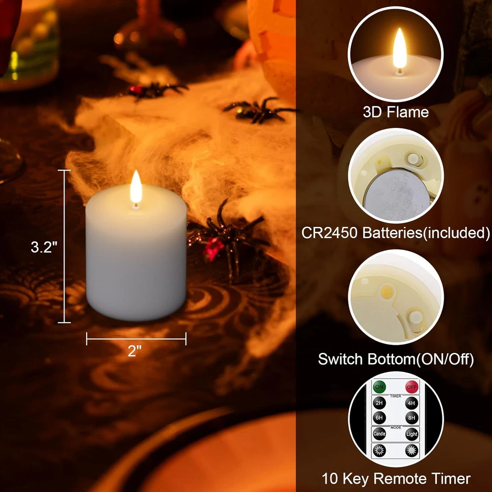LASTS LONGER AND BATTERY INCLUDED: These 6 LED votive candles (Size: Φ 2" x H 3.2") are made of real wax. Each candle requires 1xCR2450 Button Cell Battery (Included). Lasting over 450+ hours TIMER and REMOTE: Bottom 2-way slide switch(ON/OFF). You can set your candle on a 2/4/6/8 hour timer, adjust brightness, change flicker mode. If you slide switch to ON and use the remote to set timer mode, it will automatically turn on/off, cycle every 24 hours NEW 3D FLAME: These flameless candles have a 3D flame, the warm LED light is pretty and bright enough.they have a more natural flickering light. look and behave more like real candles, really add to the ambiance of the holiday Package Included: You will get 6 x led votive candles, 1 x remote timer, 1 x user manual. Each eletric candles contains a CR2450 battery. Each LED candles through rigorous and thorough test, if you are not satisfied, please contact us GenSwin any time Package Included: You will get 6 x led votive candles, 1 x remote timer, 1 x user manual. Each eletric candles contains a CR2450 battery. Each LED candles through rigorous and thorough test, if you are not satisfied, please contact us GenSwin any time GenSwin 6 Pack Flameless Pillar Candles Flickering with Remote Timer, Battery Operated Real Wax LED Votive 3D Wick Candles White Battery Candles for Indoor Decor(Battery Include, 2 x 3.2 Inch)
