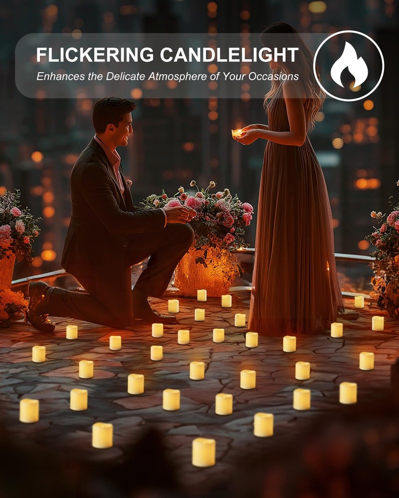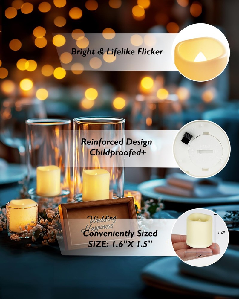 50 Pack Flameless Votive Candles-Ivory Long Lasting 200+Hour: These led votive candles(1.5"D x 1.6"H) come pre-installed with premium CR2032 batteries and will provide 200+ hours of continuous use. Easy to Use and Maintain: These candles eliminate concerns about fire hazards. They are also easy to maintain and reusable, allowing you to enjoy their beauty over and over again. Brightest Soft Light: These votive candles feature a realistic warm flicker, using latesting LED beads to emit bright, uniform soft white light. The pale yellow glow simulates a real candle, creating a cozy and warm ambiance. Safety First: These votive candles are thoroughly tested to ensure their reliability, and the secure battery cap design further enhances their safety. With (UN38.8) internationally certified batteries and healthy polypropylene materials, plus a secure battery cap design. Versatile Use: Perfect for home decoration, parties, events, and even as gifts. Their portable size makes them easy to carry and transport. You can take them with you to a picnic, a beach party, or any other outdoor gathering.