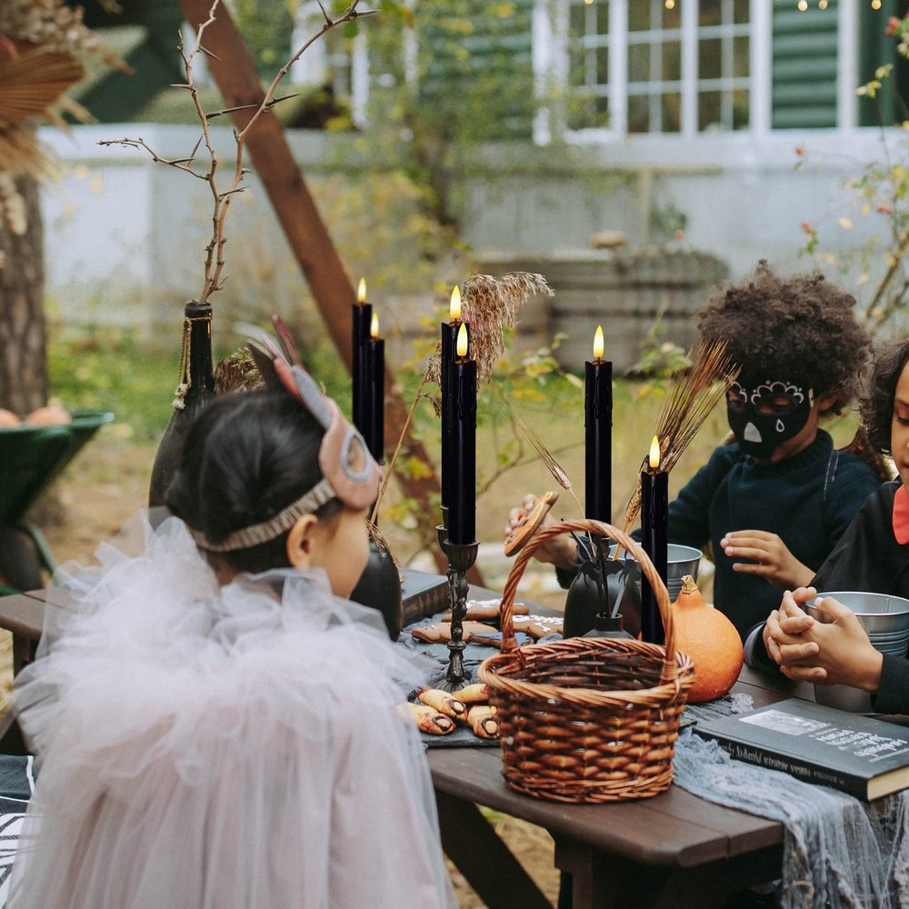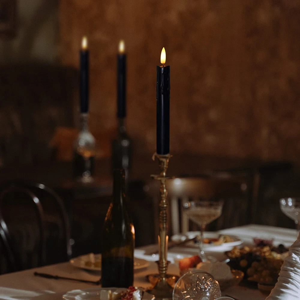 Flameless Candles Specification: Package Information: Eight Black Flameless taper candles, one manual, two remote control Color: Black Size: 0.86 x 7.5 Inch Material: Plastic Color of Light: Warm Fire Wick: 3D-Wick Functions: Flameless,Battery Operated,Flickering,Remote,2/4/6/8 Hours Timer What You Get: You will receive 8 black flameless taper candles (2 AA Batteries, Not Included), two remote control(Batteries Included) and one manual.The LED taper candle is 7.5 inch high and 0.86 inch in diameter. We use plastic material to make the Battery taper candle more firm and not easily crack Battery Operated: Putting in two high-quality AA batteries can keep the candle bright for 400 hours, which is more economical than use real candles. And battery taper candles avoid the safety problems of real flame, safe for children and pets Remote and Timer: Within a range of 26 feet, you can use the remote control to turn the led tape candle on/off and set the 2/4/6/8 hour timer function for the flameless window candle. If you set a 2 hour timer at this time, the candle will turn off after 2 hours, and will turn on again at this time the next day, then automatically turn off 2 hours later Dripping Wax Effect: Added dripping wax effect to ensure candles look more realistic. 3D-Wick and warm fire restores the shape and color of the candle flame. You also can set flckering or No-flickering mode and you can adjust the brightness of flameless candles Our Service: always believes that providing customers with the best after-sales service is as important as making great black LED taper candles. If you have any questions after receiving the product, please feel free to . We will give you a satisfactory solution