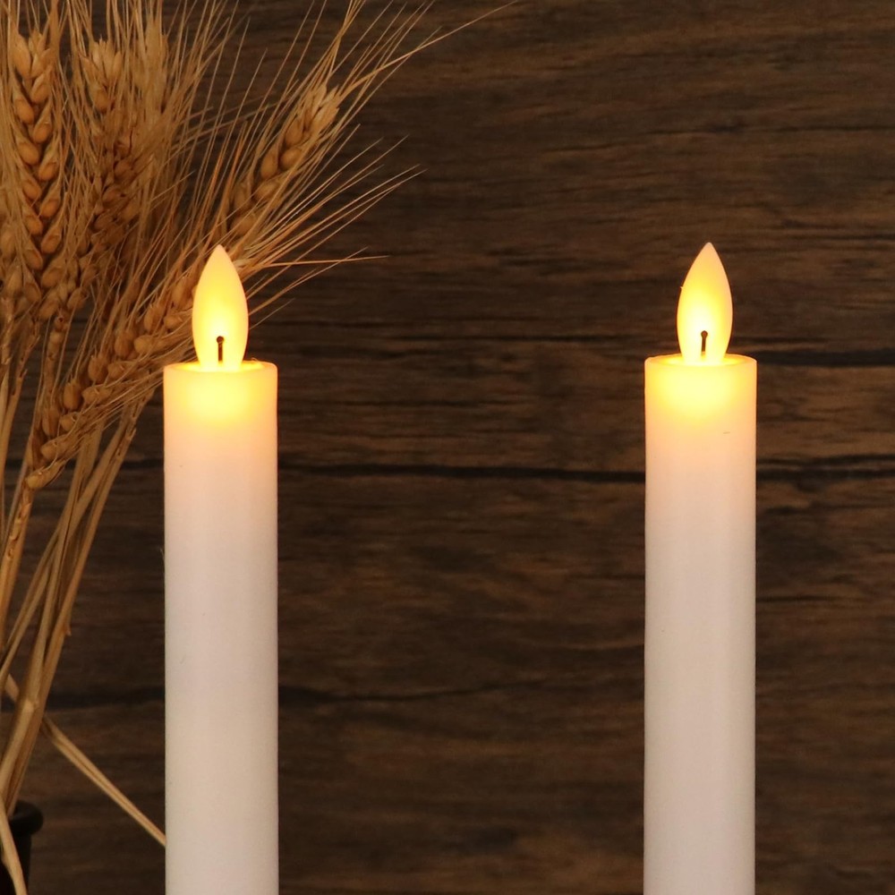Flickering Flameless Taper Candles with Remote and Timer ✔PACKAGE LIST: You will get 2 white real wax LED window candles (0.78 "D x 9.5”H), one 10-Key remote, and one user manual.Moving Wick Patent Number: 11480309 ✔FLAMELESS CANDLE: Realistic flickering flame looks like real candles, Amber yellow glow light creates warm and romantic atmosphere in your room, can be widely used as wedding, family dinner, birthday, party, Thanksgiving, Christmas home window decoration candles ✔BATTERY OPERATED: Each flickering taper candle require 2 AA batteries(Not Included), no need to worry about smoking or dripping wax, safe and clean for your kids and pets ✔REMOTE AND TIMER: Easy and convenient for you to control all LED window candles ON/OFF/Timer/Flickering/Brightness with 10-Key remote. Four different timer modes meet your different needs. once the timer is set, cycle every 24 hours ✔OUR : Each flameless window candle has thoroughly tested before leaving our factory, if any problems occurs to our flameless tapers, please feel free to our , and you will get a satisfaction solution