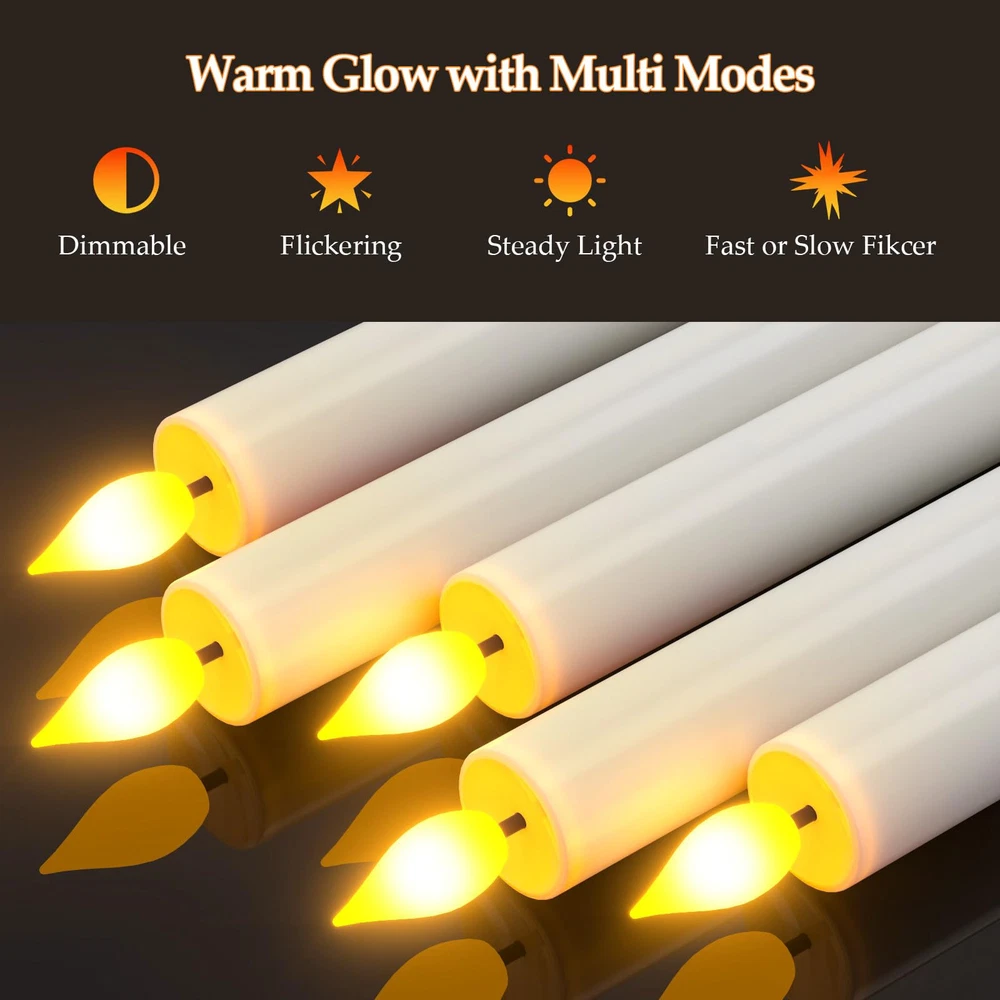 No Batteries or Future Expense Required - Rechargeable function eliminates the need for you to purchase additional batteries. Ideal for everyday home use as well as for wedding table decor. Good choice as Thanksgiving/Christmas gifts, show your best wishes for family & friends. with Convenient Charging Station - Simply laying your rechargeable flameless taper candles on the charging station. Fully charged in 2 hours, provides more than 200 hours of warm candlelight under the medium brightness, or longer if you dim the light via the remote! More than 20,000 hours of lifespan, durable to use! Fits Most Candle Sticks Holder Decor -【Candle Size: Height 6.7" x Diameter 0.78", makes it match with most candelabra (it can also stand alone).】Set them into your Halloween taper candle holders or placed them on the Thanksgiving centerpieces for tables or use them as Christmas window candles to to create festive atmosphere. Flameless Candles with Remote Control - Turn these taper candles ON via the bottom switch first, then you can adjust the light effect, flicker frequency, brightness with the remote - which is great if you put them up high or hang them on a chandelier/bookshelf for Halloween/Christmas Themed party. And you can also set a cycle timer for 2/4/6/8 hours. Versatile Decorative Rechargeable Candles - Elevate any space with the warm and enchanting glow of these rechargeable reusable taper candles. Classic white color shows the real taper candle appearance. Updated flickering effect as natural as breathing. Perfect for adorning homes, fireplace, tables, parties, weddings, bedrooms, and various events throughout the year. Flameless LED Taper Candles Set -【You Will Get: 10pcs Flameless Candles with Remote + 1*Charging Station + 1*USB Charging Cable. Designed box is nice as a gift.】Our flameless candles have been tested before sale. If any quality problems, please feel free to get in touch with our store customer service and we will offer you a satisfactory solution within 24 hours. Note: Please fully charge the battery for the first time. For each charge after that, deplete the battery completely before recharging to extend its lifespan.