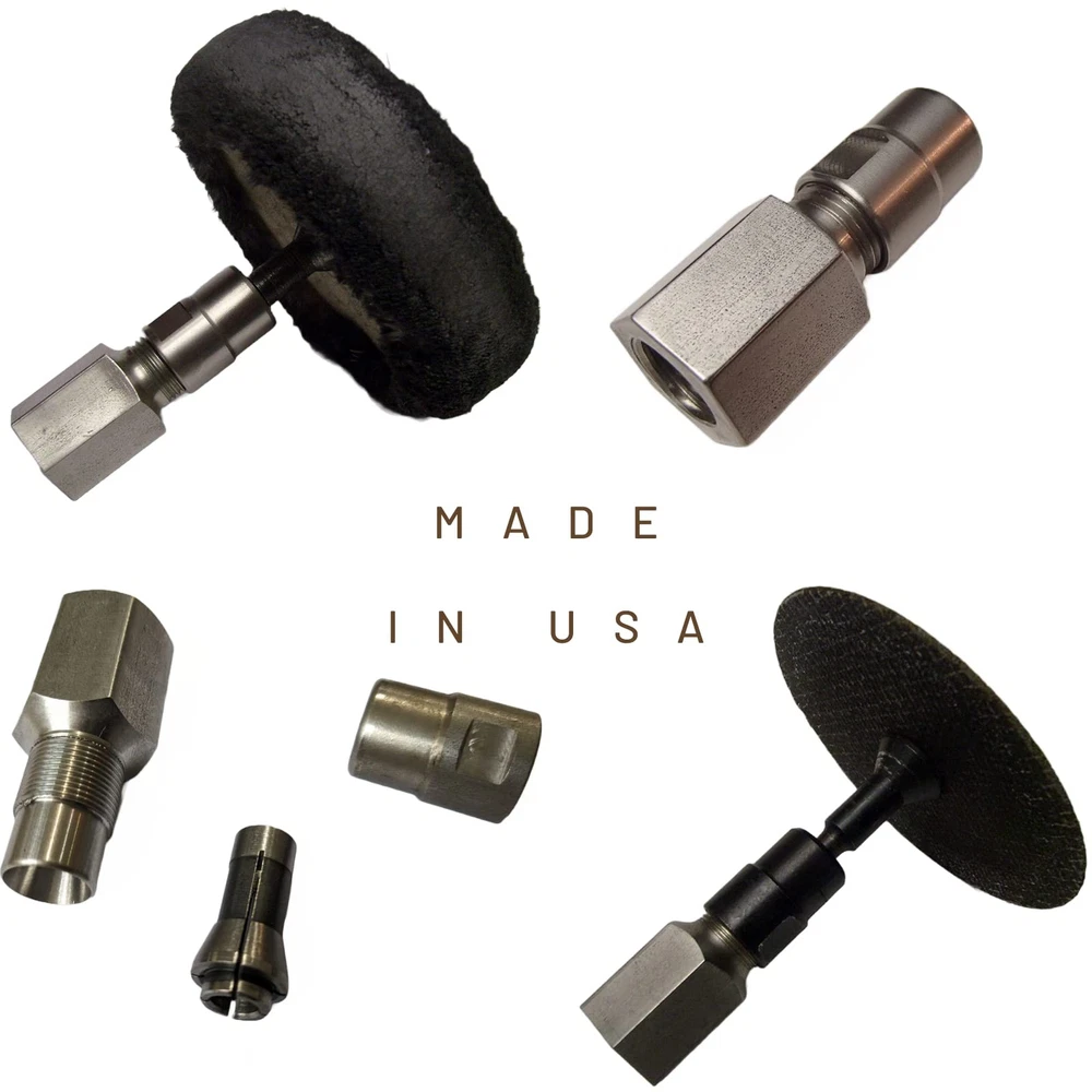 Heavy-Duty 5/8 inch - 11 Female to M14 Threaded Male Adapter Maximum 12,000 RPM Rating Rust Proof Black Coating For North American Standard Power Tools such as angle grinders, wet polishers that normally accepts 5/8 inch -11 threaded attachments. M14 grinding wheel adaptors will help to convert European Metric 14 attachments to 5/8 inch- 11. If you have a power hand tool with 5/8 inch- 11 threads and you ended up buying an attachment with M14 threads, you will need this angle grinder drill chuck adapter. There is a water hole in the center of this adapter for water cooling of diamond core hole saw drill bit tools. Compatible with all tools with M14 female threads (our adapter has M14 male threads). This adapter is designed for European M14 tool attachments to be used with North American power tools with 5/8 inch-11 threaded spindles. 5/8 inch-11 thread is the standard for North American Tools Metric 14 (M14) is very common for European Tools Our M14 Male Mortar Rake Adapter can be used with European M14 mortar rake starter kits or tungsten carbide mortar rakes. Versatile: Turn your angle grinder into a rotary tool; use with a wide range of accessories for grinding, polishing, sanding, cutting, and surface preparation Durable: Made from high-quality 303 stainless steel; built to withstand heavy-duty use on job sites Precision Construction: Ensures efficient performance and minimal vibration; delivers smooth operation every time Easy to Use: Compatible with most angle grinders; a convenient and cost-effective alternative to separate rotary tools; switch accessories quickly to get the job done faster Made in the USA: Proudly made in the USA; guarantees quality and craftsmanship Wide Compatibility: Features a 5/8" - 11 UNC standard thread for angle grinders and a 1/4 inch collet; compatible with flapper wheels, carbide burrs, cutoff wheels, and polishing wheels Great for Welders and Metalworkers: Essential tool for on-the-job use in welding, metal fabrication, woodworking, and more