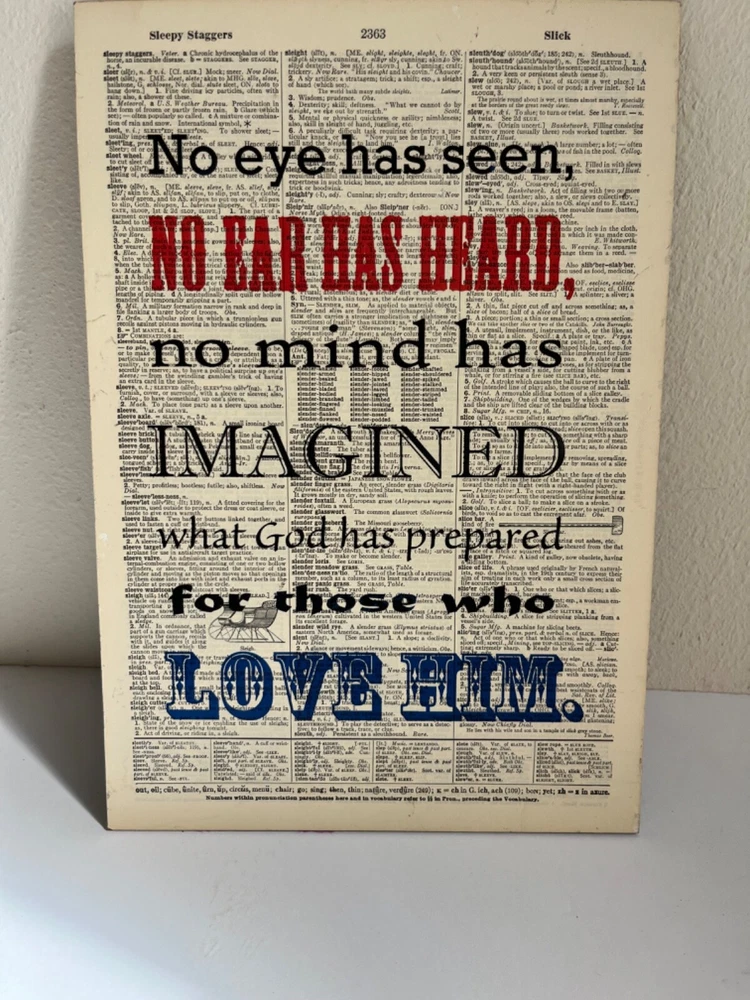 This listing is for a Dictionary Art print biblical accessory. Inscribed with 1 Corinthians 2:9 (English version). It is a unique print with inspiration. Canvas only; no frame. Pre-owned and in good condition. Size: 11 3/4 x 8 inches. 10% of each item sold will be donated to Katie Cares Co charity pick of choice in support of Alzheimer's and Heart Disease patients and families!