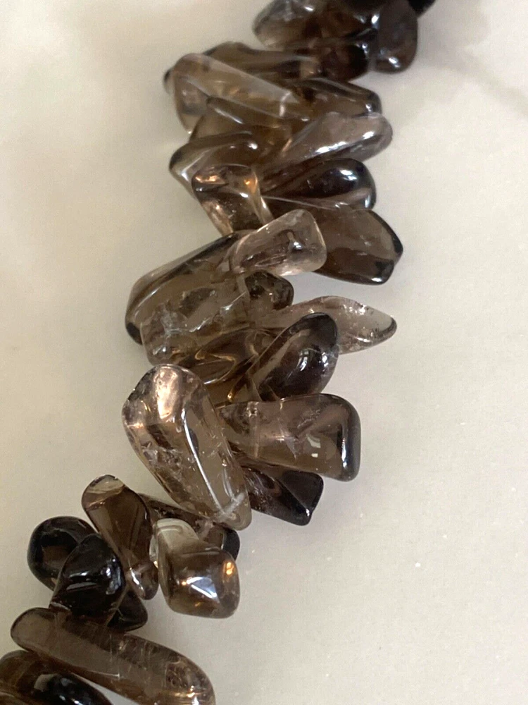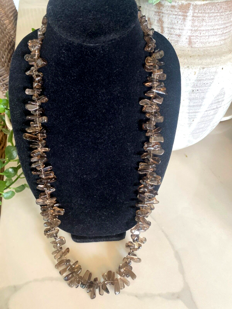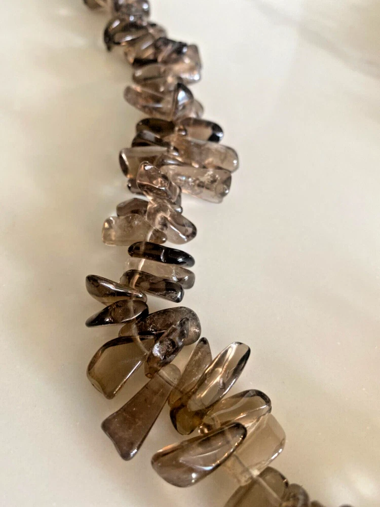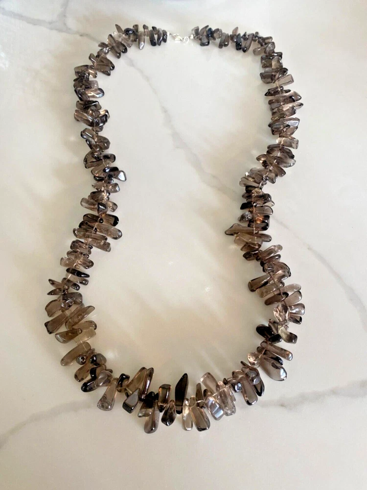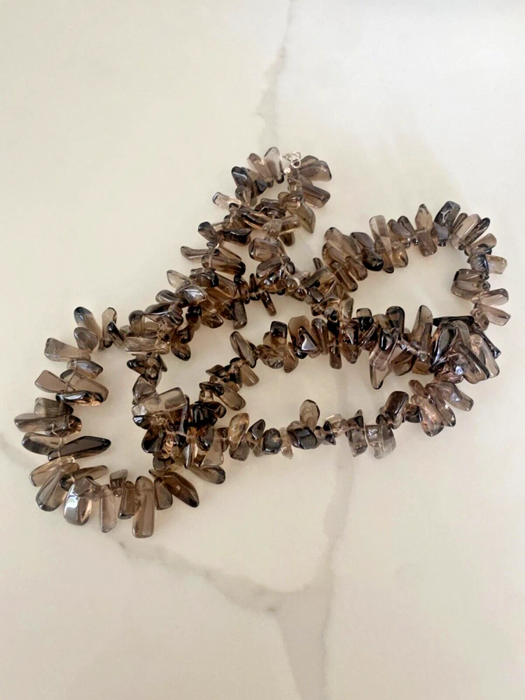 Gorgeous Polished Free Form Natural Smoky Quartz Beaded Long 36” Necklace Sterling Silver Clasp Features highly polished smooth free form natural Smoky Quartz beads with a sterling silver 925 lobster clasp closure. Wea it long or double it for a layered look! Smoky Quartz is a variant of the Quartz mineral family which ranges in color from a light gray to darker gray/brown/black and can be transparent to barely translucent. It is the national gem of Scotland, and sacred to the Druids in Celtic cultures. Hecate, the ancient Greek goddess was also associated with Smoky Quartz. Smoky Quartz is thought to help one become balanced and grounded especially with a chaotic life. These beautiful transparent Smoky Quartz beads are not uniform in size, with the smaller pieces measuring ~ 10mm x 6mm and the larger ~ 28mm x 16mm. It is in very good condition. No missing or broken stones. Please see all photos. Shipped USPS Ground Advantage. Message me with any questions. Thanks for looking!