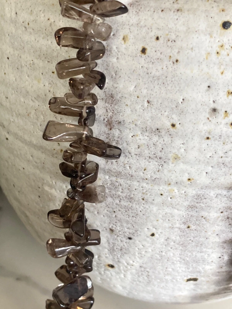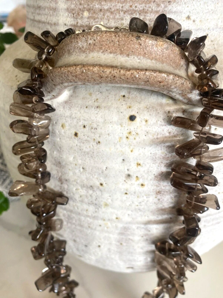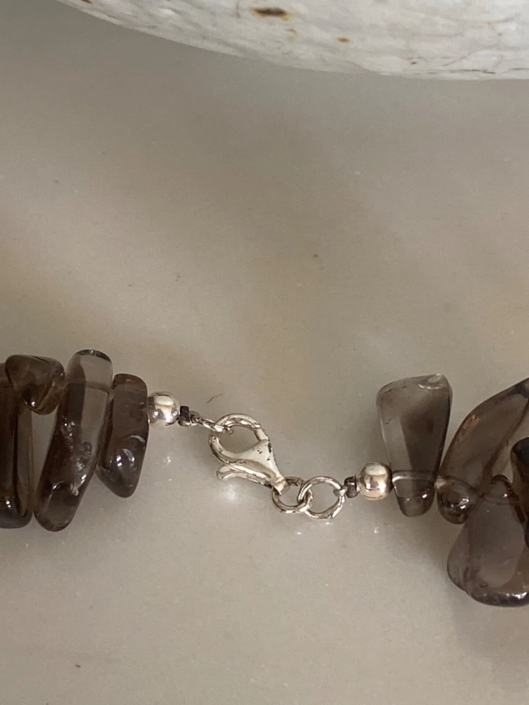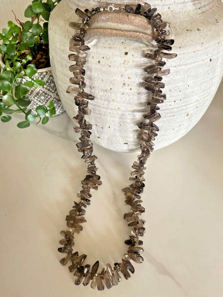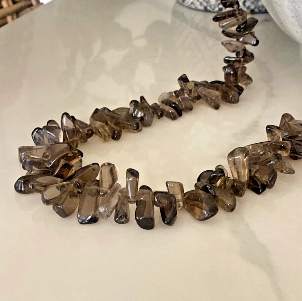 Gorgeous Polished Free Form Natural Smoky Quartz Beaded Long 36” Necklace Sterling Silver Clasp Features highly polished smooth free form natural Smoky Quartz beads with a sterling silver 925 lobster clasp closure. Wea it long or double it for a layered look! Smoky Quartz is a variant of the Quartz mineral family which ranges in color from a light gray to darker gray/brown/black and can be transparent to barely translucent. It is the national gem of Scotland, and sacred to the Druids in Celtic cultures. Hecate, the ancient Greek goddess was also associated with Smoky Quartz. Smoky Quartz is thought to help one become balanced and grounded especially with a chaotic life. These beautiful transparent Smoky Quartz beads are not uniform in size, with the smaller pieces measuring ~ 10mm x 6mm and the larger ~ 28mm x 16mm. It is in very good condition. No missing or broken stones. Please see all photos. Shipped USPS Ground Advantage. Message me with any questions. Thanks for looking!