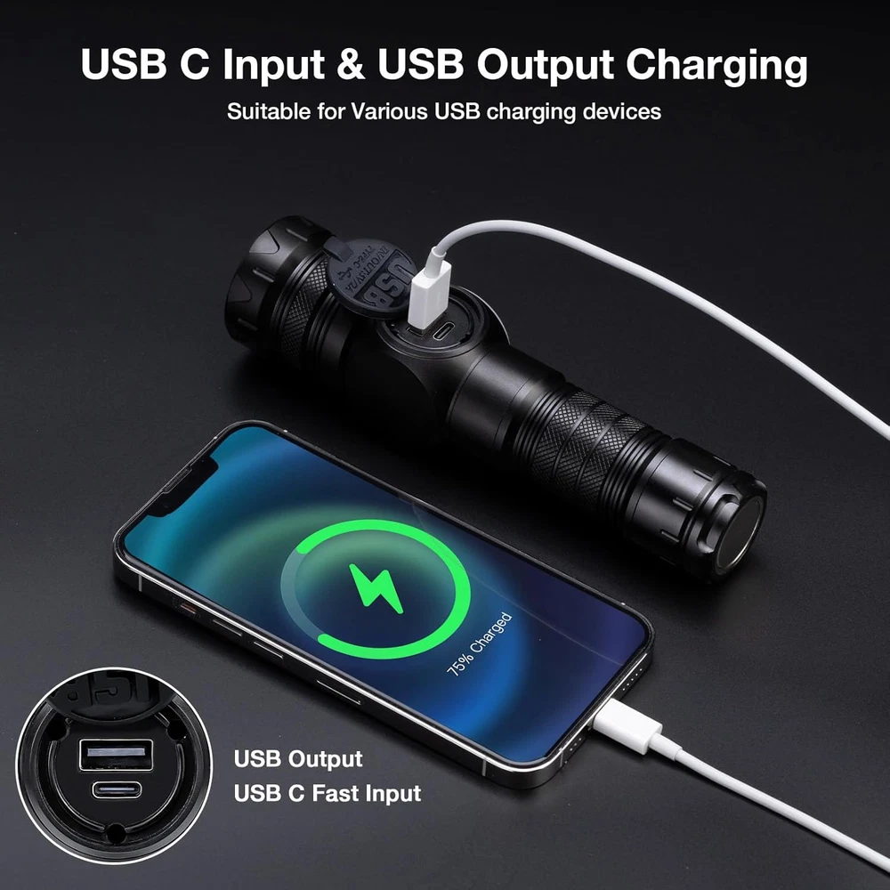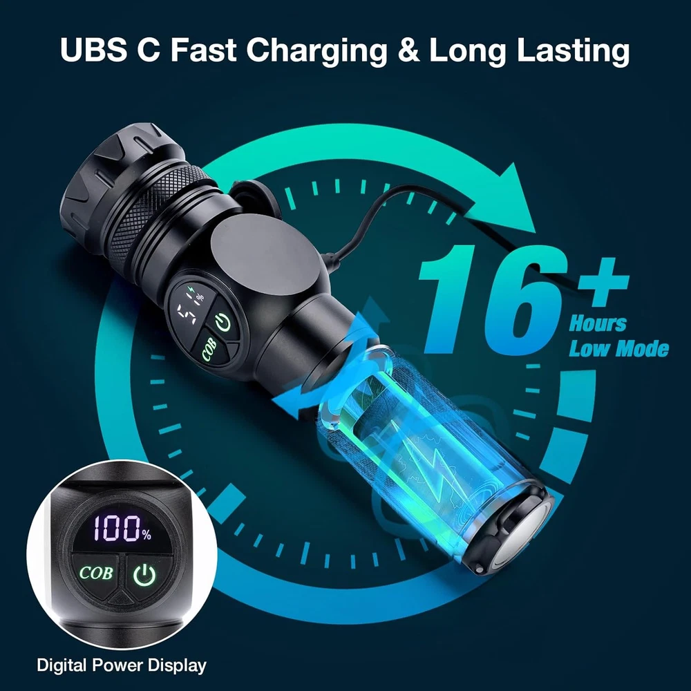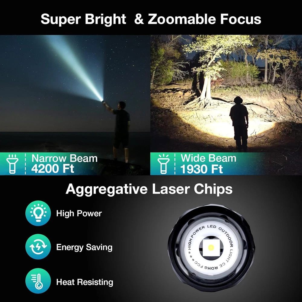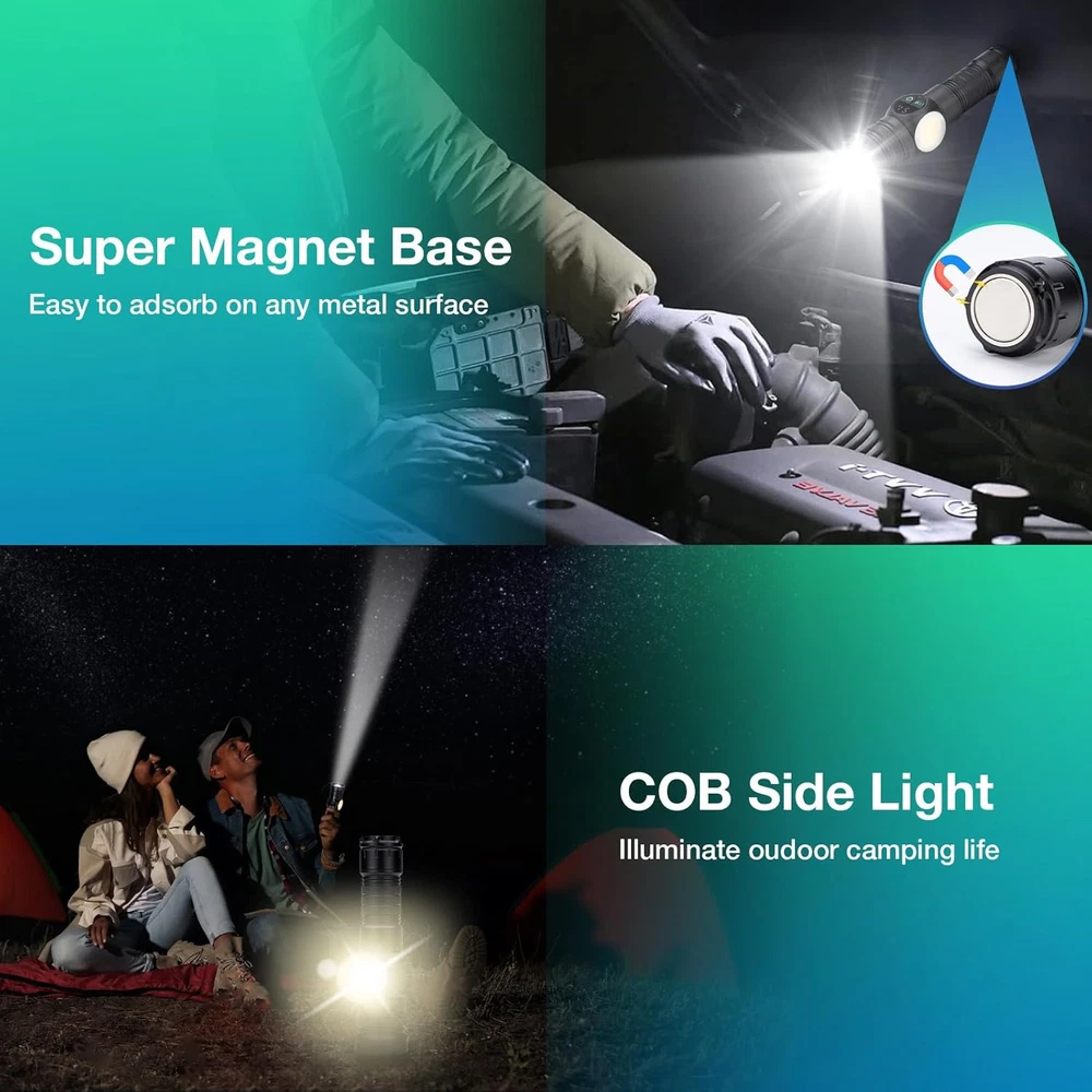 1,200,000 Lumens Tactical & Zoomable Focus: Super bright flashlights is equipped with an upgraded polymer laser chip, so it has the characteristics of high power, energy saving, and high temperature resistance. The flashlight head is adjustable, and you can choose the size of the beam focus by pushing and pulling the head. It can illuminate up to 1930 square feet in a wide beam and up to 4200 feet in a narrow beam. 2 Light Sources & 9 Modes: LED flashlights is designed with 2 light sources and 9 modes. The main light has 5 modes: high/medium/low/strobe/SOS, and the COB side light has 4 modes: high/low/red strobe/red SOS. The main light and COB side light have their own buttons. You can choose the appropriate light mode according to your needs. USB C Fast Charging Input & Mobile Power: High lumen flashlight has a built-in battery and a USB C fast charge input interface, which can be fully charged in just 4 hours. In addition, the flashlight is equipped with a USB output interface, which is suitable for various USB charging devices and can be used as a mobile power supply. It will be a good helper for you when you are in an emergency. Digital Power Display: Rechargeable flashlights is designed with a digital power display, so you can accurately grasp the remaining power of the flashlight at any time and make better use of the flashlight. Because the high lumen flashlight has a built-in large-capacity battery, it can work for up to 16 hours (in low mode). IP76 Waterproof: Tactical flashlight adopts a sealed design and built-in high-toughness sealing rubber to achieve IP76 waterproof rating. It is waterproof, non-slip, shockproof, waterproof, rainproof and dustproof. This LED tactical flashlight is suitable for outdoor activities such as emergencies, camping, running, hiking, mountaineering, fishing, etc. Powerful Magnetic Base: Tactical flashlight is made of high-strength aluminum alloy, which is anti-fall and anti-shatter, and can be used as an emergency window breaker in an emergency. In addition, the magnetic base at the bottom of the flashlight is easily adsorbed on any metal surface, making your use experience even better. You Will Get: 1*high lumen built-in battery rechargeable LED flashlight, 1*USB charging cable, 1*lanyard, 1*instruction manual, 2-year quality warranty and 7*24 hours customer service. If you have any questions or problems with the flashlight, please feel free to contact us. Please simply click “Get Help With Order” under your order ID, we will solve your issues within 24 hours. Product Description