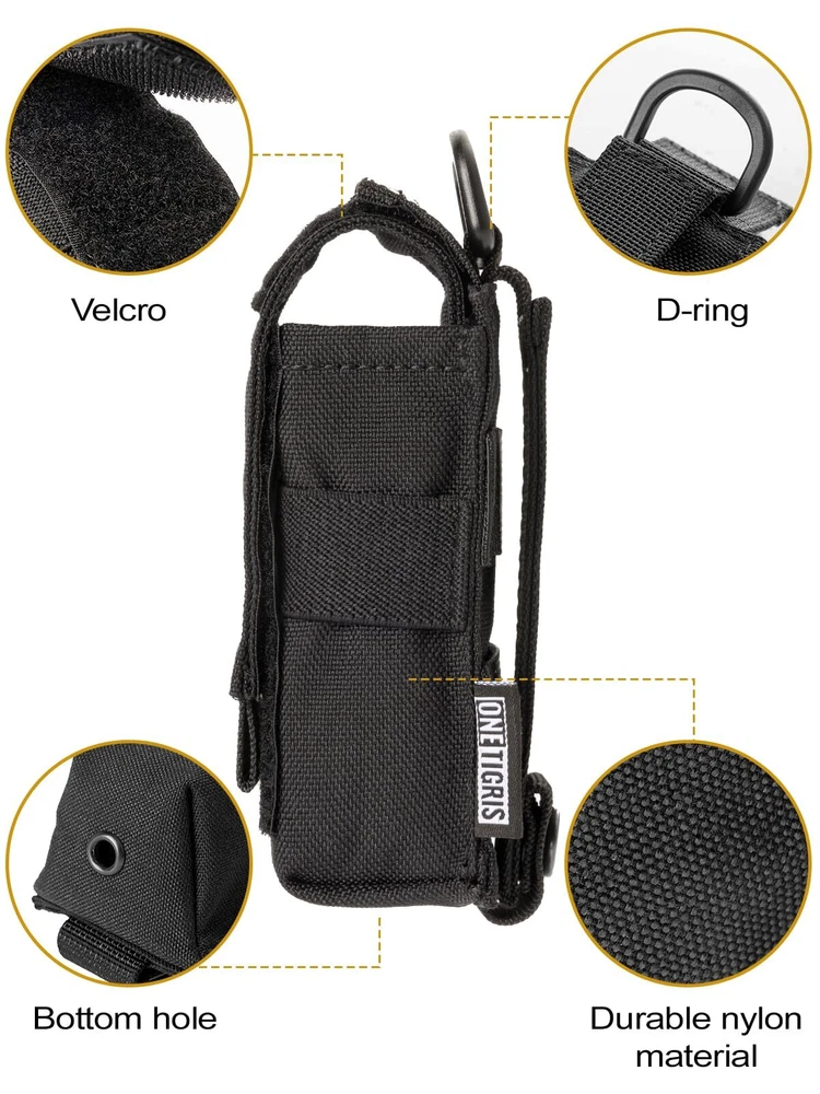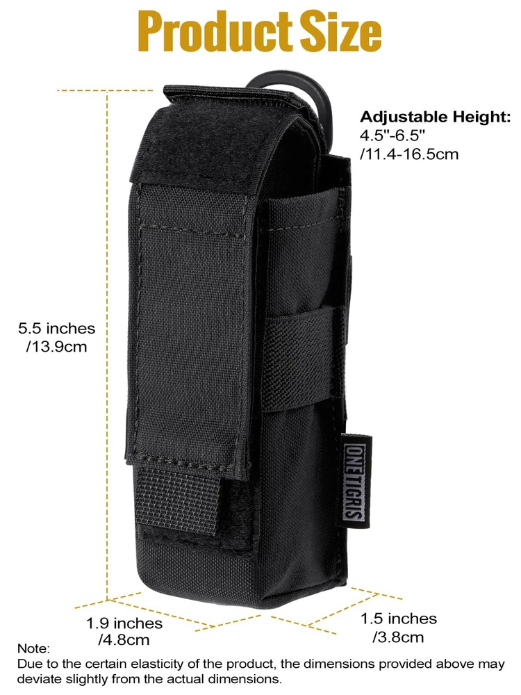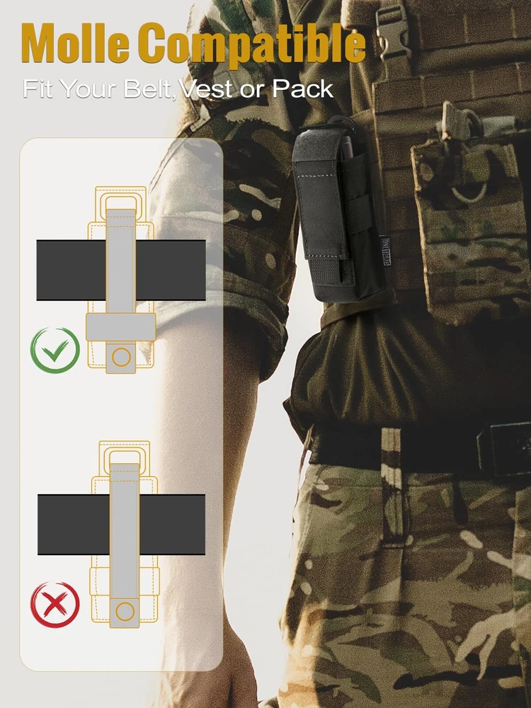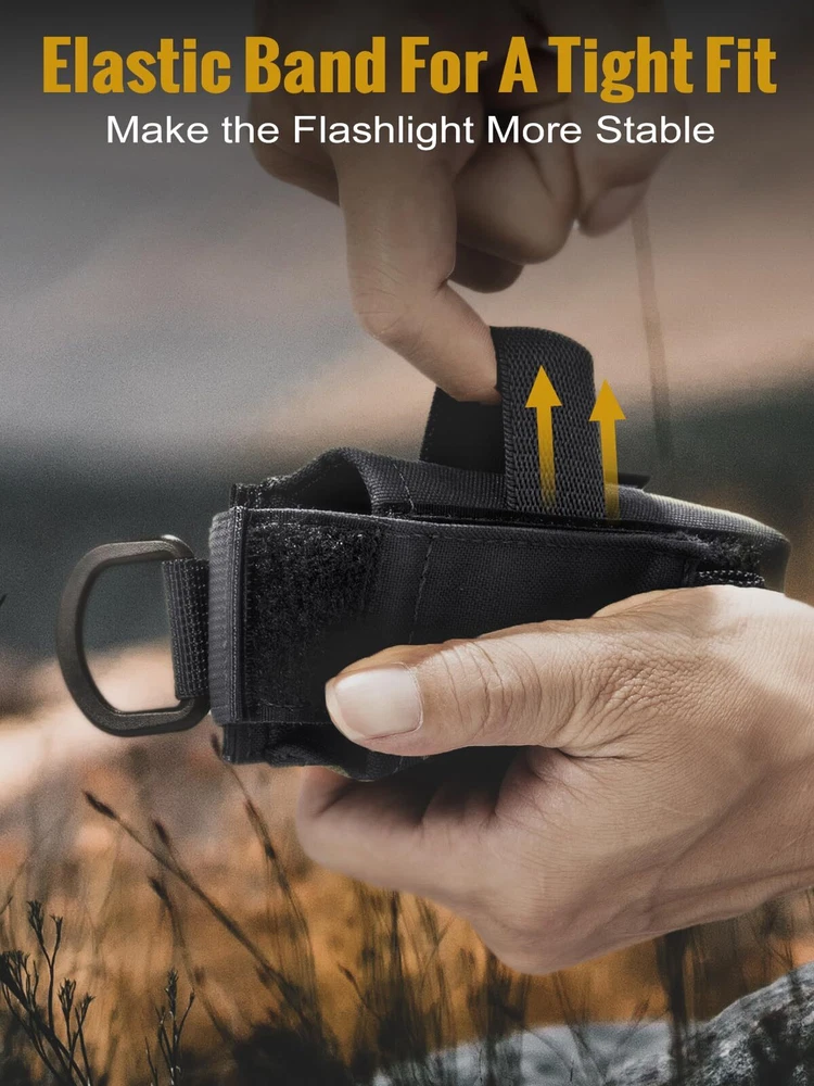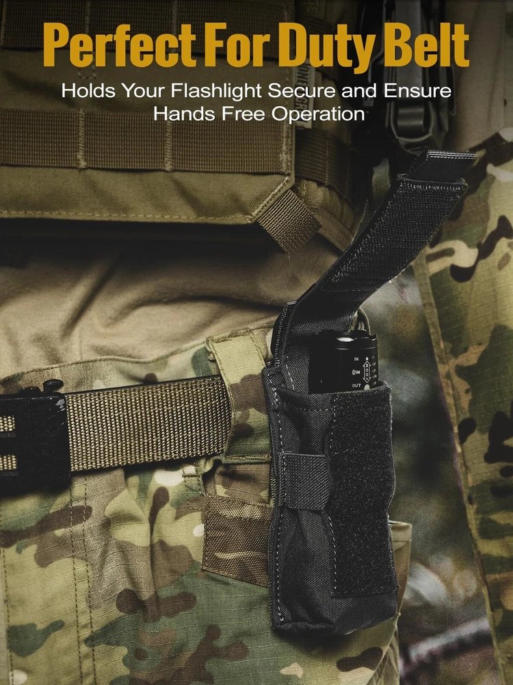 Why Choose Hook & Loop Flashlight Pouch? A simple design that just works. Featuring Cordura Nylon for extra durability and dirt resistance, felt lined interior for solid scratch-free protection, and MOLLE compatibility to fix onto your belt or gear. Specifications Material: 1000D Cordura Nylon, UTX-Duraflex D-ring Dimensions: 6.3’’*2’’*1.2’’/16cm*5cm*3cm Weight: 2.64oz/75g Package Includes Molle Flashlight Pouch *1 【HEAVY DUTY CONSTRUCT】Flashlight Holder is made from 1000D Cordura Nylon for extra strength and water/dirt/abrasion resistance; Felt lined interior for good protection and scratch prevention. 【CONVENIENT TO CARRY】MOLLE Tactical Flashlight Holster is compatible with webbing and the snap-buttoned strap is suitable for fixing onto your belt, vest or pack. 【VERSATILE TOOL HOLDER】Flashlight Holster fits Fenix TK09 TK15 TK15C PD32 PD35 LD12 LD22 SD10 E20 E25 E35 E35-UE. 【ADJUSTABLE FLASHLIGHT HOLDER 】Adjustable Hook & loop Flashlight Holster for Belt to hold varying tools. 【FUNCTIONAL DESIGN】UTX-Duraflex D-ring at the top of molle flashlight Holster and a grommeted drainage hole at the bottom of tactical flashlight pouch. Note:Only a flashlight holster, anything else is not included.