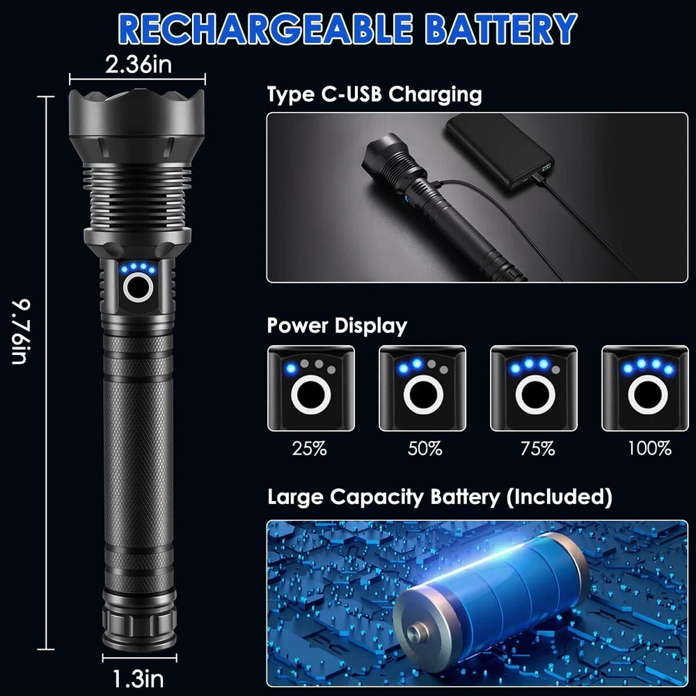 Flashlights High Lumen: The rechargeable flashlight is equipped with an upgraded LED chip which can emit a super bright beam, and the illuminates a length of up to 2,000ft distance and Illuminates an area of up to 1500ft. whether it's for home, camping, hiking or emergency, a super bright flashlight is indispensable for you. 5 Lighting Modes & Adjustable Focus: Multifunctional tactical flashlight has 5 main modes: high/medium/low/strobe/SOS. Adjustable Tactical Flashlight allows you to change the size of the beam by switching the focal length and freely switch between far and near light. Rechargeable & Power Display: Large rechargeable flashlight is powered by two high-capacity rechargeable batteries, which can provide up to 6-16h of illumination. The tactical flashlight also comes with a power display function, easily see power level (25%/50%/75%/100%), you can know the battery life at any time. High-Quality Material: Tactical flashlight is made of fine aluminum with good heat dissipation and impact resistance, the sealed design of the tactical flashlight makes it have good waterproof performance, and can be used in rain, snow and other inclement weather, with head cusp design, tactical flashlight can be used as safety hammer. Support Service: We have One-Year product replacement policy for any led flashlight quality problems. Just click “Get Help With Order”under your order ID, our support team will solve your problems within 24 hours. Comes with a beautiful colourful box packaging, making it the wonderful choice for your partner, family and friends.