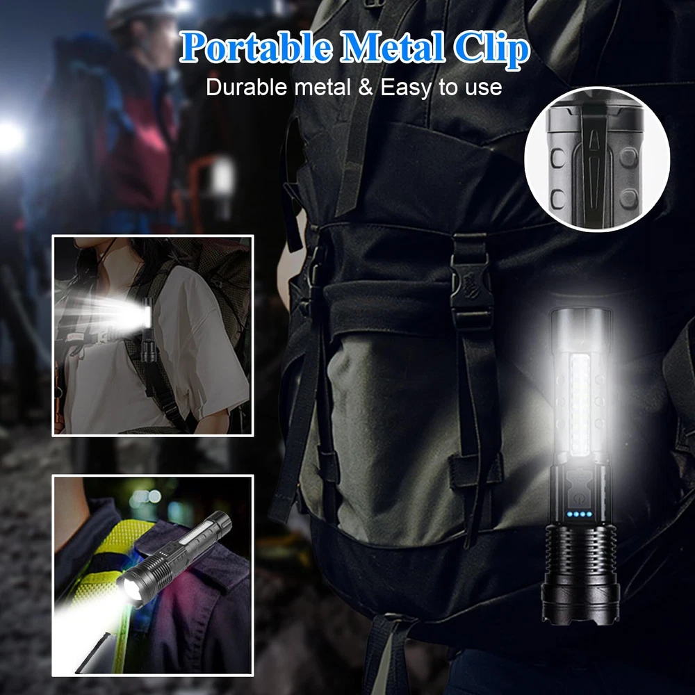 【1,000,000 Lumens Super Bright Tactical Flashlight】 Equipped with upgraded efficient laser Chip LED chips, rechargeable flashlight emits a stable and super bright lighting. Since the light penetration is stronger than other same-level lamp beads', its beam can pass through dust and fog well, especially suitable for foggy and rainy days with low visibility. It can illuminate an 2200-square-foot room or focus on objects up to 3900 feet away. 【7 Light Modes & Zoomable Focus】 There are 7 modes of rechargeable flashlight: High / Low / Strobe for the main light, and High / Low / Red / Red&Blue Strobe for the COB side light. Equipped with zoomable head, the small rechargeable flashlight high lumens can emit a powerful focused lighting and an extensive extended lighting by adjusting the light head. As its compact design, you carry this small handheld flashlight in your pocket or the car glove compartment. 【USB C Fast Charging & Power Indicator】 Built-in a 6000 mAh rechargeable lithium-ion battery and equipped with more energy-efficient chips, the rechargeable flashlight battery powered working time is up to 8 hours. The USB C fast charging input achieves 30% reduction in charging time. It can be charged by power bank, USB plug, etc, with the USB C charging cable. You can see the remaining power at the power indicator light. 【IPX6 Waterproof】 This flashlight head adopts the high grade black aluminium alloy, and the frame adopts the ABS plastic. The waterproof grade of this flash light reaches IPX6 Waterproof. This rechargeable flashlight is non-slip, shockproof, waterproof, rainproof, dustproof. It can work well in severe outdoor weather conditions, such as rain and snow. It is an ideal outdoor handheld flashlight for working, hiking, camping, repairing, hunting, and fishing. 【Easy to Carry】 Led flashlight is equipped with lanyard and pocket clip, which can be hung on your wrist or attach to your pocket , backpack shoulder strap, hat and belt. 【Customer Service】Please charge before first use. We have 1 year free replacement service and 7*24 hours customer service. If you have any questions, please feel free to contact us. We will offer you a satisfactory solution.