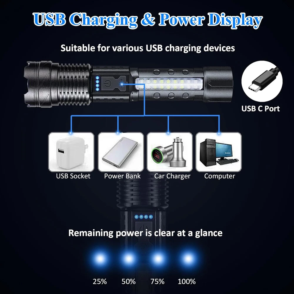 【1,000,000 Lumens Super Bright Tactical Flashlight】 Equipped with upgraded efficient laser Chip LED chips, Sogidon rechargeable flashlight emits a stable and super bright lighting. Since the light penetration is stronger than other same-level lamp beads', its beam can pass through dust and fog well, especially suitable for foggy and rainy days with low visibility. It can illuminate an 2200-square-foot room or focus on objects up to 3900 feet away. 【7 Light Modes & Zoomable Focus】 There are 7 modes of Sogidon rechargeable flashlight: High / Low / Strobe for the main light, and High / Low / Red / Red&Blue Strobe for the COB side light. Equipped with zoomable head, the small rechargeable flashlight high lumens can emit a powerful focused lighting and an extensive extended lighting by adjusting the light head. As its compact design, you carry this small handheld flashlight in your pocket or the car glove compartment. 【USB C Fast Charging & Power Indicator】 Built-in a 6000 mAh rechargeable lithium-ion battery and equipped with more energy-efficient chips, the rechargeable flashlight battery powered working time is up to 8 hours. The USB C fast charging input achieves 30% reduction in charging time. It can be charged by power bank, USB plug, etc, with the USB C charging cable. You can see the remaining power at the power indicator light. 【IPX6 Waterproof】 This flashlight head adopts the high grade black aluminium alloy, and the frame adopts the ABS plastic. The waterproof grade of this flash light reaches IPX6 Waterproof. This rechargeable flashlight is non-slip, shockproof, waterproof, rainproof, dustproof. It can work well in severe outdoor weather conditions, such as rain and snow. It is an ideal outdoor handheld flashlight for working, hiking, camping, repairing, hunting, and Sogidon fishing. 【Easy to Carry】 Led flashlight is equipped with lanyard and pocket clip, which can be hung on your wrist or attach to your pocket , backpack shoulder strap, hat and belt. 【Customer Service】Please charge before first use. We have 1 year free replacement service and 7*24 hours customer service. If you have any questions, please feel free to contact us. We will offer you a satisfactory solution. Product Description 1 High Power Flashlight 2 Zoomable Focus 3 Portable Clip How to turn on the COB Side Light? Long press the switch for 2-3 seconds. How to know the flashlight is fully charged? All Indicator lights are bright and not strobing when charged. What is the material of the light? The head is made of the hard aluminum alloy. And the frame is made of the durable ABS plastic. How to zoom the beam? Extend the flashlight head to zoom the beam of light. Please extend it harder for the first time!