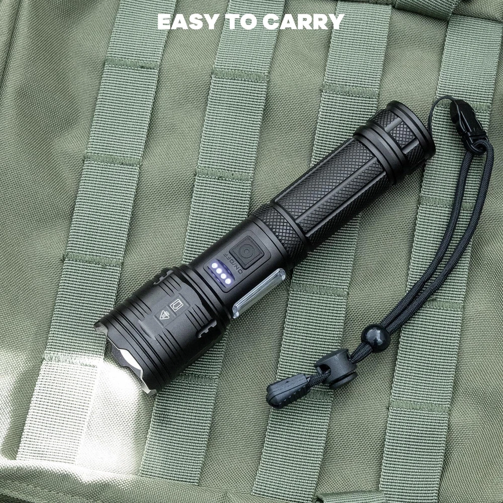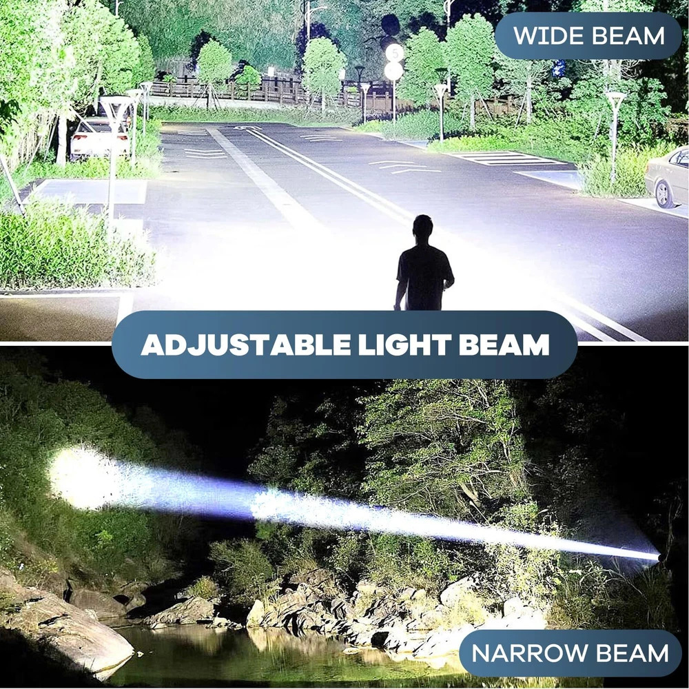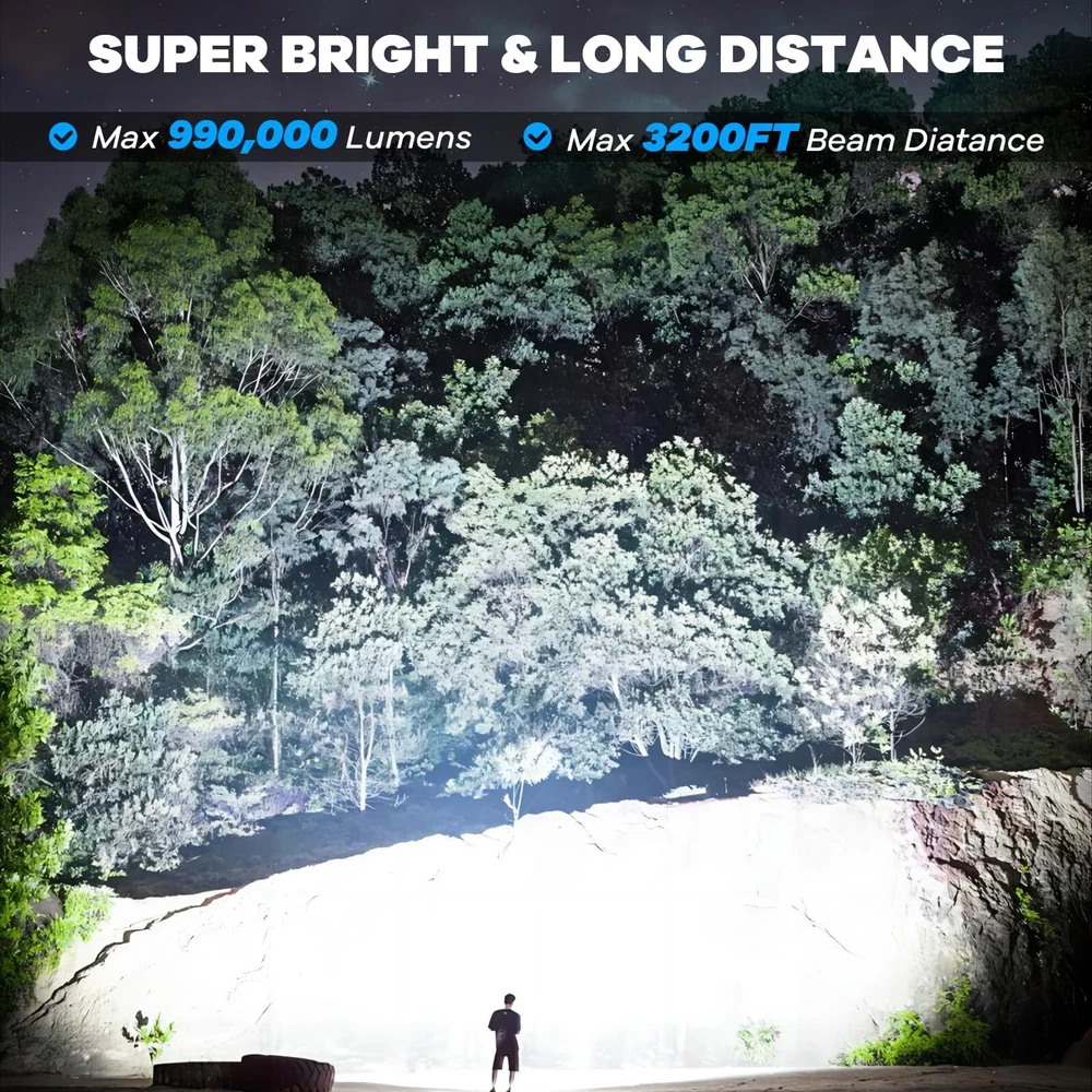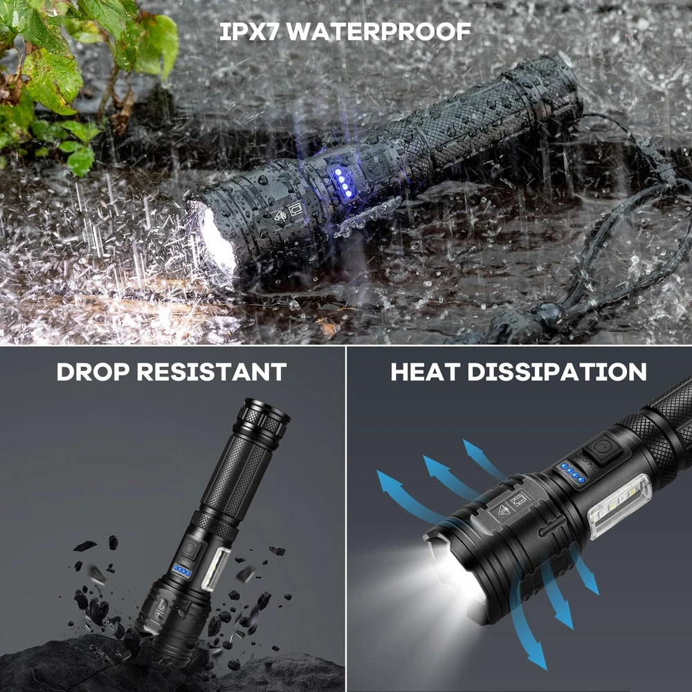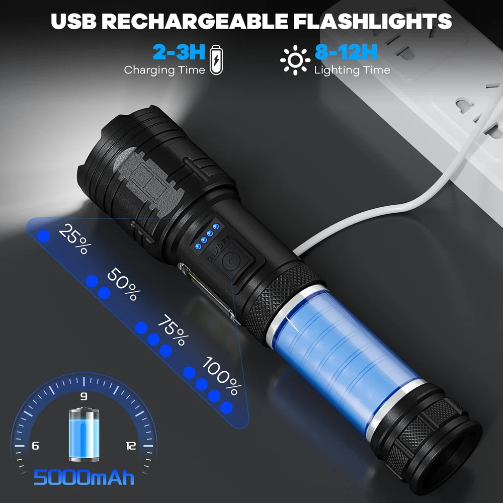 990,000LM Brightest Flashlight: Rechargeable flashlights high lumens adopt the newest upgraded LED chip, which can emit a super bright beam, enough to illuminate the range of a football field, and the illumination distance is up to 3200 feet. 7 Lighting Modes: High/Medium/Low/COB-White-High/COB-White-Medium/COB-Red/COB-Red-Strobe. Satisfy your multiple lighting needs 24H Using Time & Rechargeable: LED Flashlight is built-in large rechargeable ΒATTERY, the rechargeable flashlights will be used for 12 hours in main light low mode, and 24 hours in COB mode. Charging with the supplied USΒ cable (just 3-5 hours). The four blue indicator lights show the power life(25%,50%,75%,100%). Overcharge protection, Over-discharge protection, and Over-voltage protection make the flashlight have a longer service life of up to 200,000 hours IPX7 Waterproof & Suitable for Various Environments: Protect the waterproof flashlight from splashing water from all angles. It is suitable for the outdoor environment, and adverse weather conditions. Made of high-quality aluminum alloy material. It has a comfortable handle, making it pretty handy when you go hunting, boating, camping, walking dogs, cave exploring, searching, emergency time, and home use Adjustable Beam Function: Super bright flashlight will adjust the light beam by pulling/pushing the lamp head. Double-click the switch enter to COB side light, and long press to turn off the light in any mode What You Will Get: 2* powerful flashlights, 2* USB charging cables, 2* lanyards, and 1* user manual