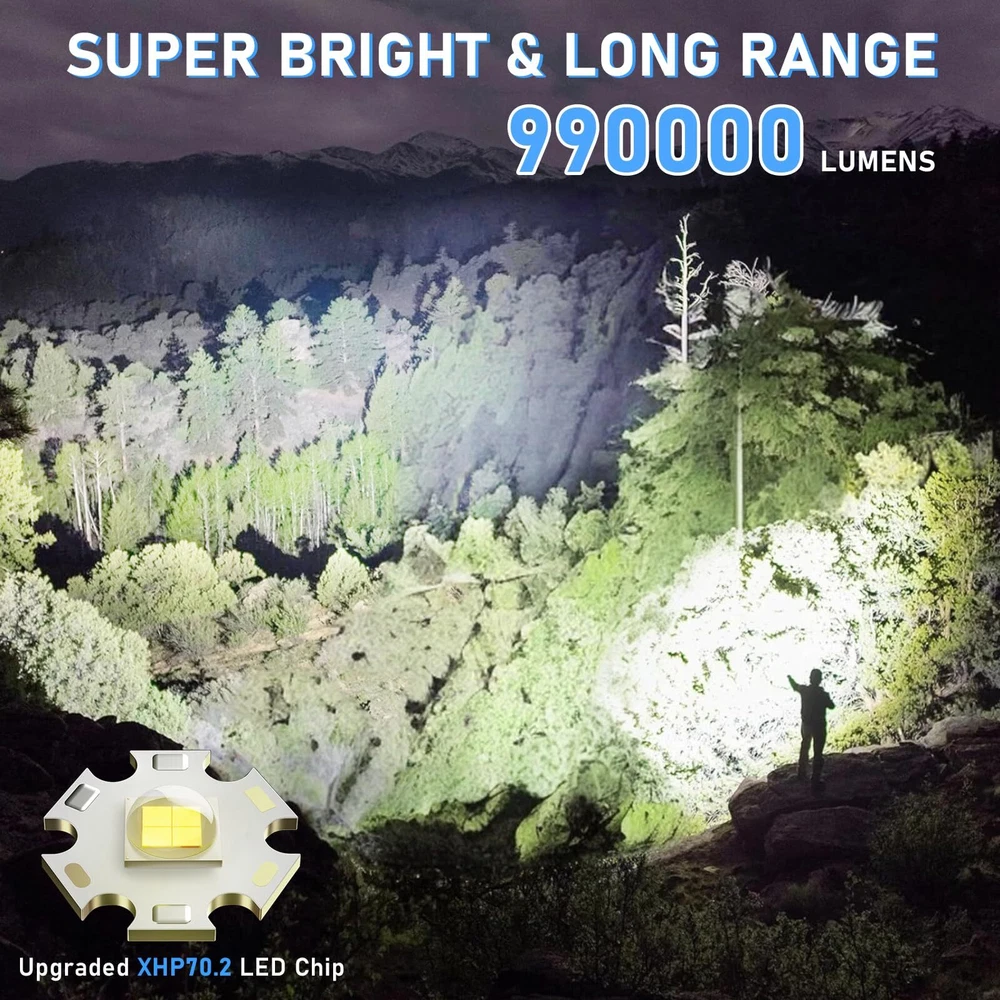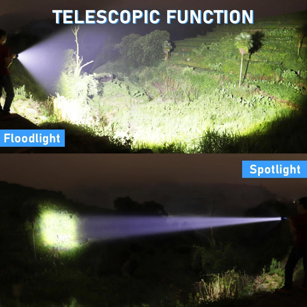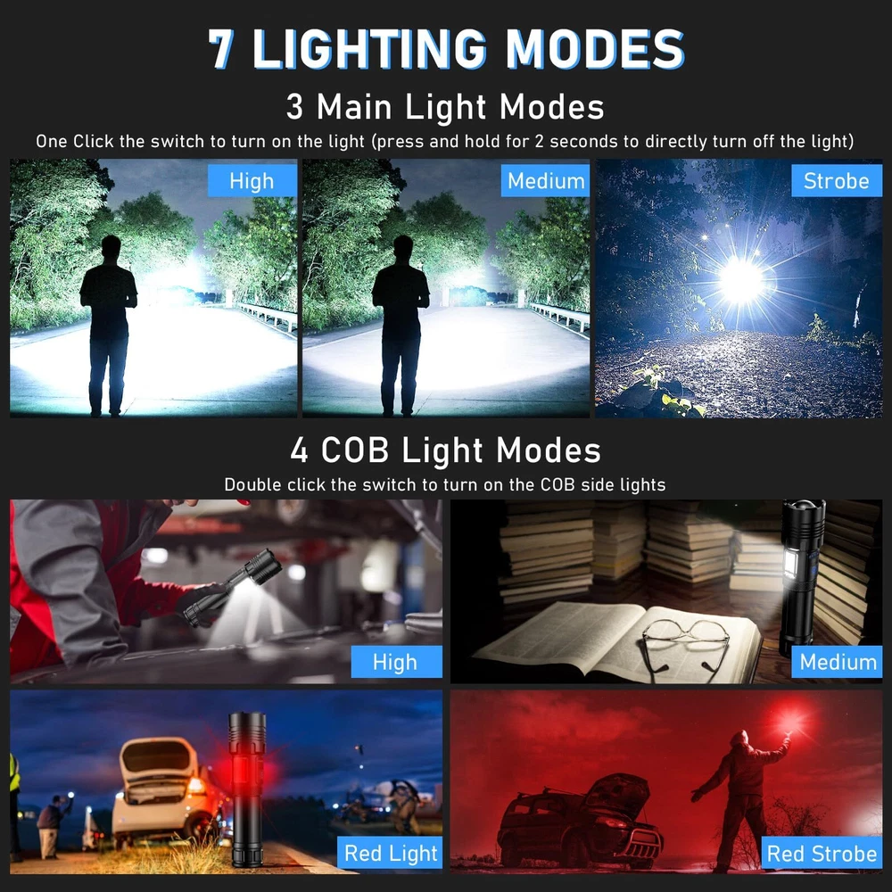 【SUPER BRIGHT LED FLASHLIGHT】: U1670 new flashlights high lumens is equipped with an upgraded XHP70.2 chip, which has a powerful output of 990,000 lumens, Instantly making the night you face into daylight. It projects an ultra-wide beam that illuminate areas up to 2160 square ft, easily lighting up your entire backyard. It can even illuminate objects 3,937 ft away. You can also adjust the focus range from spotlight to floodlight by stretching the head of the rechargeable flashlights. 【Upgraded 7 LIGHTING MODES FLASH LIGHT】: Unlike the common 5 modes flashlight rechargeable in the market, U1670 can be used for more occasions. Why? As the bright flashlight is equipped with a main led light and a COB side light, offering 2 lighting choices. The main led light includes 3 modes: High, Medium, Strobe. The COB side light has 4 modes: High, Medium, Red Light, Red Strobe. How to switch to COB light? Very easy: just press the button twice quickly no matter the main light is on or off. 【USB RECHARGEABLE & POWER INDICATOR】: The linterna recargable comes with rechargeable battery that provides up to 12 hours of runtime, with built-in short-circuit protection to extend battery life to 50,000 hours. The flashlights high lumens rechargeable also features a USB output for charging other electronic devices in an emergency. The power indicator also monitors the remaining power in real time, so you don't have to worry about suddenly running out of power. 【PREMIUM QUALITY MATERIAL & IP67 WATERPROOF】: Flash lights battery powered is made of high quality aircraft-grade alloy with an anodised anti-abrasive coating to ensure its durability and extreme impact resistance. It even can withstand being run over by a full-size truck, and still remain intact. With multiple waterproof and sealing treatments, dustproof and waterproof performance can reach the IP67 level. It can easily cope with extremely harsh environments such as heavy rains and sandstorms. 【2 PACK GREAT VALUE FLASHLIGHT KIT】:You will get:2* Powerful Flashlights, 2* Rechargeable Battery, 6* AAA Battery(with 2* White Battery Tubes, 2* AAA Battery Holder), 2* USB-C Cable, 1* Instruction manual, the Value Pack can meet your different needs. Moreover, also focuses on product quality, each handheld flashlight is subject to strict quality inspection. If you meet any problem, please feel free to contact our customer support team, we will provide you with the best solution.