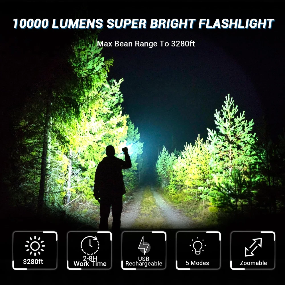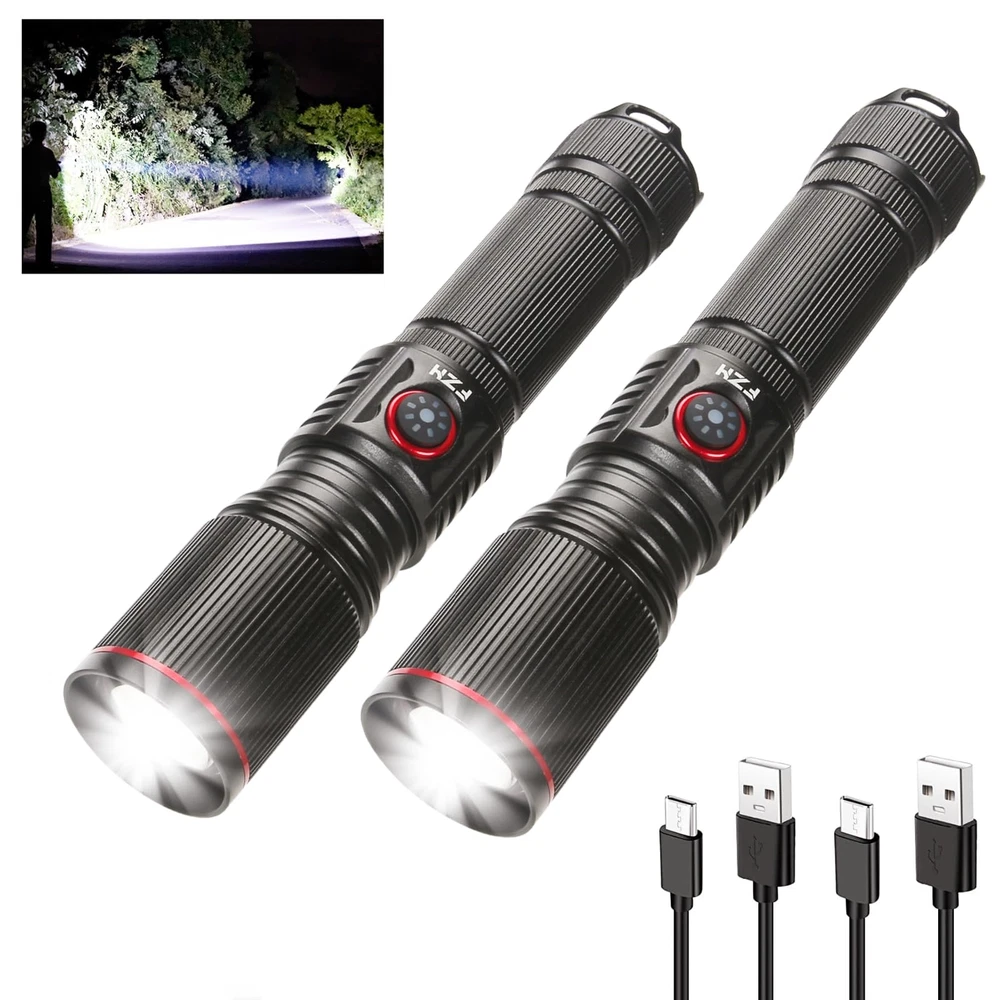 TIP:Please Open The Flashlight Remove The Insulating Piece To Use It 【Long Range & Zoomable Flashlight】The rechargeable LED flashlight comes with powerful LEP beads that provide up to 2000 lumens of output. It has a spotlight and floodlight mode, with the spotlight mode capable of illuminating objects up to 3,000 feet away and the floodlight mode capable of illuminating an entire room 【5 Modes & Infinite Dimming】 The rechargeable tactical flashlight can zoom has 5 modes: Strong - Medium - Low - Strobe - SOS,infinite dimming mode allows you to adjust the light brightness in any mode (long press on the power button the light goes from dark to bright flashing 2 times indicating the highest mode, from bright to dark flashing 2 times indicating the lowest mode),according to our needs, the freedom to choose a long distance to adjust the brightness mode or lighting focus range. 【USB Charging & Battery Display】The upgraded LED brightest flashlight has short charging time with overcharge and short circuit protection, and can be charged 100,000 times. It can work for 8 hours in low battery mode. Built-in USB C charging port can be charged through power banks, sockets and laptops, convenient for indoor and outdoor charging. Different color power indicator to know the power status at any time. 【Waterproof and Rugged】 The metal body of this functional high power camping flashlight is made of aircraft-grade aluminum alloy, and the flashlight has passed rigorous tests, 10-foot drops, and truck crushing, all of which continue to work properly. Perfect for use in rain, snow, home backup, night reading or sudden power outages. It is also great for hiking, camping, fishing, walking in the dark, emergencies or other outdoor activities. 【Quality Service】The kit includes GT10 flashlight x 2, Type-c x 2, user manual x 2 2200mah lithium battery x 2 Gift box x 1. We test each product before shipping to make sure each one works properly.We offer 30 days free return , if you have any problem,please feel free to contact us and we will provide the best solution for you within 24 hours.