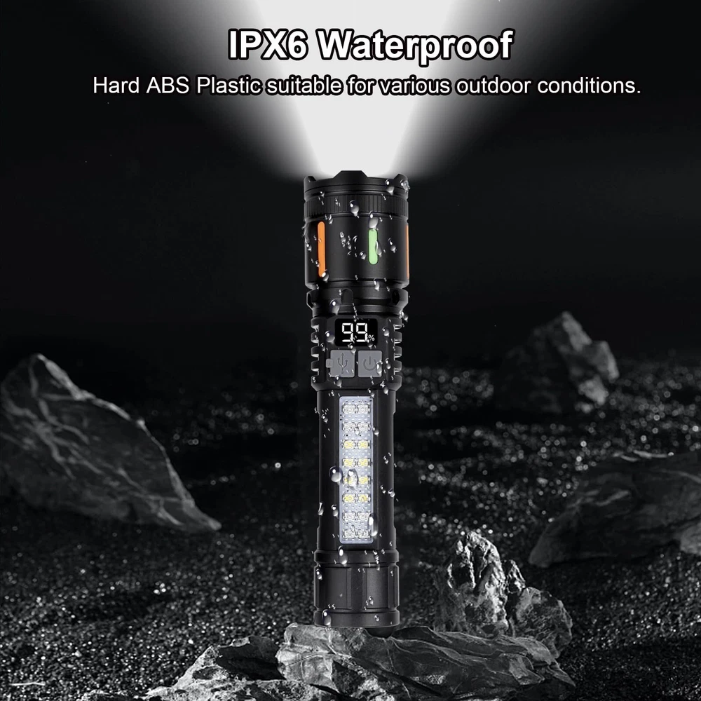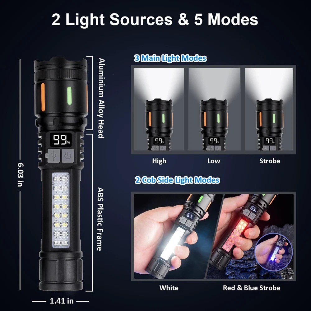 Flashlights High Lumens Rechargeable 3 PCS, 990,000 Lumens Led Flashlight Battery Powered with 5 Modes, Cob Side Light, USB C, Waterproof, Zoomable, Blue & Red Flash, Handheld Flash Lights 【990,000 Lumens Super Bright Flashlight】 Equipped with upgraded aggregative laser chips, rechargeable flashlight emits a stable and super bright lighting. Since the light penetration is stronger than other same-level lamp beads', its beam can pass through dust and fog well, especially suitable for foggy and rainy days with low visibility. It can illuminate an 2100-square-foot room or focus on objects up to 3700 feet away. 【5 Light Modes & Zoomable Beam】 There are 5 modes of rechargeable flashlights: High / Low / Strobe for the main light, and White / Red&Blue Strobe for the COB side light. Equipped with zoomable head, the small rechargeable flashlight high lumens can emit a powerful focused lighting and an extensive extended lighting by adjusting the light head. 【USB C Fast Charging & Digital Power Indicators】 Built-in an 4000 mAh rechargeable lithium-ion battery and equipped with more energy-efficient chips, the rechargeable flashlight battery powered working time is up to 4-7 hours. The USB C fast charging input achieves 30% reduction in charging time. It can be charged by power bank, USB plug, etc, with the USB C charging cable. You can see the remaining power at the digital power indicator clearly. 【IPX6 Waterproof】 This flashlight head adopts the high grade black aluminium alloy, and the frame adopts the ABS plastic. The waterproof grade of this flash light reaches IPX6 Waterproof. This rechargeable flashlight is non-slip, shockproof, waterproof, rainproof, dustproof. It can work well in severe outdoor weather conditions, such as rain and snow. It is an ideal outdoor tactical flashlight for working, hiking, camping, repairing, hunting, and fishing. 【Easy to Carry】 The rechargeable flashlights are equipped with lanyard, which can be hung on your wrist. As its compact design, you carry this small handheld flashlight in your pocket or the car glove compartment. 【Customer Service】Please charge before first use. We have 1 year free replacement service and 7*24 hours customer service. If you have any questions, please contact . We will offer you a satisfactory solution.