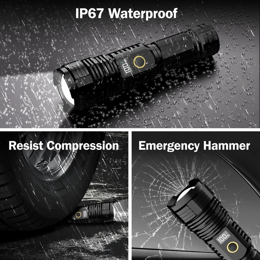【Flashlights High Lumens】The super bright flashlight is equipped with an upgraded longbeam LED chip, with a brightness of up to 990,000 lumens, 500% brighter than car lights. Our bright flashlight rechargeable can illuminate the darkness with ease, providing you with the brightness and clarity you need to see clearly. Suitable rechargeable flashlights for emergencies, home, outdoor camping, hiking. 【5 Modes & Zoom Flash Light】Our tactical flashlight has 5 working modes: High, Medium, Low, Strobe, SOS. Short press the power button to switch modes, long press for 2 seconds to turn off the powerful flashlights. Adjust the beam distance and light range by extending the top of the LED bright flashlight. The brightest flashlight rechargeable can light up to 2500 square feet area under floodlight or 3640ft distance under spotlight. 【Rechargeable Flashlights with LCD Digital Display】Super bright flashlight using an upgraded high-capacity battery can work for 15 hours. Tactical flashlights high lumens rechargeable with fast-charging Type-C port only take 3 hours to fully charge, increasing charging speed by 50%. With USB output port, powerful tactical flashlight can be used as a power bank. The newly upgraded LCD power display is clearly visible, so you can always easily and accurately grasp the remaining power of the brightest flashlight. 【IP67 Waterproof & Sturdy】Due to the built-in high tenacity seal rubber, the bright flashlight rechargeable reaches IP67 waterproof level. The flash light can be used in heavy rain, snow, and other harsh weather conditions. Made of aviation grade aluminum alloy, the flashlight is anti drop and shatter-resistant, so you don't need to worry about dropping the flash light. 【One-year quality assurances & Excellent Services】We are very confident that you will like this super bright flashlight. flashlights high lumens provide one-year replacement service and 7 * 24 hour excellent customer after-sales service. You can always message us through Amazon news if you have any questions, our professional team will immediately solve your problem. 【LED Flshlight Package】 You will get 1* Super Bright Flashlight, 1* High-capacity Rechargeable Battery, 1* Type-c Charging Cable, 1* Dry Battery Fix Bracket, 1* Carrying Lanyard, 1* English User Manual.