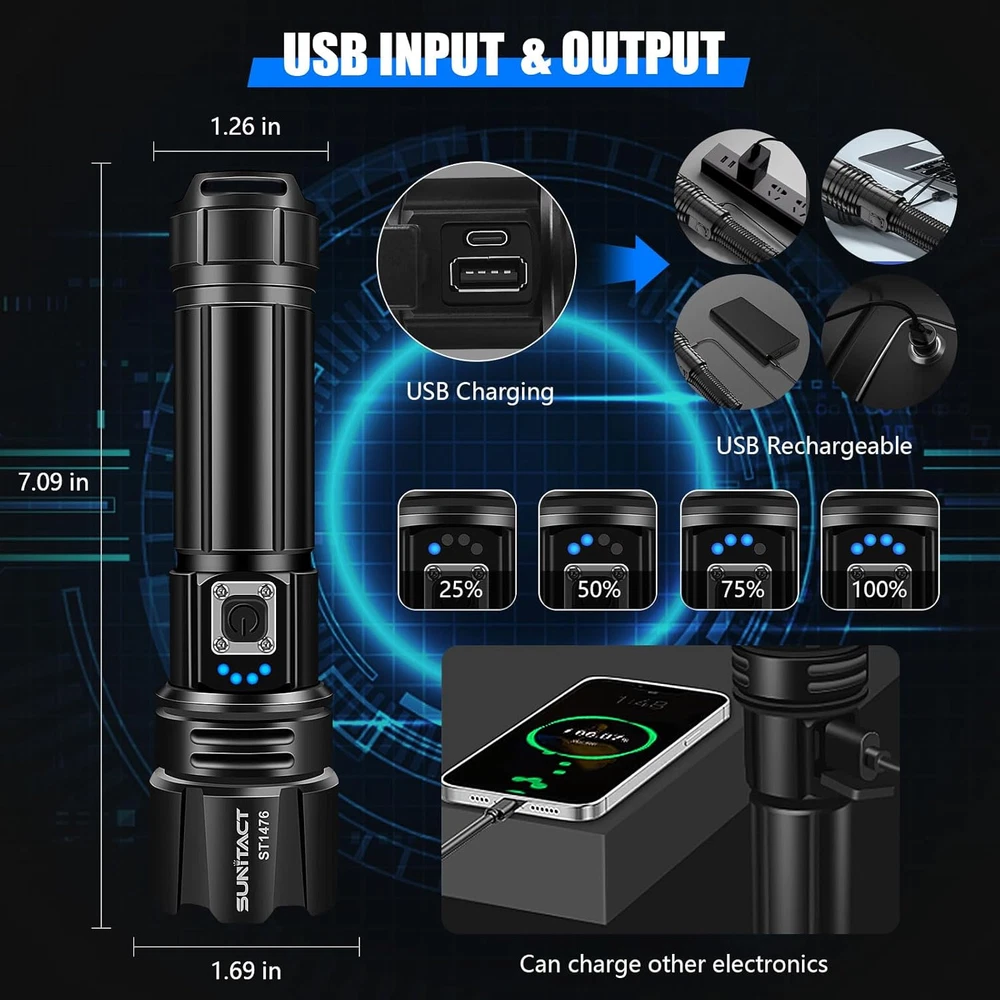 【990000 LUMEN LED FLASHLIGHT】: Sunitact ST1476 flashlights high lumens built-in advanced XHP70.2 LED chip, with a powerful 990000 lumens output, providing you the great light world you want, easily illuminates a 120 square meter room. we even can focus on objects up to 1000FT away, about the length of 3 football fields! And we can put all the parts in the gift box for easy carrying and storage. In additional, this bright flashlight is also an ideal gift for our friends or family. 【USB RECHARGEABLE AND POWER INDICATOR】: This rechargeable flashlights can provide up to 12 hours of runtime, with upgraded overcharge protection, it can be charged by usb cable(included). The flash light will stop charging when it fully charged, so that we don't need worry about the safety when we forget the flashlight is in charging. It can also charge the phone in an emergency. The power indicator above the flashlight helps you clearly understand the flashlight power (25%, 50%, 75%, 100%). 【ADJUSTABLE AND 5 LIGHT MODES】: This flashlights high lumens rechargeable has 5 lighting modes: High-Medium-Low-Strobe-SOS. According to our needs, we can stretch the head of the handheld flashlights to adjust the focus, freely choose long-distance observation and wide-range lighting. It is very suitable for camping, hiking, dog walking, fishing or any outdoor activities and emergency power-off backup. Long press for 3 seconds to turn off the light, no need to cycle all light modes. 【IP67 WATERPROOF AND PRACTICALLY INDESTRUCTIBLE】: Sunitact ST1476 IP67 waterproof LED flashlight is designed for rough handling. High-quality aerospace-grade aluminum alloy body protects the led flashlight rechargeable from rust or being scratched. After tests including freezing, underwater immersion and running over with a full-size truck and 10-foot drop, it still works! This high powered flashlight is durable enough in any situation, especially in rain, snow or emergency situations. 【FULL FLASHLIGHT KIT】: What you get: 1 x Sunitact ST1476 LED Flashlights High Lumens, 1 x USB charging cable, 1 x Lanyard and Flashlight holster, 1x Operating instructions and Gift box. We have carefully checked all flashlight rechargeable before shipment and ensured that the products are working properly. Most importantly, we provide 7*24 hours customer service. If you have any questions, please feel free to contact us. Product Description SUNITACT ST1476 SUPER BRIGHT FLASHLIGHT - LIGHT UP YOUR LIFE INSTANTLY! The adjustable focus of the Sunitact high powered flashlight allows you to choose the focus between spotlight and floodlight. Spotlights illuminate a longer distance, and floodlights illuminate a larger area. A stable and bright beam can be formed within 1000 meters. About Sunitact Sunitact focuses on the development, manufacturing and sales of outdoor sports lighting tools. We are brand sellers and our flashlights are sold all over the world. We continue to improve the quality of flashlights and provide customers with an excellent lighting experience. In any mode, we can press and hold the button for 3 seconds to turn off the flashlights high lumens rechargeable. Sunitact ST1476 XHP70.2 LED Flashlights High Lumens WHAT YOU WILL RECEIVE: 1 * Sunitact ST1476 Rechargeable Flashlights with Charging Cable 1 * Rechargeable Battery 1 *3 AAA Battery with White Battery Tube and Battery Holder 1 * Flashlight Holster and Lanyard 1 * Operating Instructions and Gift Box XHP70.2 SUPER BRIGHT FLASHLIGHT POWER DISPLAY & USB RECHARGEABLE WATER RESISTANT & VIRTUALLY INDESTRUCTIBLE ADJUSTABLE FOCUS & 5 LIGHT MODES SUPER HEAT DISSIPATION DESIGN POPULAR USE FOR HOME & WORK & OUTDOOR HOW TO INSTALL THE BATTERY? USB INPUT AND OUTPUT & POWER INDICATOR Connect the Cable (include) with all kinds of USB devices such as car sockets, computer, laptop,etc, it is convenient in any outdoor activities. Sunitact rechargeable flashlights can also be used as mobile power supplies to charge your device in an emergency. The power indicator can display accurate flashlight power (25%, 50%, 75%, 100%), and no longer have to guess the remaining power of the flashlight. XHP70.2 SUPER BRIGHT LED FLASHLIGHT Sunitact ST1476 LED flashlight adopts an upgraded version of XHP70.2 chip, which can provide up to 10,000 real lumens and incredible brightness. Its ultra-wide beam can illuminates the entire backyard effortlessly, and it can be focused up to 1,000 feet away. UPGRADED RECHARGEABLE FLASHLIGHT The rechargeable flashlights has been completely upgraded, the ultra-wide beam lasts for up to 12 hours of lighting in medium brightness mode. It provides overcharge, overdischarge, and overvoltage protection, super heat dissipation capacity, which is safer to use, and its service life can reach 100,000 hours. It takes about 6-8 hours to fully charge. 5 LIGHT MODES This high powered flashlight has 5 light modes: High/ Medium/ Low/ Strobe/ SOS, which can meet your various needs in daily life. Easy to change modes by pressing the switch button gently. Press for 3 seconds to turn off the light in any mode. IP67 WATERPROOF & DURABLE Made of high-quality aviation-grade aluminum alloy, it protects your flashlight from scratches, corrosion, rust and damage. IP67 waterproof, can withstand all kinds of extreme weather such as storm and heavy snow (do not immerse in the water for a long time). Goreit A IDEAL KIT FOR CAMPING, DOG WALKING, FISHING, HIKING, POWER OUTAGES, EVERYDAY USE, BACKUP, EMERGENCY, ETC、