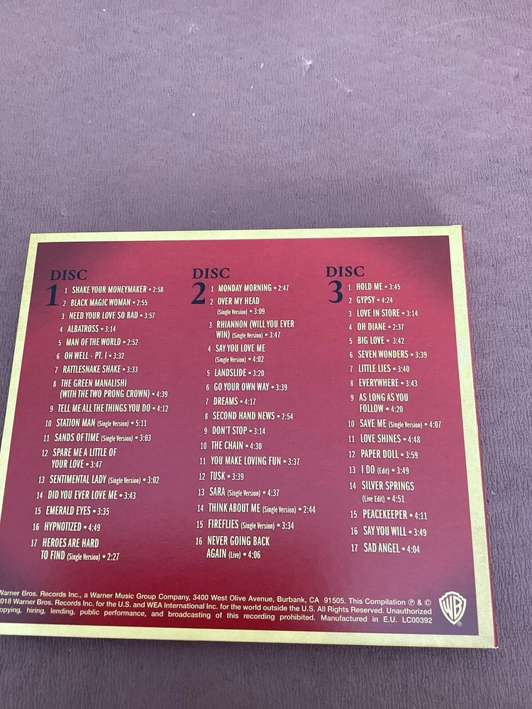 Format:3 x CDEAN:Does not applyRelease Title:50 Years Don't StopType:AlbumCase Type:Triple Jewel Casegtin13:Does not applyFeatures:SealedRecord Label:Warner Bros.Release Year:2018Artist:Fleetwood MacOccasion:New Year