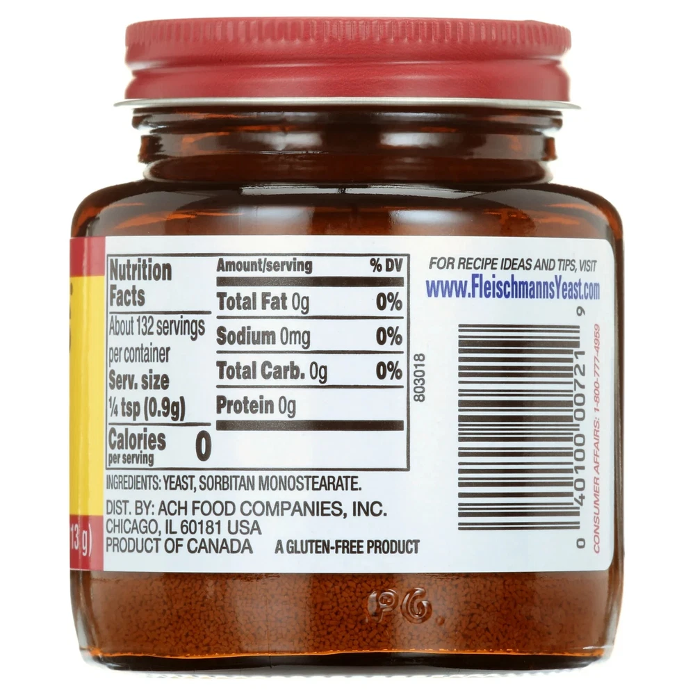 Fleischmann's Active Dry Yeast, 4 oz. Fleischmann's Active Dry Yeast comes in a convenient jar that is equivalent to 16 packets of yeast. Fleischmann's active dry yeast packets aim to deliver reliable results, based on over 150 years of experience. This product is gluten-free and contains none of the major allergens making it suitable for a variety of dietary restrictions. The Fleischmann's instant dry yeast is well-suited for making homemade bread. The yeast is simple to use and simple to dissolve it into warm water. Simply knead, shape and bake. Coming in a convenient resealable jar, for best results, it should be stored in the refrigerator and used within six months after opening. Fleischmann's Active Dry Yeast, 4 oz Highly Stable and Reliable: Provides consistent results for your favorite bread recipes and baking treats Size and Packaging: Convenient to use jar that is equal to 16 of our packets Dissolution Required: Dissolve in warm liquid (100–110°F) before use Not for Instant/RapidRise Recipes: Our Active Dry Yeasts are specifically not recommended for recipes that call for Instant or RapidRise yeast Gluten-Free: This product is gluten-free and contains none of the major allergens making it suitable for a variety of dietary restrictions Instructions Tips for better baking: Refrigerate and use within 6 months after opening, but no later than date on cap. For best results, use a thermometer to gauge temperature of liquids. To dissolve, stir 2-1/4 teaspoons active dry yeast into 1/4 cup warm water (100 degrees to 110 degrees F). To proof (foam) yeast, stir in 1 teaspoon sugar; let stand for 10 minutes. If mixture doubles in volume, yeast is active. Rising tips: set covered dough in warm place (80 degrees to 85 degrees F). As an alternative, place bowl or pan of covered dough on rack over large pan of hot, steaming water. Refrigerate after opening, then use within 6 months. Safe Handling Instructions SAFETY BUTTON POPS UP WHEN ORIGINAL SEAL IS BROKEN
