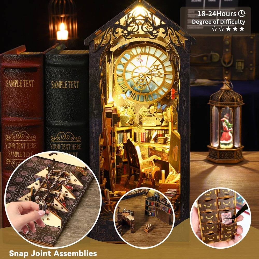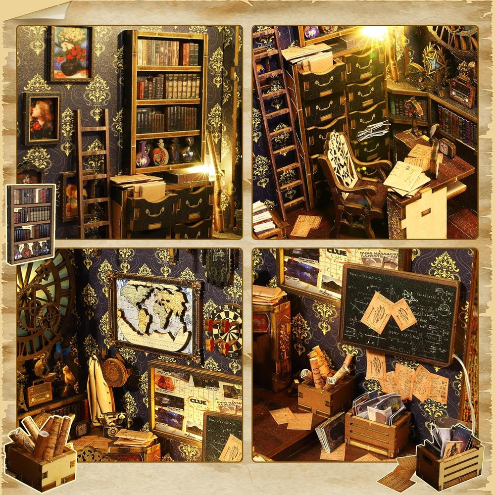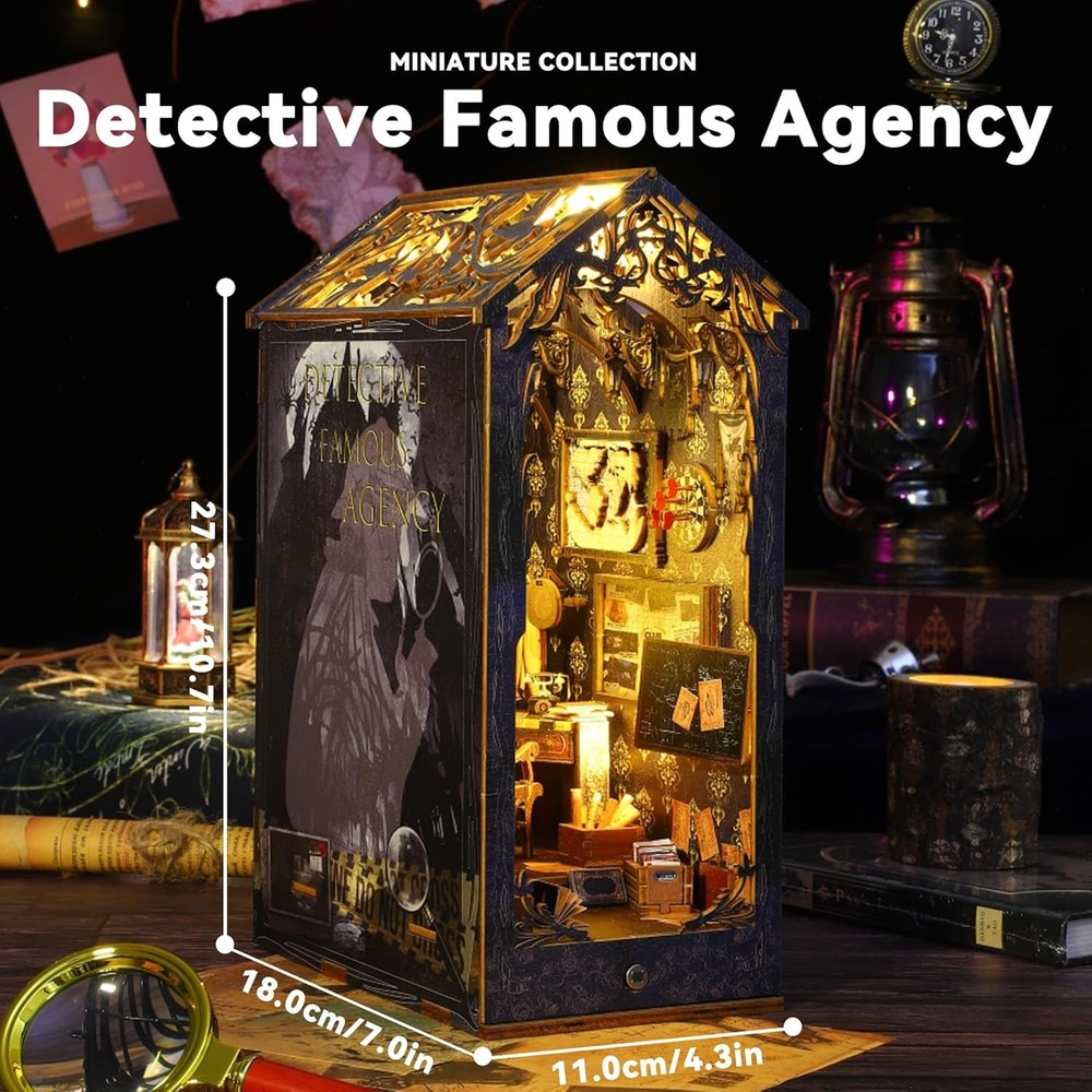 Flever Dollhouse DIY Book Nook Miniature Kit, Detective Famous Agency Product Details Product Dimensions: 7.1 x 4.5 x 10 inches Item Weight: 1.9 pounds Country of Origin: China Item model number: SL07 Manufacturer recommended age: 14 years and up Manufacturer: Flever 【Material list】The assembly is suitable for people older than 14 years and need patience to assemble by yourself! The Kit includes: 1) pre-cut MDF wooden pieces for the house structure and furniture 2) fabric and printed paper for decorations and accessories 3) plexiglass pieces for the dust cover 4) LED light wires and music movement 5) English Manual 【Immersive DIY Experience】Immerse yourself in a captivating DIY project that whisks away stress and anxiety. Building this book nook is a relaxing journey into a miniature world, helping you unwind as you craft each tiny detail. It's an enjoyable hands-on escape from the daily hustle, leaving you with a clear mind and a big smile. 【Great for Family & Friends】Assembling our book nook kit is a wonderful activity to share with family or friends. Work together to create the miniature scene and enjoy quality time filled with teamwork and fun. It’s a delightful way to connect with loved ones, spark creativity, and make cherished memories. And once you've placed the final piece, everyone can share in the pride and sense of accomplishment of building something amazing together. 【Thoughtful Gift for Any Occasion】Surprise someone special with a gift that stands out. This DIY book nook kit is an imaginative present for relatives, friends, or colleagues. It provides not just an enjoyable crafting experience but also a charming finished piece that celebrates their love of books and creativity. Perfect for birthdays, holidays, or just because – it's a gift that shows you truly care. 【Eye-Catching Bookshelf Decor】Once built, this book nook becomes a stunning décor piece for your bookshelf, office, or living room. The miniature scene comes to life with warm LED lights, creating a cozy, magical atmosphere among your books. It’s sure to catch everyone’s eye and add a touch of wonder to your home or workspace, elevating the ambiance of your space. 【Premium Quality & Support】We ensure a hassle-free building experience from start to finish. Each kit is made with high-quality, precision-cut materials and comes with clear instructions. If you have any questions or encounter issues during assembly, our friendly after-sales support is always ready to assist. Build with confidence knowing we've got you covered every step of the way.