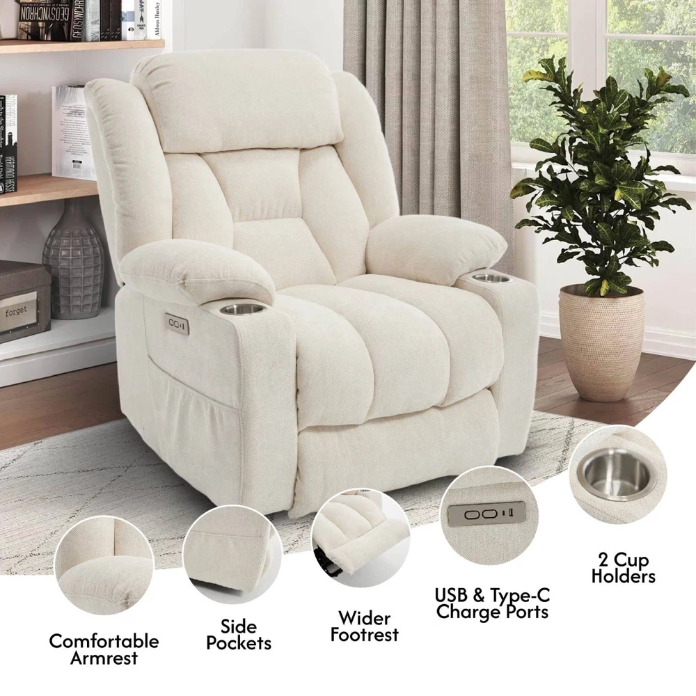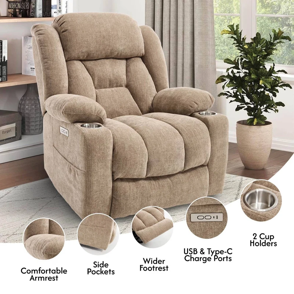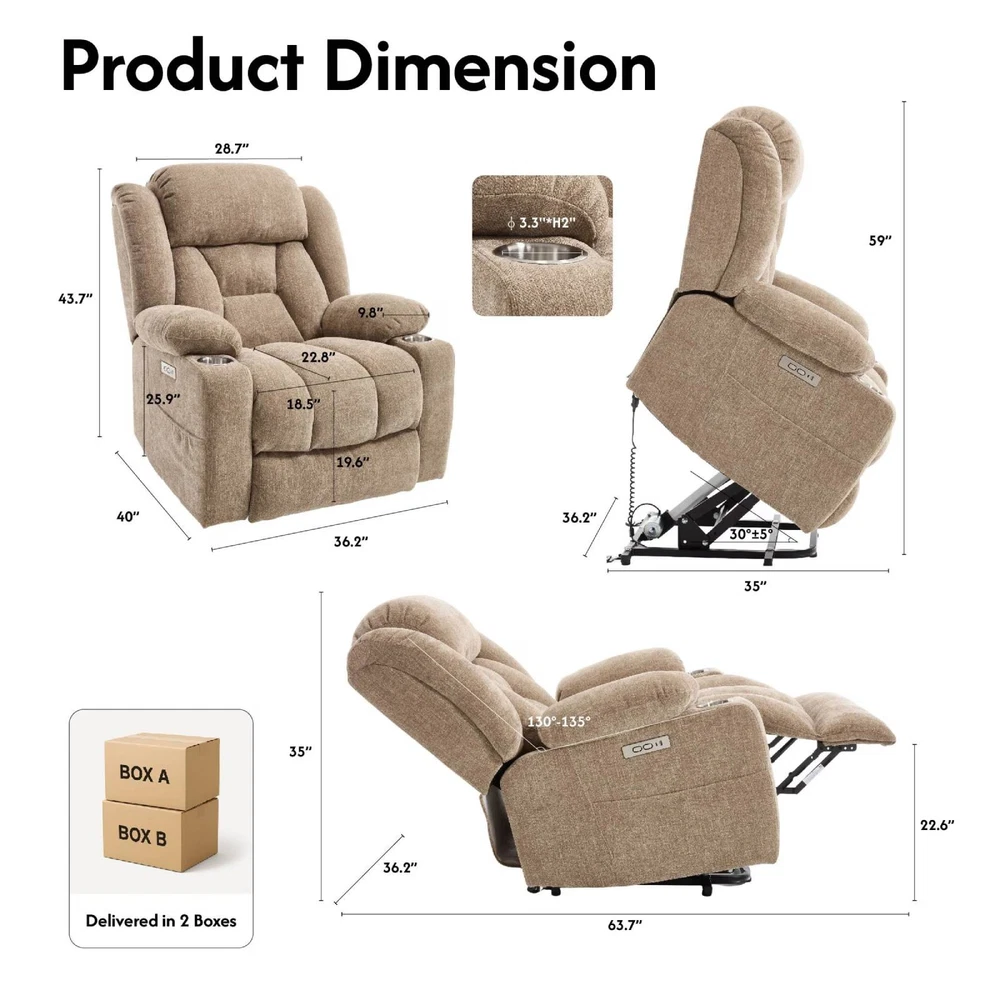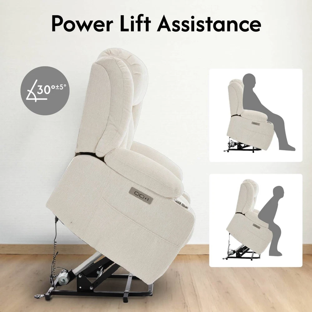 Home Payment Shipping Return Policy About Us Contact Us Feedback Title Other Standing Desk Desk Riser & Desk Converters Desk Bike Ergonomic Office Chair Fitness ACTIVESIT Cross Legged Office Chair, big Armless Swivel Home Office Desk Chair Relax and unwind in comfort with FlexiSPot electric lift chair. Designed for seniors and anyone needing assistance standing, our Fabric recliner offers custom massage settings, heating therapy, soft chenille upholstery, and multiple convenience features including USB ports, storage pockets, and cup holders. Easy to assemble and built to last — a ideal upgrade for your living room, bedroom, or home theater. Effortless Power Lift for Seniors – Lift or recline smoothly at the touch of a button. Designed to reduce pressure on the back and knees with a quiet, gentle 140° reclining lift mechanism. Custom Massage & Heat Therapy – Features 8 vibration points, 3 modes, 3 intensity levels, and lumbar heating to help relieve tension, improve circulation, and enhance relaxation. Soft & Durable Chenille Upholstery – Plush, skin-friendly fabric with thick cushioning and a reinforced metal frame supports up to 300 lbs for lasting comfort and reliability. Convenient Design for Everyday Use – Includes USB-A + USB-C charging ports, dual cup holders, and side pockets for phones, remotes, magazines, and other essentials. Easy Assembly – Hassle-free installation with clear instructions. Set up in minutes and enjoy your new recliner with confidence. Specifications: Color: Beige/Brown Main Material: Wood, Metal, Fabric Seat Dimension: 22.8"(D) x 18.5"(W) x 19.6"(H) Weight Capacity: 300 lbs Max Reclining: 135° Special Features: Massage, Heat, Side Pocket, USB & Type-C Charge Port