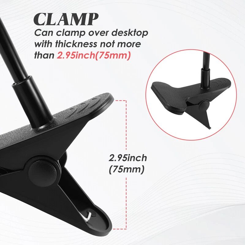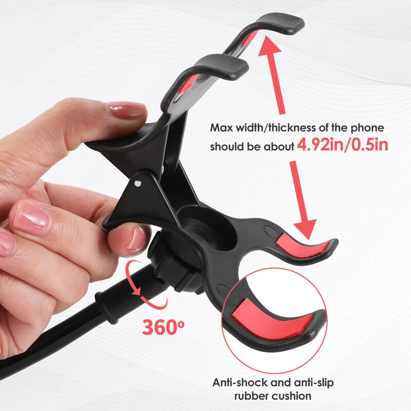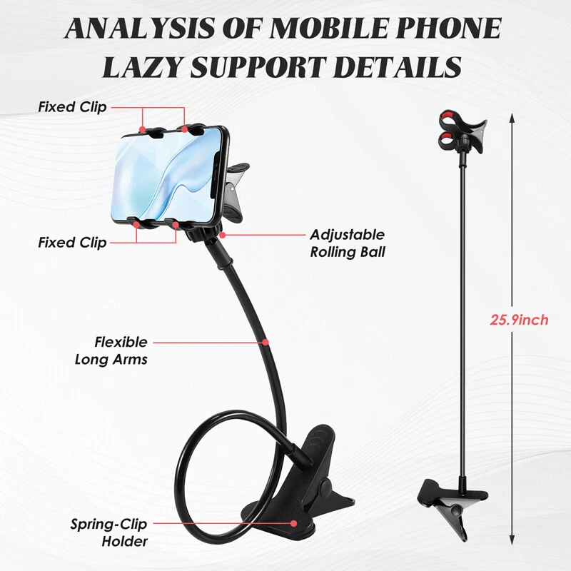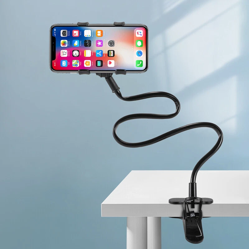 Flexible Lazy Bracket Mobile Phone Stand Holder Bed Desktop For iPhone Samsung Description The universal smartphone desk grip mount fits for most mobile phones. It has four clamps that sink in to grab your device for a strong stable hold. Attractive rubber pieces carefully hug your smartphone's body safely. A flexible long wire can be adjusted to any comfortable viewing angle or distance you desire. Mount to side of a table, desk, door, etc. via a sturdy metal spring clamp. Features: Lazy Bed Desktop Car Mount Phone Holder. Universal holder for Mobile Phone, MP3, Digital Camera, GPS, cameras etc. Watch movies / videos, Listen music on the bed without holding your phone! Flexible arm for different angle and distance. Specification: Material: Plastic + metal Length: 66cm (Approx) Flexible Arm length: Max. 600-660 mm/23.6”-25.9” Clamp for Phone: <125mm/4.92"(Width of the device) Clamp for Bed(Table): <75mm/2.95"(Thickness of the bed or table) Color: Black / White Package Included: 1x Lazy Bed Desktop Car Mount Phone Holder