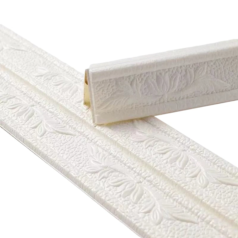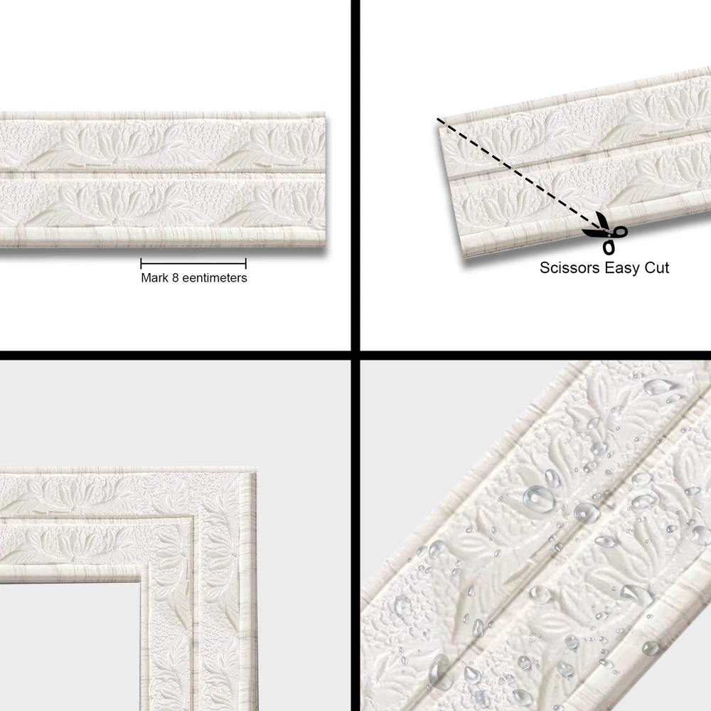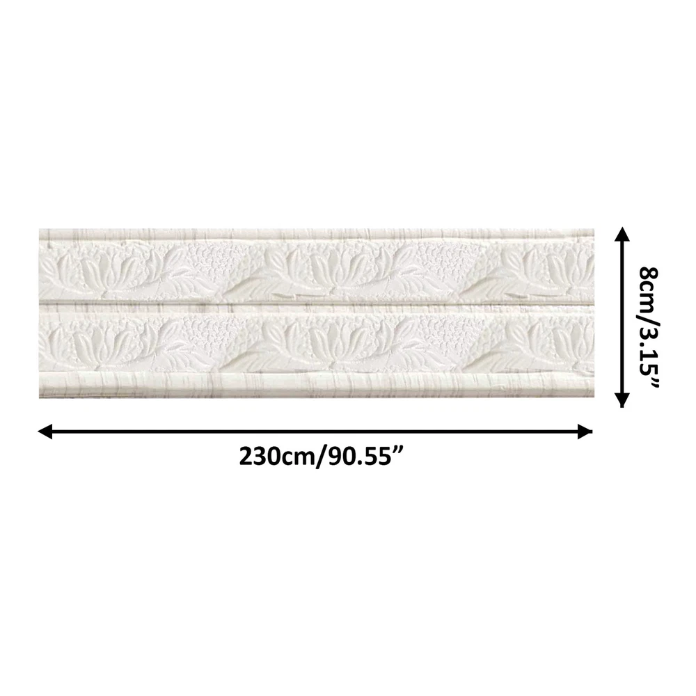 Bullet Points: Safe and Durable: The 3D Foam Flexible Molding Trims are made of high-quality PE material, it is anti-collision, anti-moisture, and anti-kick. Colors will not fade or deform over time. Uniform Adhesive: The 3D Foam Wall Trim Moldings are ideal for exterior and interior applications. It will last for a long time and leaves no sticky residues when peeled off with Self-Adhesive Design. Easy Operation: The Self Adhesive Foam Molding Trim is simple to install. Just peel off the backing and stick it on a smooth surface without other special tools. Reliable and Practical: You can cut the 3D Foam Wall Trim Molding to your desired length. It can be applied to all flat and smooth surfaces. The high viscosity is durable and easy to use. Scope of Application: These Foam Flexible Molding Trims can be used in home decors such as walls, door frames, doorways, stairs, TV backdrops, murals, ceilings, windows, wall cabinets, and more. It will give your home an elegant look. Description Our 3D Pattern Foam Stickers are made of high-quality materials that are flexible, waterproof, durable, and non-hazardous. You can use them to make some DIY decorations for your home. This is ideal for decorating bathrooms, bedrooms, kitchens, TV backgrounds, ceilings, borders, cabinets, mirrors, and more. Specifications Name: Self-adhesive Waterproof Skirting Waist Line Material: PE Color: white Specifications: Self-adhesive on the back Size: about 230x8cm/90.55x3.15in Packing list 1 x Wallpaper Border