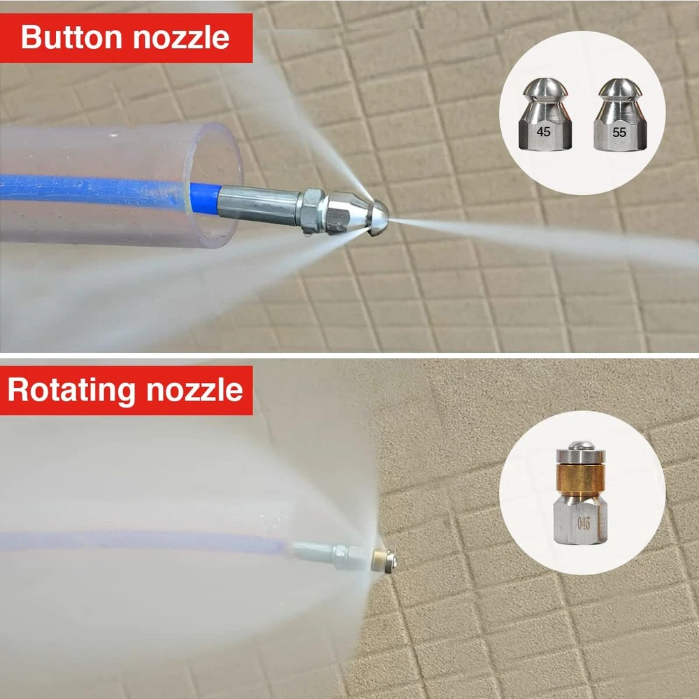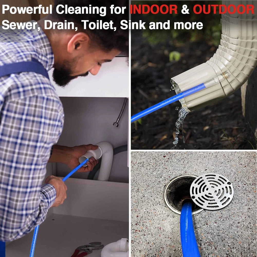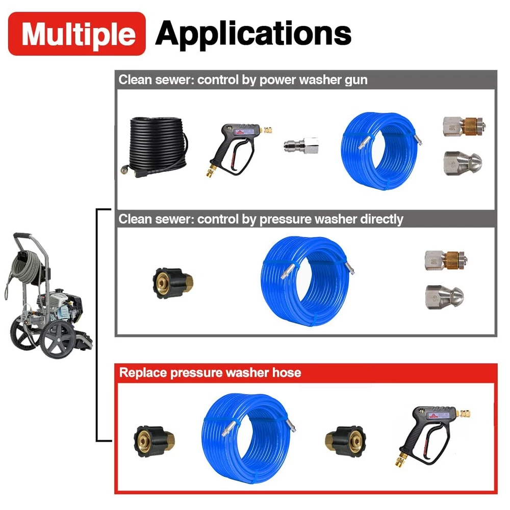 [Scrub Away Grease] 150 FT sewer jetter up to 4000 PSI working pressure & 10000 PSI burst pressure. Cleans household sewer drains, landscape drains, septic field lines, and more. Scrub away grease, sanitary paper, septic sludge, yard debris, ice, and other clogs. With M22-14mm adapters, it's a great for high pressure washer hose. [Easier to through] High-quality polyurethane jackets produce lower friction which avoids the layer being damaged due to friction in the bend, and easier to slide through tricky corners in the sewer. [Acid and Alkali Resistance] OEM standard quality polyurethane inner and outer pipe, performance better corrosion-resistant and could adapt to different acid and alkali environments. Improve better wear-resistant, oil-resistant and 3X longer service life than a normal plastic sewer jetter hose. [Flexible Than Others] Flexible sewer jetter hose and smaller turning radius for easier insertion in more types of drains. Ideal for cleaning around the corner, with a shorter but strengthen head and a flexible hose body, helps you unclog above 2.75" ID narrow and curved main drains, landscaping drains, or curved sewer and scrub the sides of dirty pipes and flush out the blockage in the sewer. [ECO-Material] pressure washer Hoses comply with environmentally-friendly RoHS standard and are made of recyclable material to protect your and earth clean. If you need any help, please feel free to us at any time, we're online 7x24.