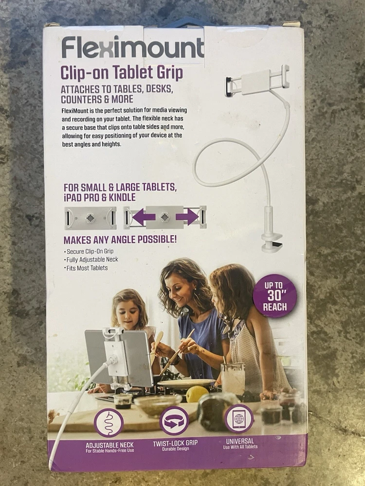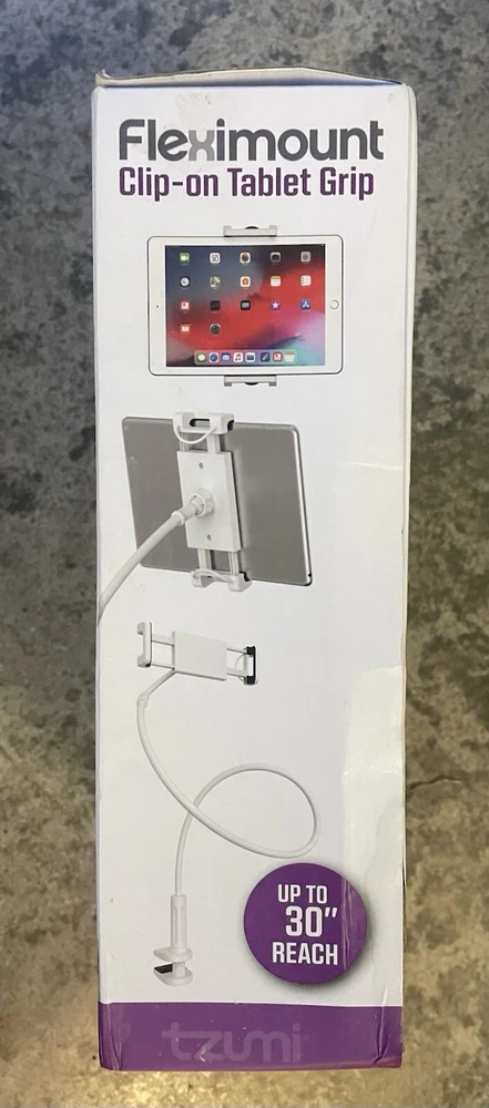 The Tzumi Fleximount Clip On Tablet Holder is a white desktop stand designed to securely grip tablets such as iPads. It is compatible with various brands including Apple, LG, and Samsung, and features a 360° flexible design for adjustable viewing angles. Made of plastic and metal, this mount can be easily attached to a desk for convenient hands-free use. Perfect for watching videos, reading, or video calls, this tablet holder provides a stable and secure grip for your device.