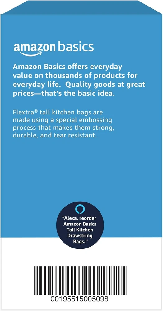 Tall kitchen trash bags in Unscented (50-count), each with a 13 gallon capacity Tear-resistant white plastic material with reliable Flextra strength. Flextra technology embosses the trash bag with a flex pattern, to better control the stretch of the bag to assist in minimizing tears and punctures Red drawstring closure for easy tying and carrying Alexa voice shopping enabled: to place your next order, just say, “Alexa, reorder Amazon Basics Tall Kitchen Drawstring Bags" Product Description Amazon Basics Flextra Tall Kitchen Drawstring Trash Bags, White trash bag with red drawstring closure for easy tying and carrying Flex-tra strength From the Manufacturer Amazon Basics