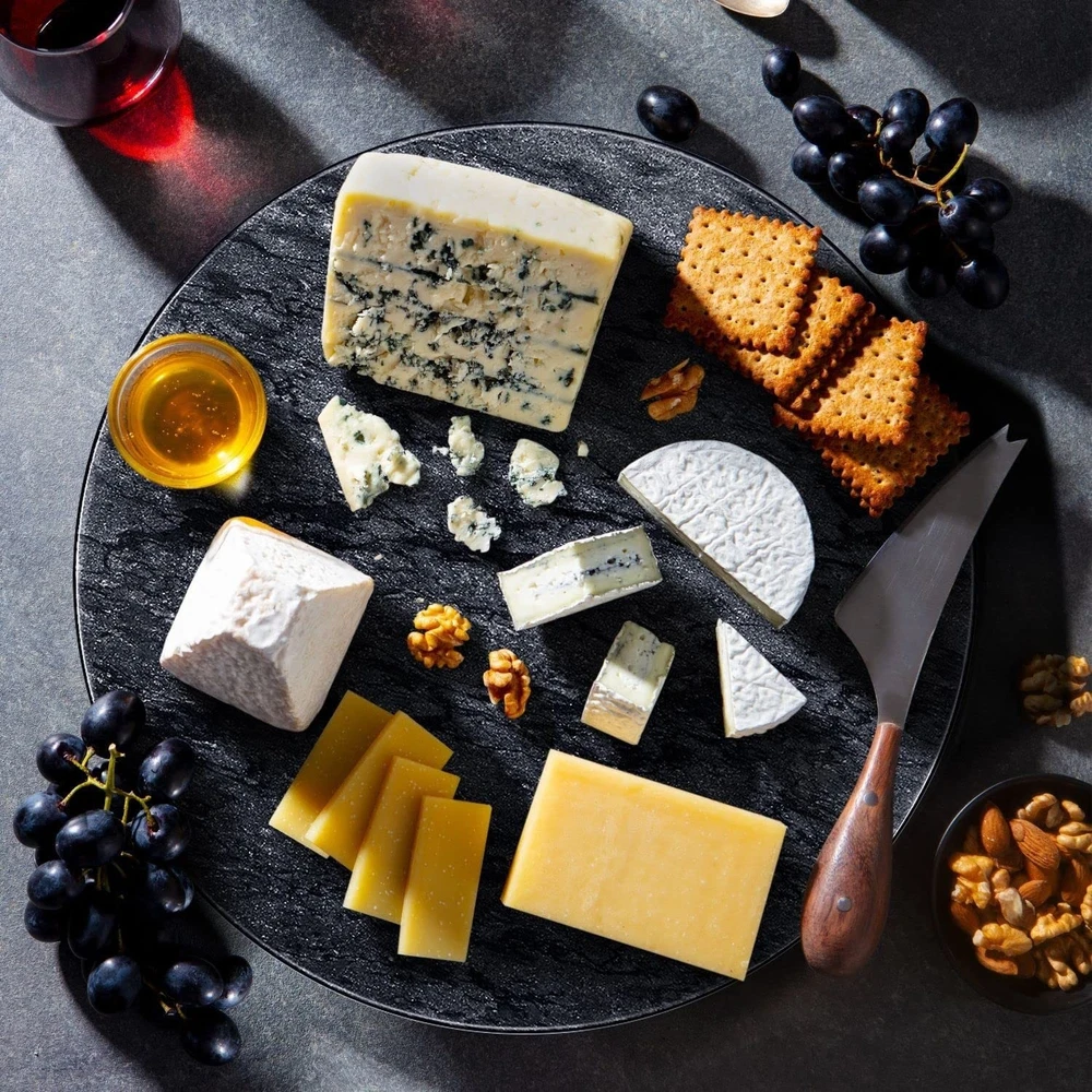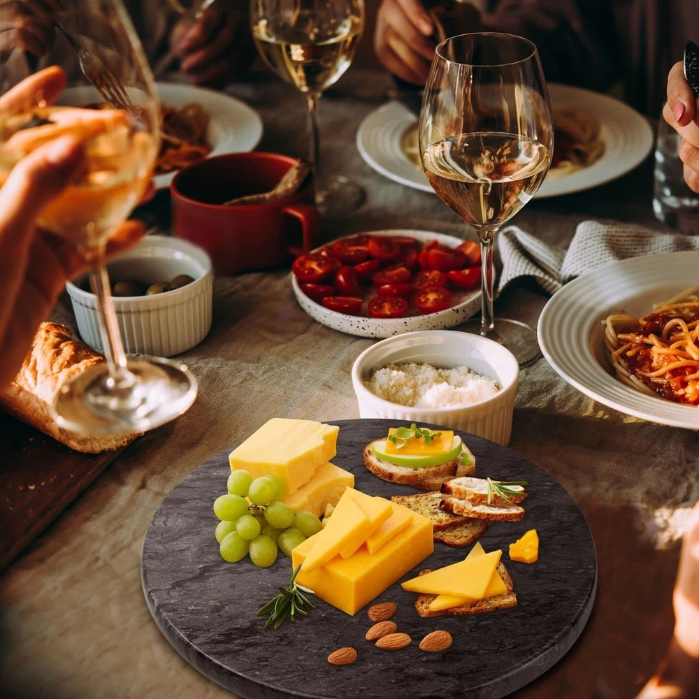 Serve your sweet and savory choice with our charcuterie board, and achieve an effortless presentation that brings everything together. Typically, a charcuterie board includes a variety of cured meats and cheeses, such as salami, prosciutto, Brie, and Gouda, in addition to additional small bites like hummus, jam, bread, honey, fruit, and edible flowers. The wonderful thing about a platter of ready-to-eat finger foods is that you can put one together without needing a lot of culinary expertise. However, it can take some experience to get the presentation just right. With our marble charcuterie board, you can show friends and family your charcuterie with a mouth-watering display and a touch of class. Each cheese board marble has a unique design because of the natural grains of marble, making each piece one-of-a-kind. The simple and beautiful design will look great on your table, coffee table, or countertop. This marble pastry board is easy to clean. When finished, you can wipe it with a damp towel or hand wash it with soap and water. Specification: Material: Marble Diameter: 12 inch Weight: 9 lbs (4.1kg) Package Content: 1x Round Marble Cheese Board - 12 Inch Black Marble Serving Board for Charcuterie, Cheese, Cutting, Pastry, Trivet - Non-Stick and Heat Resistant Marble Board Round Cheese Board - Beautiful and elegant 12-inch round marble serving board. Displays your charcuterie with class, perfect for displaying bite-sized bread, jam, fruits, cured meats, brie, and gouda cheese Pure Marble - Round cheese board in cool marble adds a touch of class to your table and counter. Can also be heated up to 200-degree Fahrenheit to keep food warm. Each board is unique due to natural grains of marble Elegant & Functional Serving Platter - Exceptionally smooth surface, great for parties or gatherings. Can be used as a serving platter, cutting board, or cake stand. Features non-slip rubber feet to keep the board in place Convenient to Use - Excellent at holding temperatures cold and warm for perching food. Offers a nifty surface to store cheese, chocolates, or meat. The Marble board will not absorb food smells Easy to Clean - with a Non-porous surface to prevent food from sticking to the marble trivet. To clean, gently hand wash with soap and water. Wipe down excess moisture before storing