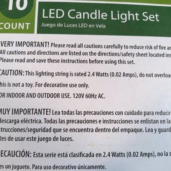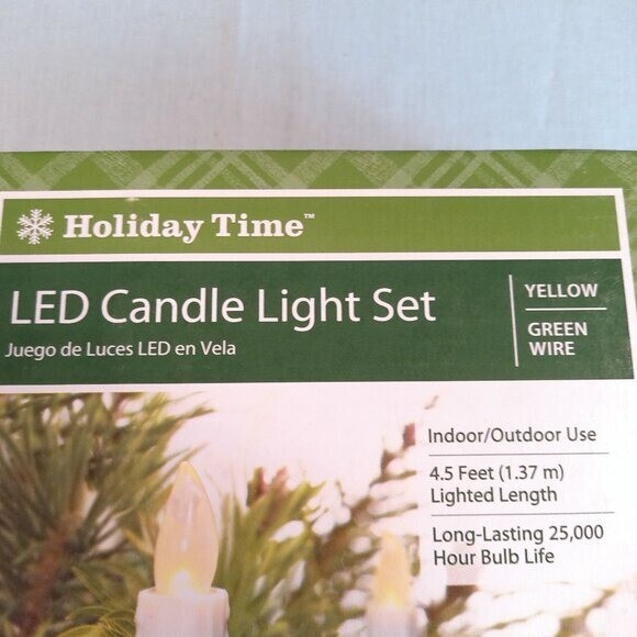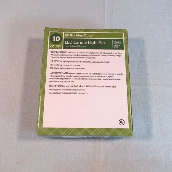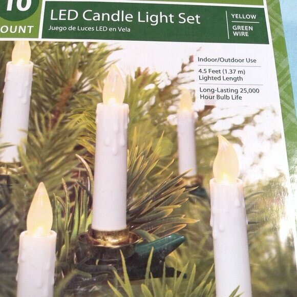 10 Count LED Candle Light Set Yellow Light With Green Wire Indoor and Outdoor Use 4.5 Ft(1.37m) Long -Lasting 25,000 Hour Bulb Life UL 120V 60 Hz AC 2.4 Watts(0.02 Amps) Sealed Box Unopened, New Year: 1990-2004