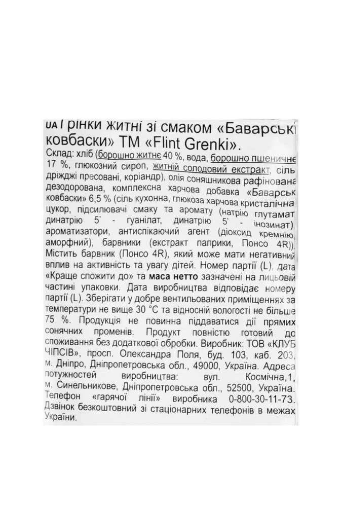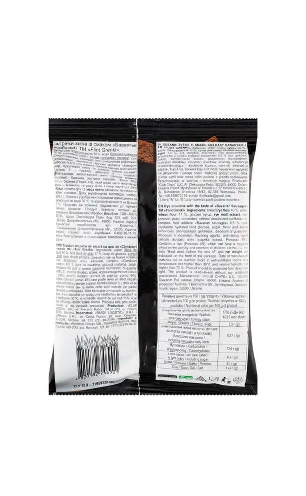 Flint rye croutons with "Bavarian sausages" flavor are a crispy and aromatic snack made on the basis of rye and wheat flour. They are roasted in refined deodorized sunflower oil, which provides their appetizing crunch. A complex food additive with the taste of "Bavarian sausages" gives croutons a rich meat aroma with spicy notes. These croutons are ideal as a quick appetizer to beer, an addition to soups (especially cream soups and gazpacho) or as a component for salads where a crispy element is needed. Thanks to the convenient 100 g package and moderate calorie content, they are a great choice for a snack on the go. Advantages Rich taste of "Bavarian sausages" - spicy and meaty aroma, ideal for drinks; Nutrient composition - made from rye and wheat flour; Crispy texture — thanks to roasting in refined sunflower oil; Convenient 100 g packaging - ideal for a quick snack; Versatility - suitable as a snack, as well as an addition to soups and salads. Storage and use Flint rye croutons should be stored in a dry, cool place at a temperature of up to +30°C. The product is completely ready for use and does not require additional processing. After opening the package, it is recommended to use the croutons as soon as possible so that they do not lose their crispy texture. Warehouse Bread (rye flour 40%, water, wheat flour 17%, glucose syrup, rye malt extract, salt, pressed yeast, coriander), refined deodorized sunflower oil, complex food additive "Bavarian sausages" 6.5% (table salt, crystalline glucose, sugar, flavor and aroma enhancers (sodium glutamate, disodium 5'-guanilate, disodium 5-inosinate), flavors, anti-caking agent (silicon dioxide, amorphous), dyes (paprika extract, Ponso 4R)) Fats 8.3 g/100 g Carbohydrates 72.6 g/100 g Squirrels 9.7 g/100g Calories kcal 403.9 kcal/100g Humidity Up to 75% Shelf life of goods 180 Storage temperature Up to +30 ºC * The US buyer doesn't need to pay any additional charges as the seller offers to ship this item with DDP. * Characteristics and equipment can be changed by the manufacturer * The color of the product may differ due to monitor settings * Packaging may differ from the picture * Free shipping to the US and Europe. * To other countries, additional shipping charges may apply. Please contact us for pricing.