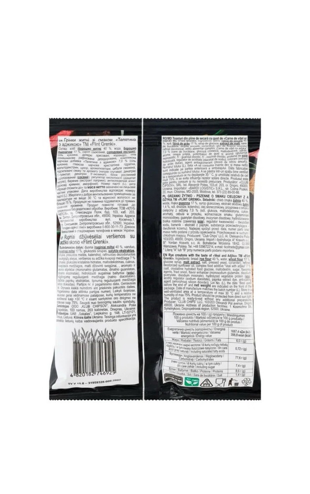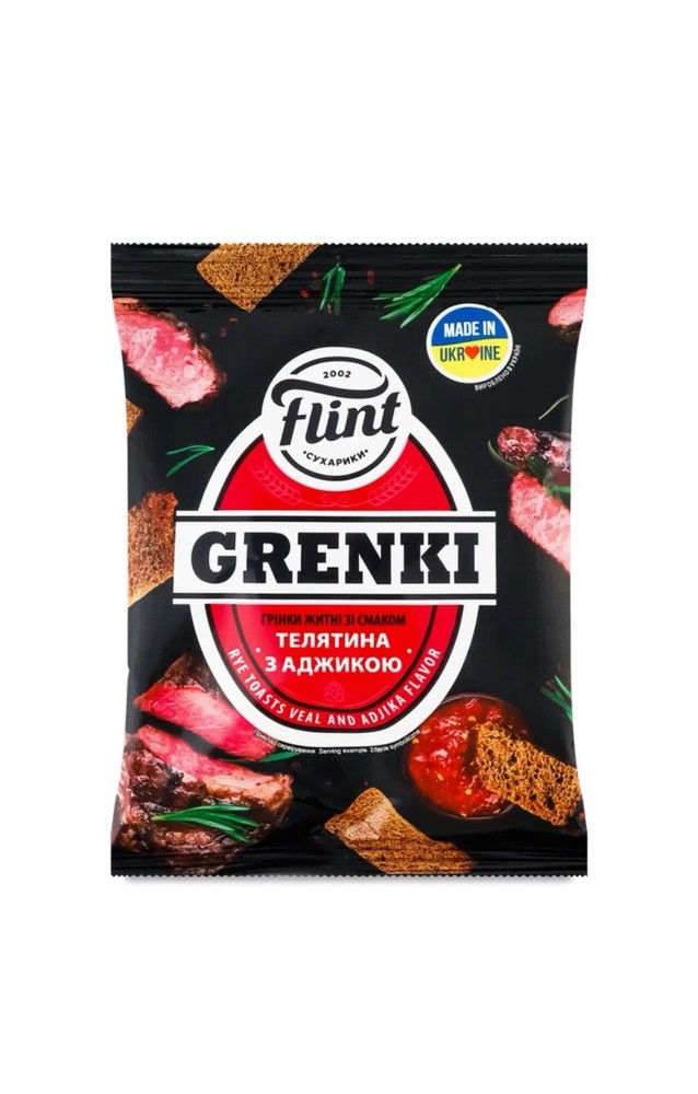 Flint rye croutons with veal flavor with adjika are a savory snack that combines the crispy texture of rye bread and a rich, meaty aroma with a slight spiciness. They are made on the basis of rye and wheat flour, thanks to which they have a dense and crispy structure. This flavor profile is ideal for connoisseurs of expressive, hearty snacks and traditional beer snacks. The Flint brand offers quality backed by an original recipe for baking rye bread. The bright taste of "Veal with Adjika" is achieved thanks to a complex food additive that includes beef powder, chili flavoring, basil and an acidity regulator. Advantages Rich and spicy taste - the combination of veal meat and the spiciness of adjika creates a rich taste experience; Real rye croutons - made on the basis of rye and wheat flour, which provides a special crispy texture; Versatility of use - suitable as an appetizer for beer, or as a crisp addition to soups and broths; Long shelf life of 180 days - preserves freshness thanks to reliable packaging. Recommendations for use / storage It is necessary to store croutons at a temperature of up to +30 °C and a relative humidity of no more than 75% in a well-ventilated place. After opening the package to preserve the crispy texture and taste, it is recommended to close the bag tightly and consume the croutons for a short time. Warehouse Bread (rye flour 70%, water, wheat flour 30%, molasses, malt extract, salt, pressed yeast, coriander), oil, complex food additive Veal with adjika 7% (maltodextrin, salt, powdered sugar, flavor and aroma enhancers (sodium glutamate 1-substituted, sodium 5-substituted sodium guanylate, sodium 5-substituted 5'-inosinate 2-substituted), whey, crystalline glucose, vegetable powder, veal flavoring, chili flavors, Bay leaf, basil, acidity regulator (citric acid), natural dye (paprika extract), additive that prevents caking and clumping (amorphous silicon dioxide), beef powder) Fats 6 g/100g Carbohydrates 77.6 g/100g Squirrels 8.6 g/100 g Calories kcal 398.8 kcal/100g Humidity 75 to, % Shelf life of goods 180 Storage temperature +30 to,ºC Storage conditions Store at temperatures up to + 30 ºC at a relative humidity of no more than 75% in a well-ventilated place * The US buyer doesn't need to pay any additional charges as the seller offers to ship this item with DDP. * Characteristics and equipment can be changed by the manufacturer * The color of the product may differ due to monitor settings * Packaging may differ from the picture * Free shipping to the US and Europe. * To other countries, additional shipping charges may apply. Please contact us for pricing.