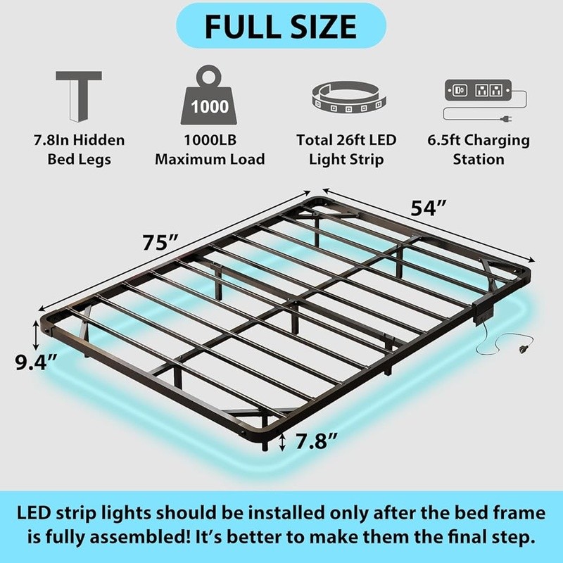 Little Debbie Christmas Tree Cake Scented Candle 3-Wick Soy Wax 45 Hr Burn New 23.85 USD Free shipping Cozy Electric Heating Blanket Faux Fur Soft Warm Throw Home Office Use 61.99 USD Free shipping 10 Piece Glass Mixing Bowls Set W/ Lids Food Storage Prep Serving Dish New 22.87 USD Free shipping Soft Heated Blanket Twin Sherpa Electric Auto Off 5 Heat Settings Comfortable US 53.89 USD Free shipping Electric Heated Blanket Soft Warm Auto-Off 5 Heat Settings Safe Eco-Friendly New 53.99 USD Free shipping Funny Inflatable Christmas Dog Peeing on Snowman W/ LED Lights Yard Decor New 57.89 USD Free shipping Wet Dog Food Chopped Ground Dinner Beef Canned Adult Nutrition 4 Pack 22oz Cans 17.5 USD Free shipping Professional Handheld Seed Spreader Bag Seeder 25lbs Capacity W/ Waterproof Bag 66.31 USD Free shipping Prismatic Iridescent Christmas Snowflake LED Decoration Kids Room Indoor New 33.88 USD Free shipping Adjustable Steel Closet Rod Multiuse Organizer Clothes Hangers Storage Solutions 20.86 USD Free shipping Organic Split Pea Soup Light Sodium Vegan Canned Soup 2 Pack Healthy Meal New 13.89 USD Free shipping 300ct Baby Wipes Light Fresh Chamomile Hypoallergenic Soft Thick Resealable New 13.06 USD Free shipping About this item MODERN FLOATING BED FRAME - This full size bed frame adopts modern technology floating effect design, reinforced main frame and hidden inner legs, which not only provides stable support but also create a sleek, space-enhancing illusion perfect for modern apartments, dorms, or bedrooms INTEGRATED CHARGING STATION - Stay connected with 2 AC power outlets and a 6-foot power cord ensure easy access to power for phones, tablets, and laptops right by your bedside without cluttering your floor with cords MULTI-MODE LED LITHES - The bed frame with RGB light strips can be adjusted at any time through the APP, providing a variety of colors, brightness and flashing modes. When playing music, the LED lights will also dance to the beat, ideal for nightlights, movie nights, or romantic settings HEAVY-DUTY METAL CONSTRUCTION - The bed frame is equipped with premium metal frame, which greatly improves the weight-bearing capacity up to 1000 lbs. The metal parts are firmly connected to prevent the bed frame from squeaking, providing you with a quiet sleeping environment EASY TO INSTALL & WORRY-FREE SUPPORT - The platform bed frame is easy to install and comes with clear instructions. You only need to follow the steps in the instructions to complete within 30 minutes! Whether it is unpacking or any problems during use, professional team is always ready to provide you with the satisfactory solution › Style: Modern Size: Full(U.S. Standard) Special Feature: easy to install Color: Black Frame Material: Metal You may also like Biometric Handgun Safe Compact Steel Fingerprint Lock Fast Access Security New 66.69 USD Free shipping Pajama Santa Decoration Antlers Tabletop Christmas Plush Bunny Reindeer Gifts US 45.35 USD Free shipping Insulated Stainless Steel Tumbler 24H Cold 6H Hot Ceramic Lined Spill Proof New 24.33 USD Free shipping Electric Grill Non Stick Bratwurst Cooker 1200W 5 Link Capacity Fast Cooking New 53.89 USD Free shipping Insulated Water Bottle Wide Mouth Flip Top Leak Proof Stainless Steel Outdoor US 32.63 USD Free shipping Shatterproof Multicolor Christmas Ornaments Set 50 Durable Holiday Decorations 35.18 USD Free shipping 6.5ft Pre-Lit White Christmas Tree Color Changing LED 250 Lights 600 Tips New 51.21 USD Free shipping Shatterproof Christmas Ball Ornament Garland 12ft Indoor Holiday Decor Red White 50.65 USD Free shipping Wooden Magnetic Advent Calendar Christmas Countdown W/ 24 Ornaments Kids Toy New 35.33 USD Free shipping Biodegradable Seeding Mulch W/ Fertilizer Grass Germination 38 lbs 760 sq ft New 51.33 USD Free shipping 1/2 Torque Wrench 40-300ft-lb High Precision Durable Chrome Vanadium Steel New 68.74 USD Free shipping Women's Hobo Bag Adjustable Strap Zipper Closure Spacious Organizer Pockets New 33.58 USD Free shipping