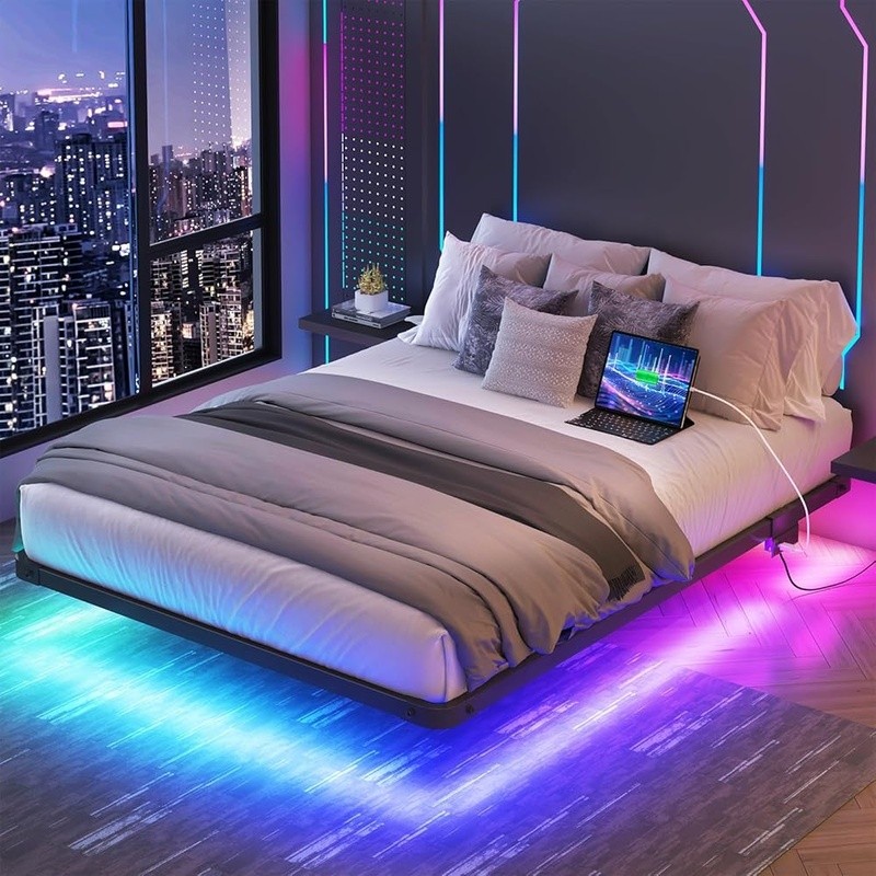 Floating Bed Frame W/ Charging Station LED Lights Heavy-Duty Easy Install New