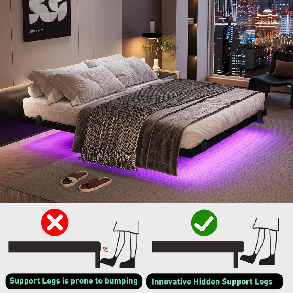 Store New Arrivals Add to Favorite View Feedback Contact Floating Bed Frame with LED Lights and Charging Station 14 Inch King Size Floating Description Included Components USB Size King Finish Type Painted MODERN FLOATING BED FRAME : The king size floating bed frame features an innovative hidden foot design, the legs are not visible from a normal standing view, combined with the three side light strips under the bed, bringing the impression that the bed floats above the ground, this king bed frame is the perfect part to create a modern, technology bedroom SMART LED LIGHTS : The king floating bed frame with colorful RGB lights, there are over 60,000 colors, you can also adjust the light change by APP or key control, you can set the music, voice, and timing modes for a personalized ambiance, to discover more wonderfully CONVENIENT CHARGING STATION: Keep your devices charged and within reach with the convenient charging station on the LED king size bed frame, it features 2 AC outlets, 1 USB port, and 1 Type-C port, making it easy to maintain an organized sleep space and stay connected without having to leave the bed STURDY AND NOISELESS: The king platform bed frame is crafted with durability in mind, featuring 11 stable metal slats and 9 thick legs for superior stability, the metal frame ensures long-lasting sturdiness, with tested connections to guarantee a secure and reliable sleeping experience, it is carefully engineered to distribute weight evenly, minimizing movement or wobbling ABOUT US We offer the best prices around on high quality products. Our E-store includes media such as books, movies, music and games while offering electronics, toys, sporting apparel, clothing, tools, general home, garden items and more. SHIPPING We are always working hard to ensure your package arrives as soon as possible. Please understand that some factors like weather, high postal traffic, and the performance of shipping companies are outside of our control. We offer free shipping to the lower 48 states and ship within 2 business days of payment, usually sooner. We do not accept P.O. Boxes. Please provide a physical address. For shipping outside of the continental USA, we only use eBay's Global Shipping Program.The item is shipped to KY and then sent to the rest of the world. International customers are responsible for all duties and taxes. Continue to check out in order to calculate costs for shipping the item to your country. Messages regarding eBay's Global Shipping Program MUST be directed at eBay EXCLUSIVELY. RETURNS We offer a 30-Day Return Policy on items which you are not completely satisfied with. You have the option for a full-refund or an exchange of the item. No returns are available on items shipped outside of the USA. PAYMENT We accept PayPal. CONTACT US This page content is yet to come Please ad us to your favorite seller and visit again later Thank You CUSTOMER SATISFACTION We try our very best to make sure every customer is completely satisfied. If there's a problem, message us! We're happy to help.