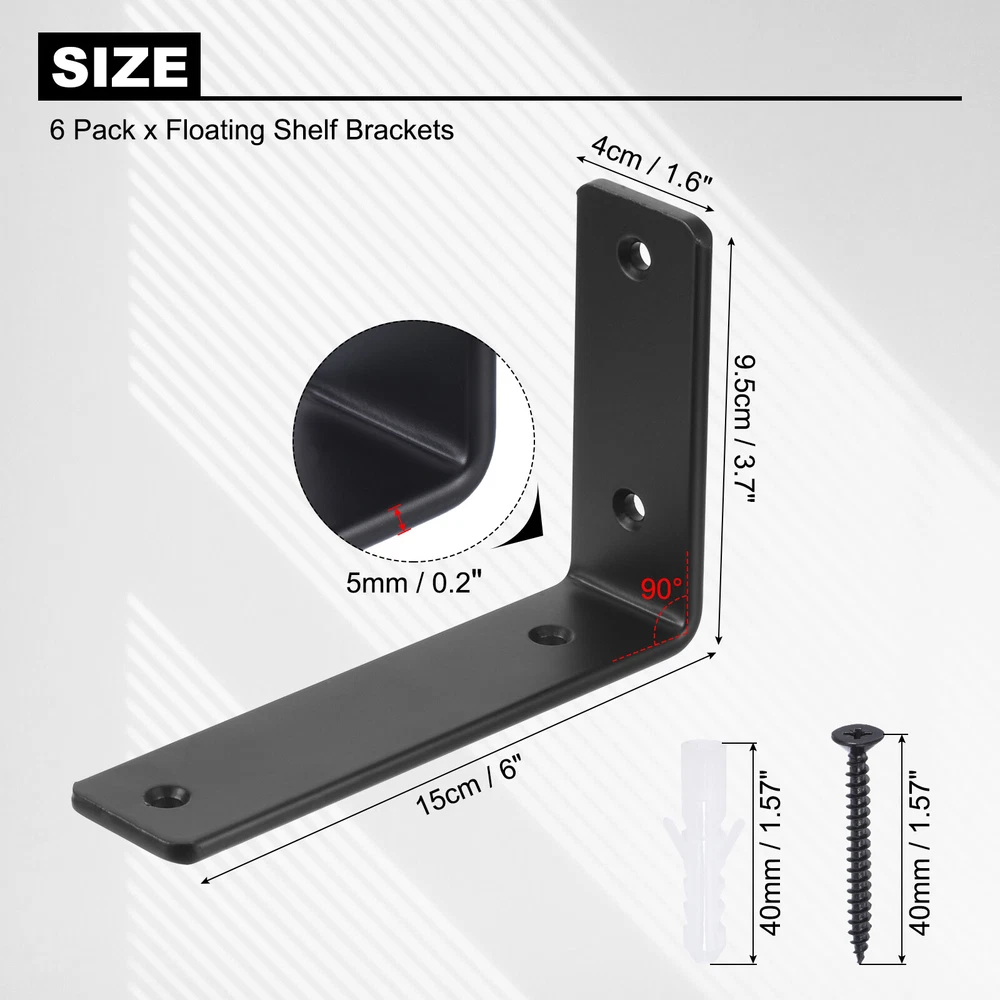 Document It is very suitable for DIY kitchen storage racks, bathroom racks, garden shelves, living room shelves, book shelves, office shelves to save space at home.SpecificationMaterial: ironColor: BlackSize: 9.5cm x 4cm x 15cm/3.7"L x 1.6"W x 5.9"HPackage Included: 1 Set x Floating Shelf BracketsAdvantage:Our shelf support brackets are made of carbon steel with a powder coat finish, corrosion resistant and rust resistant, ensuring long service life.90-degree bending, triangle welding, with a very stable support structure, can support a load of up to 35 lbs when fixed on brick or concrete walls.Each bracket has small holes for easy installation, fitting screws are included. Ensure a sturdy hold for your floating wall shelves.The metal base can be blocked by the plank, concealing them between the wall and the shelf, creating an amazing floating appearance.We suggest you choose stainless steel material rather than iron when in contact with human and food, such as bathrooms, kitchen, etc.Note: Please allow 1-2 mm differences due to manual measurement. Due to the difference between different monitors, picture may not reflect the actual color of the item Floating Shelf Brackets 6 Inch, 6 Pack Iron L Shelf Brackets Supports, Black It is very suitable for DIY kitchen storage racks, bathroom racks, garden shelves, living room shelves, book shelves, office shelves to save space at home. Specification Material: iron Color: Black Size: 9.5cm x 4cm x 15cm/3.7"L x 1.6"W x 5.9"H Package Included: 1 Set x Floating Shelf Brackets Advantage : Our shelf support brackets are made of carbon steel with a powder coat finish, corrosion resistant and rust resistant, ensuring long service life. 90-degree bending, triangle welding, with a very stable support structure, can support a load of up to 35 lbs when fixed on brick or concrete walls. Each bracket has small holes for easy installation, fitting screws are included. Ensure a sturdy hold for your floating wall shelves. The metal base can be blocked by the plank, concealing them between the wall and the shelf, creating an amazing floating appearance. We suggest you choose stainless steel material rather than iron when in contact with human and food, such as bathrooms, kitchen, etc. Note: Please allow 1-2 mm differences due to manual measurement. Due to the difference between different monitors, picture may not reflect the actual color of the item Hot Item Payment 1.We accept eBay payment . 2.Payment must be received within 7 business days of auction closing. Shipping 1.We ship to your eBay or Paypal address. Please make sure your eBay and Paypal address is correct before you pay. 2.Items will be shipped within 1-3 business day when we received payment. 3.Delivery time depends on destination and other factors. Description Policy Floating Shelf Brackets 6 Inch, 6 Pack Iron L Shelf Brackets Supports, Black It is very suitable for DIY kitchen storage racks, bathroom racks, garden shelves, living room shelves, book shelves, office shelves to save space at home. Specification Material: iron Color: Black Size: 9.5cm x 4cm x 15cm/3.7"L x 1.6"W x 5.9"H Package Included: 1 Set x Floating Shelf Brackets Advantage : Our shelf support brackets are made of carbon steel with a powder coat finish, corrosion resistant and rust resistant, ensuring long service life. 90-degree bending, triangle welding, with a very stable support structure, can support a load of up to 35 lbs when fixed on brick or concrete walls. Each bracket has small holes for easy installation, fitting screws are included. Ensure a sturdy hold for your floating wall shelves. The metal base can be blocked by the plank, concealing them between the wall and the shelf, creating an amazing floating appearance. We suggest you choose stainless steel material rather than iron when in contact with human and food, such as bathrooms, kitchen, etc. Note: Please allow 1-2 mm differences due to manual measurement. Due to the difference between different monitors, picture may not reflect the actual color of the item Hot Item Payment 1.We accept eBay payment . 2.Payment must be received within 7 business days of auction closing. Shipping 1.We ship to your eBay or Paypal address. Please make sure your eBay and Paypal address is correct before you pay. 2.Items will be shipped within 1-3 business day when we received payment. 3.Delivery time depends on destination and other factors.