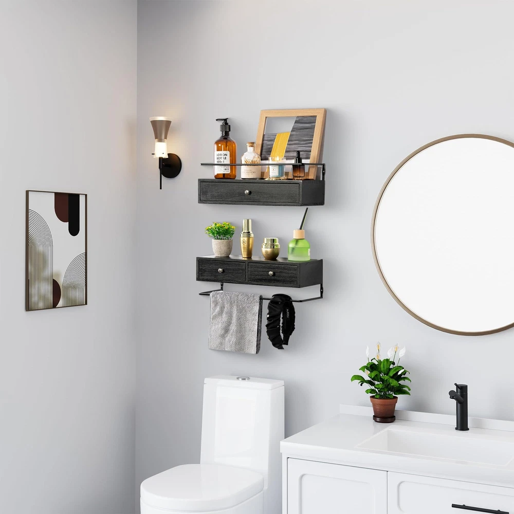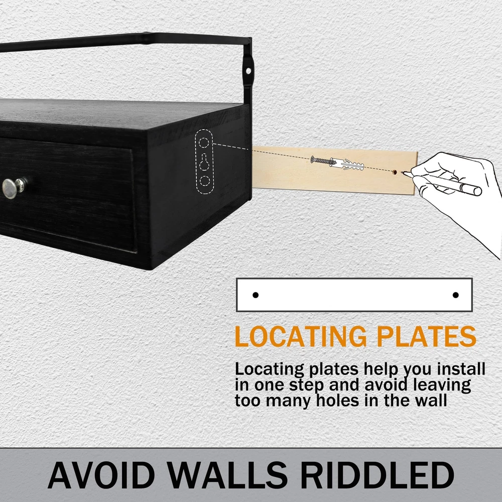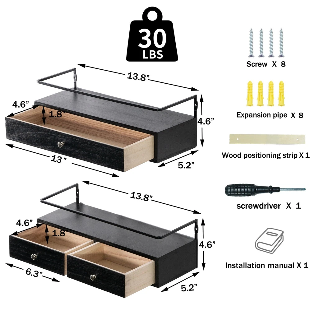 【Rustic Floating Shelves with Drawer】Made of real solid wood and metal, each board retains its natural grain and color, the industrial look is simple and modern, and has applied for a design patent. Make use of the vertical space on the wall, not only increase storage space but also add decoration and beauty. Take this new design shelf back to decorate your home 【Suitable for All Occasions】 In the bathroom, the bathroom shelf can hold skincare items such as shampoo, conditioner, shower , lotions, and perfumes. In the kitchen, the wall shelf can be used to put spice and seasoning bottles. It also can be used in the dining room, bedroom, living room, and office 【Sturdy and Durable】Structure innovation is designed by our experienced designers, with good load-bearing capacity, sturdy enough to hold up to 30 lbs. The protective bar is a plus preventing anything from falling off, it can also be used to hang towels, hair hoops, headphones and other daily items 【Easy to Install】As shown in the picture, there are ways to install the floating shelves. The package include 1 clear installation manual. It only takes a few minutes to the instructions and complete the mounting, then you can create your own storage for wall 【High Quality】They are awesome wall shelves to making them perfect gifts to your family or friends. We always prioritize the needs of our users, and will improve the product based on the issues and suggestions raised by customers. Each shelf is handmade, so please rest assured to use it