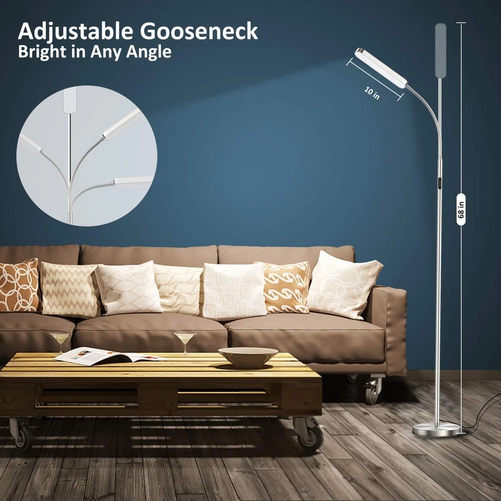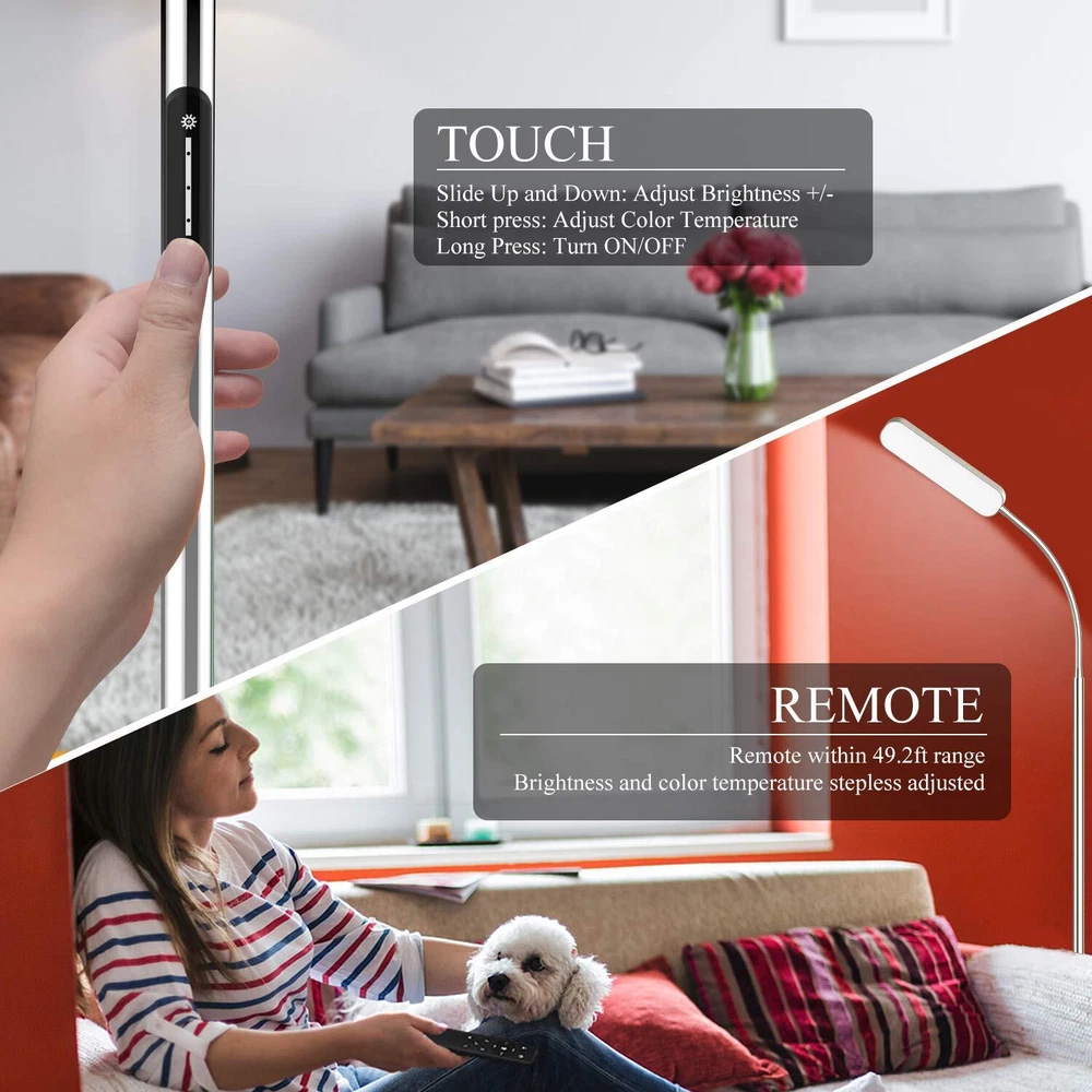 Remote Control; adjust brightness and color temperature steplessly with the remote control from up to 49.2 feet away; customize the lighting mode to suit different environments; the remote includes 6 scenes that can be activated with a single click Touch control; stepless adjust the brightness from 5% to 100% and there are 4 color temperatures that can be adjusted 3000k, 4000k, 5000k, 6000k; upgrade to the superior touch, better feel, better control Bright and Soft Light: Powered by a 15W LED, this lamp generates 1000 lumens, making it ideal for reading in the living room or bedroom, with a lifespan of up to 50,000 hours, it has soft natural light without flicker Memory and Timer Functions; the lamp features a memory function that recalls your last brightness and color settings, along with a timer to help you feel secure and fall asleep easily Flexible gooseneck; the 360-degree adjustable gooseneck can direct the light to the position you need; the gooseneck can be easy bent and will maintain its position after bending
